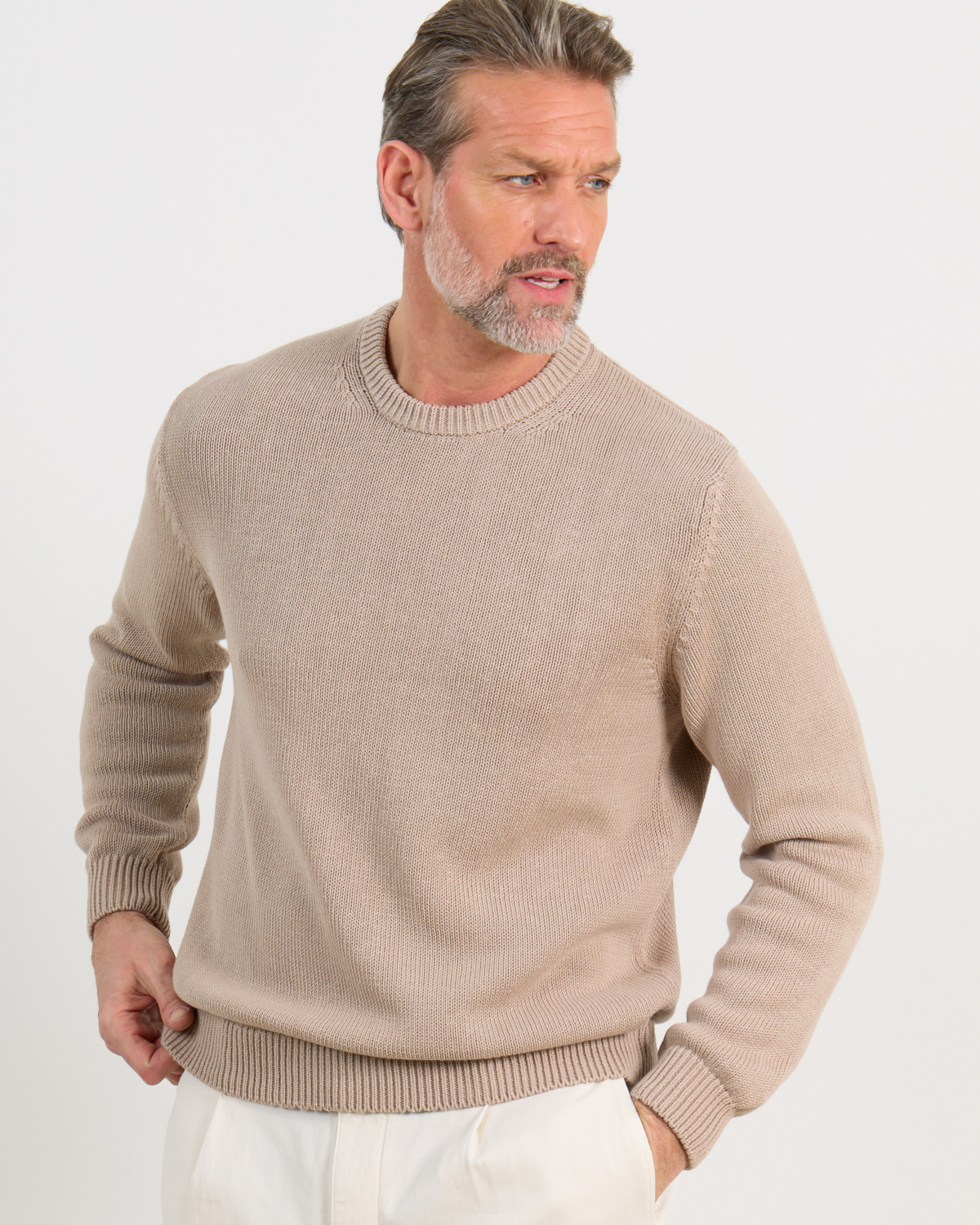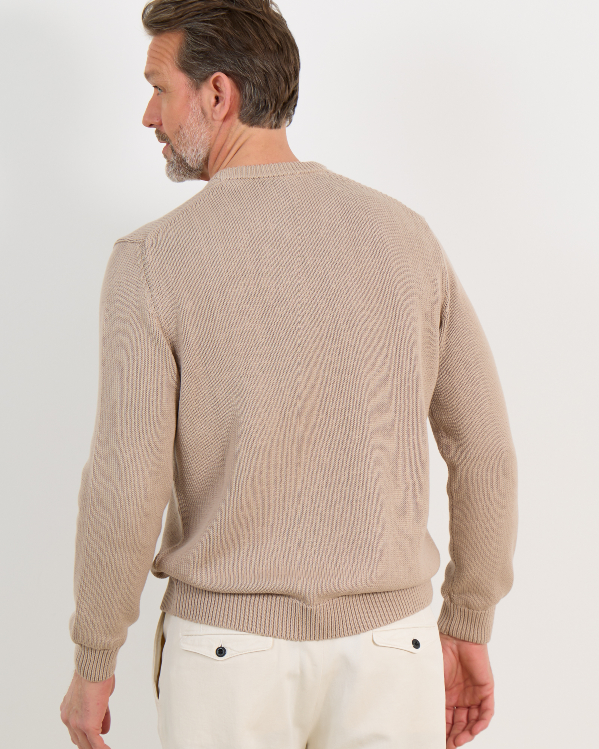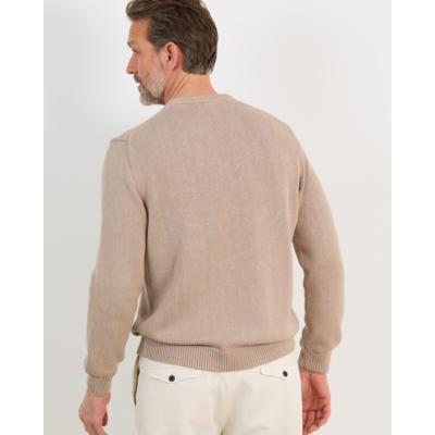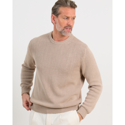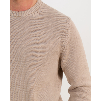 Deze zandkleurige pullover combineert klassiek design met modern draagcomfort. De ronde hals en lange mouwen zorgen voor een tijdloze uitstraling, terwijl de fijngebreide structuur een verfijnde textuur toevoegt. De geribde afwerking aan hals, mouwen en zoom geeft het kledingstuk een verzorgde finish. Het zachte breisel voelt comfortabel aan en beweegt soepel mee door de dag.