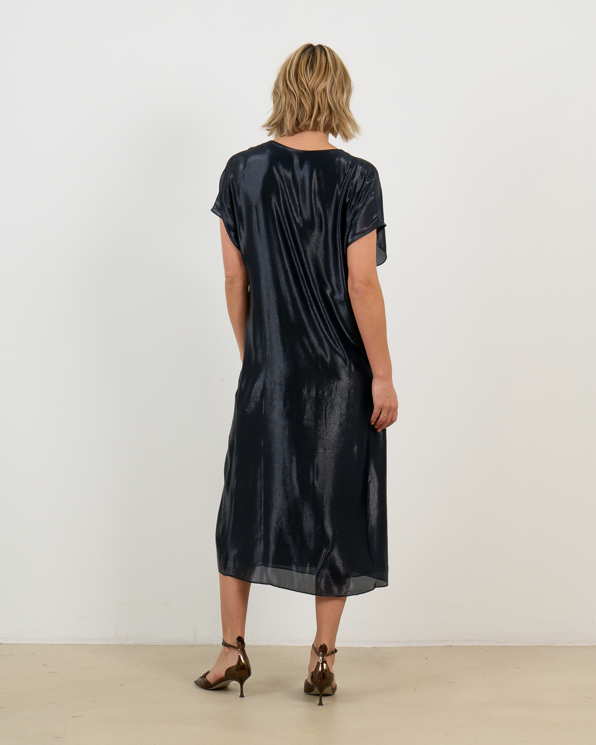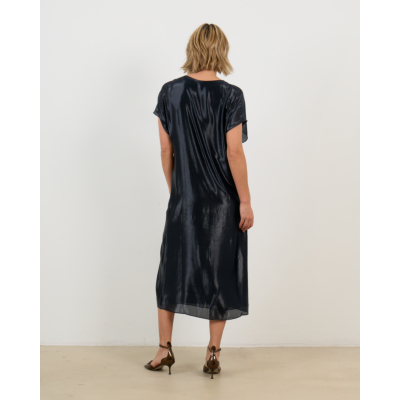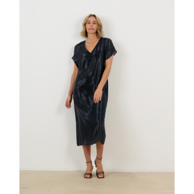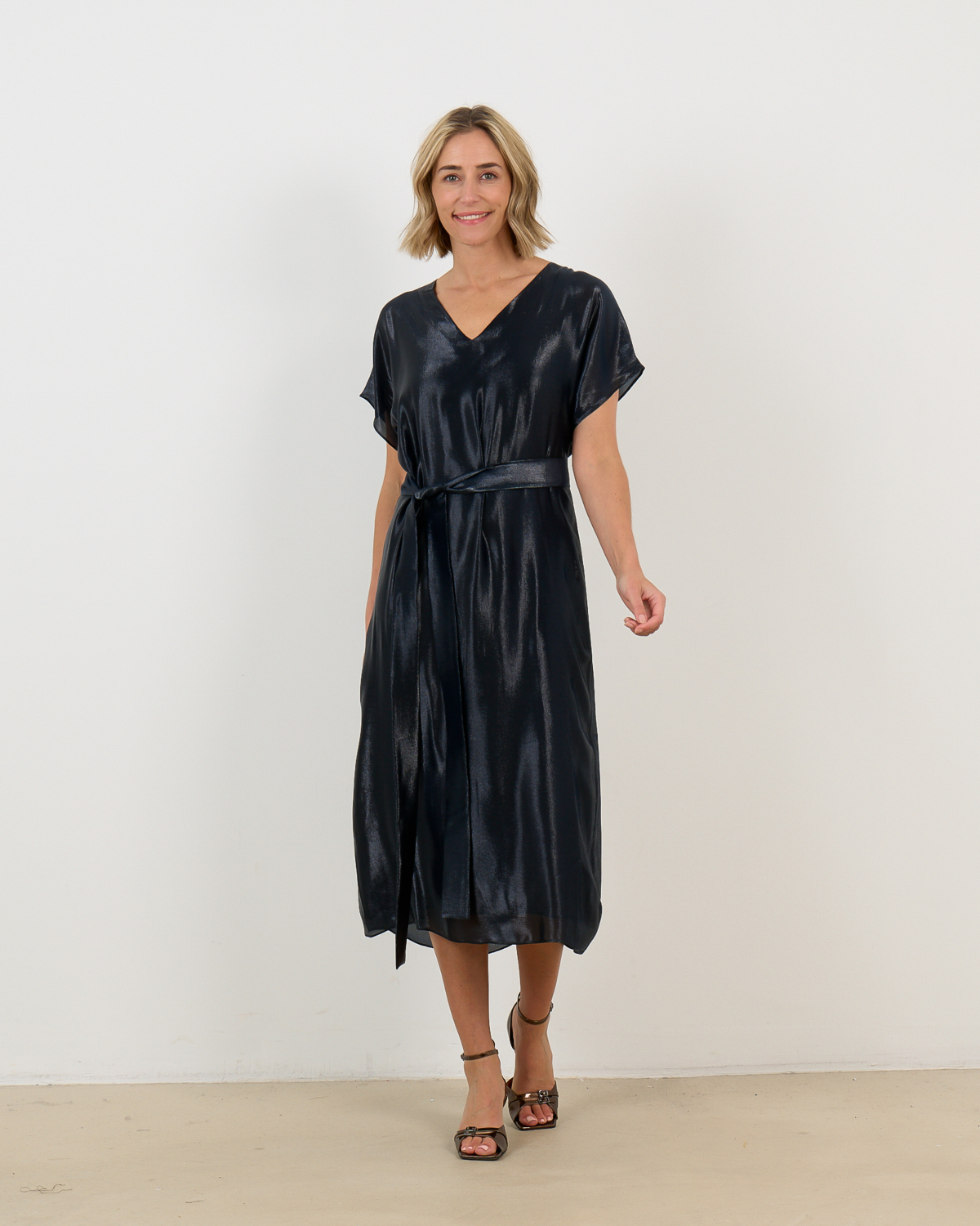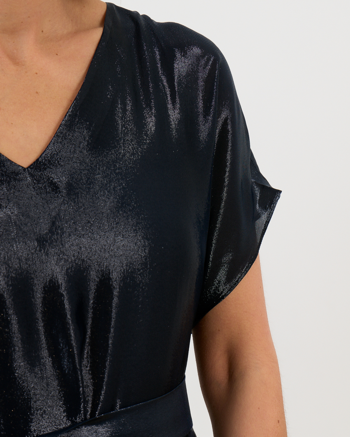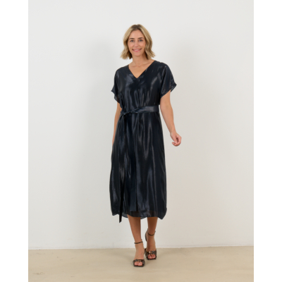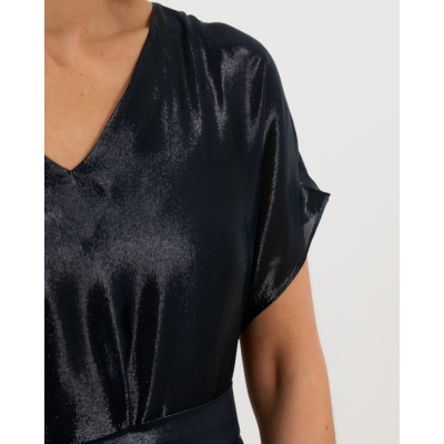 Deze elegante zwarte jurk straalt verfijnde glamour uit met zijn subtiele glitterafwerking. Het zijde-polyester mengsel (64% zijde, 36% polyester) zorgt voor een luxueuze uitstraling en comfortabele draagervaring. De V-hals en korte mouwen geven het ontwerp een moderne twist, terwijl de losvallende pasvorm zorgt voor een elegante silhouet. De jurk valt tot net onder de knie en heeft een stijlvolle ceintuur die je figuur mooi accentueert.