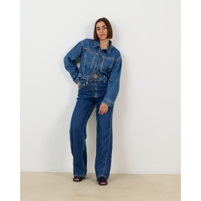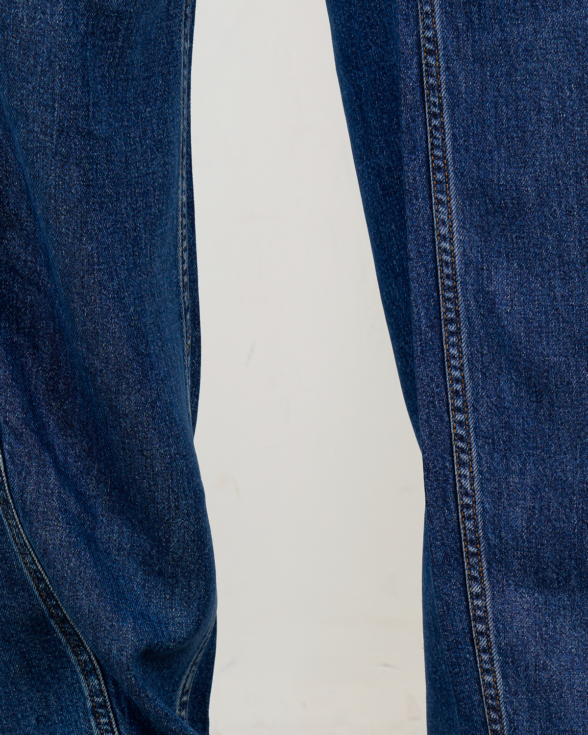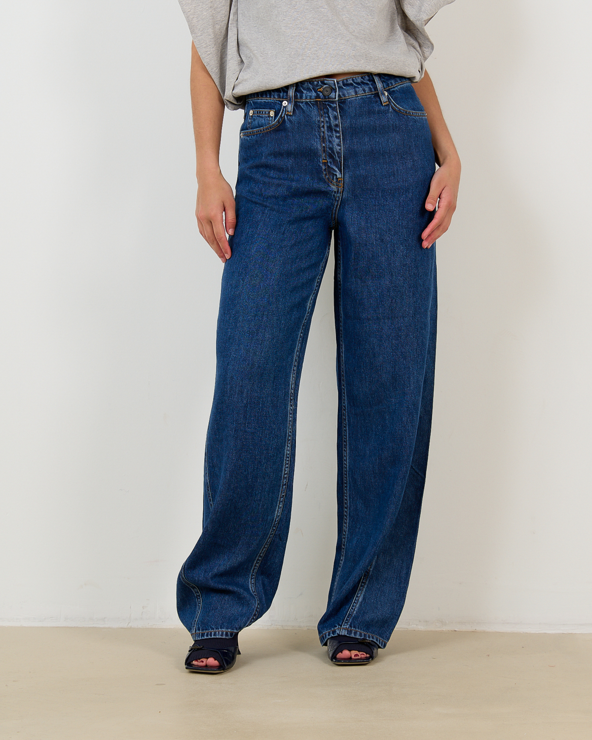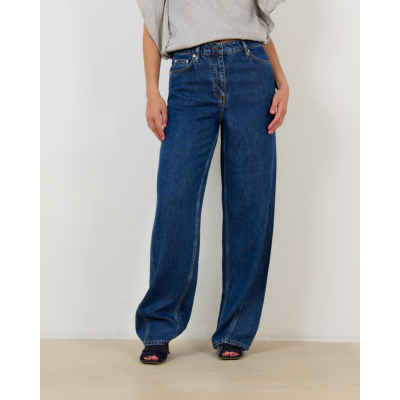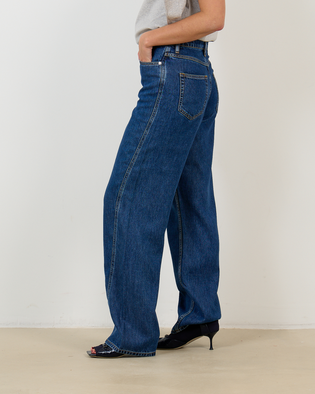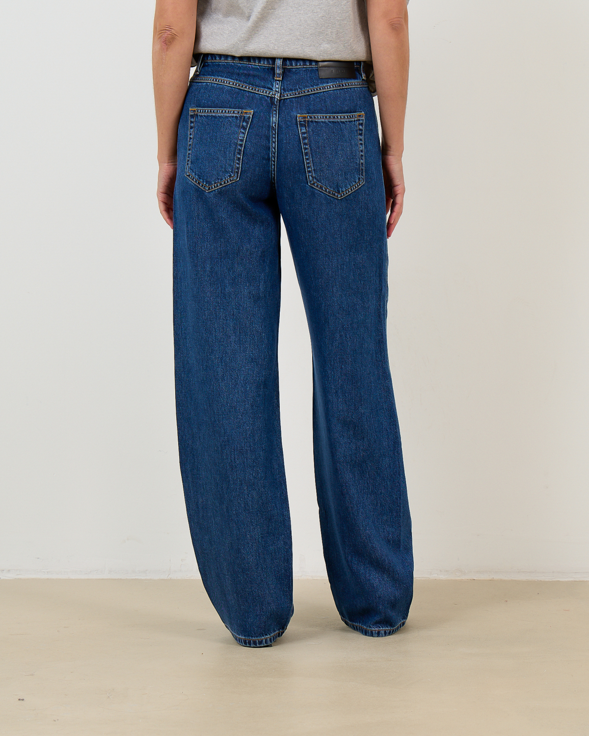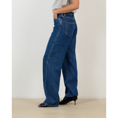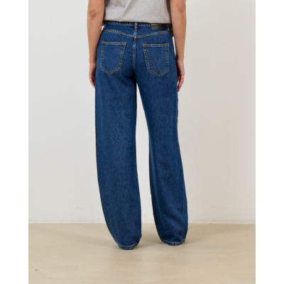 Deze donkerblauwe damesjeans combineert klassiek design met moderne elementen. De regular fit zorgt voor comfort en een flatteuzere silhouet. De brede pijpen creëren een ontspannen uitstraling. Het 100% tencel materiaal biedt natuurlijke zachtheid en ademend draagcomfort. Praktische steekzakken voor en klassieke achterzakken maken de jeans functioneel. De knoopsluiting en contrasterende stiknaden geven een authentieke denim-look.