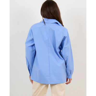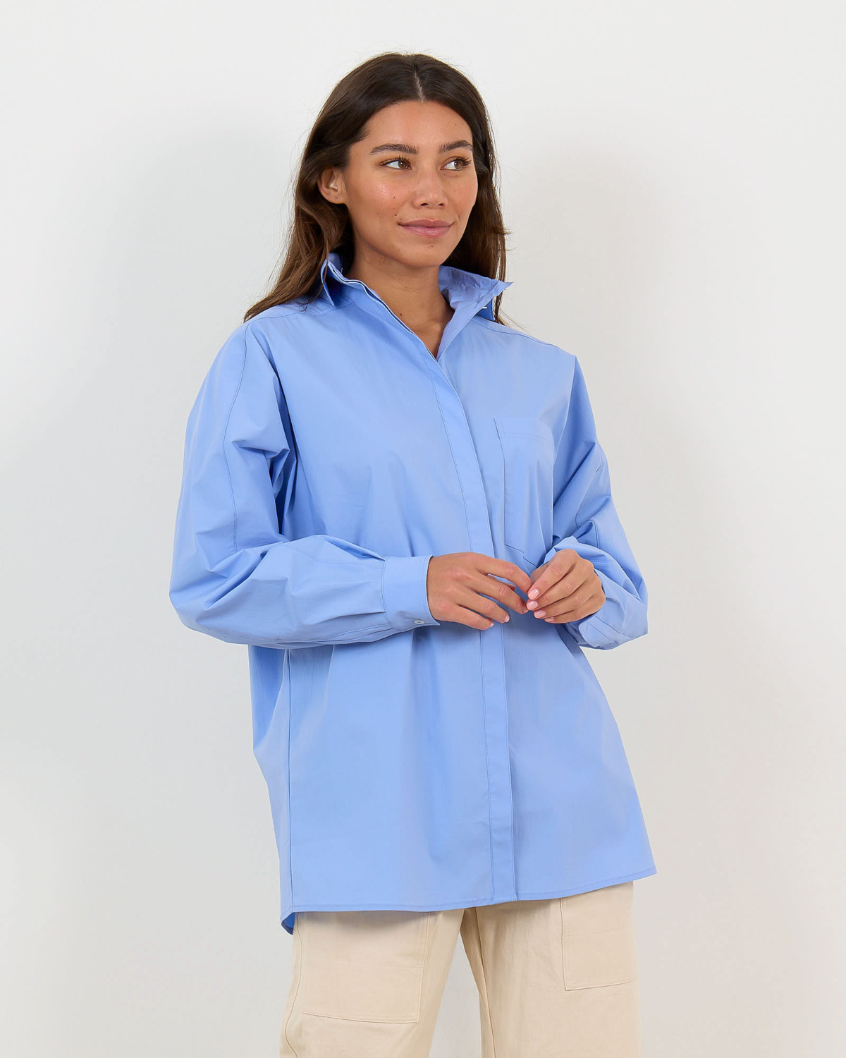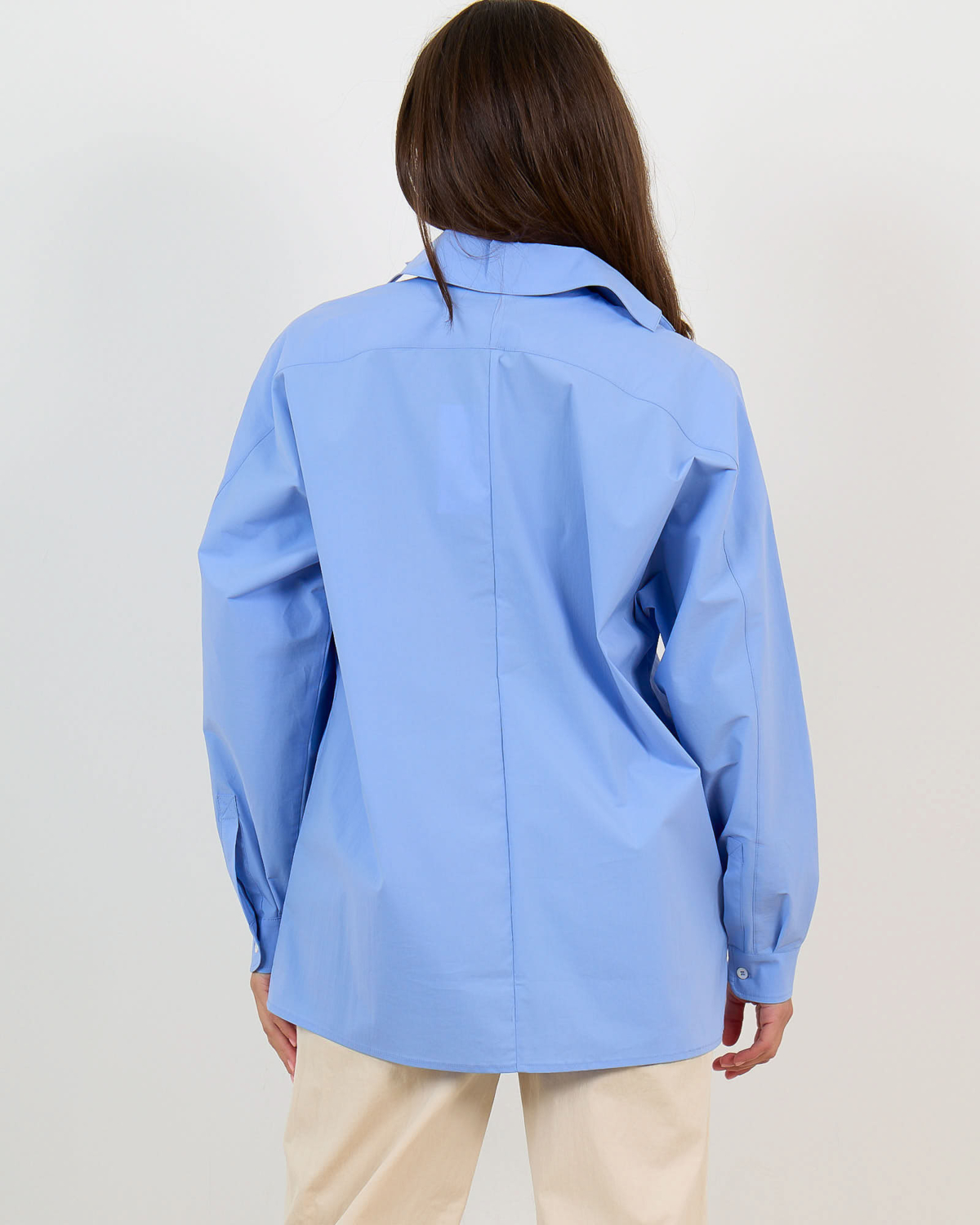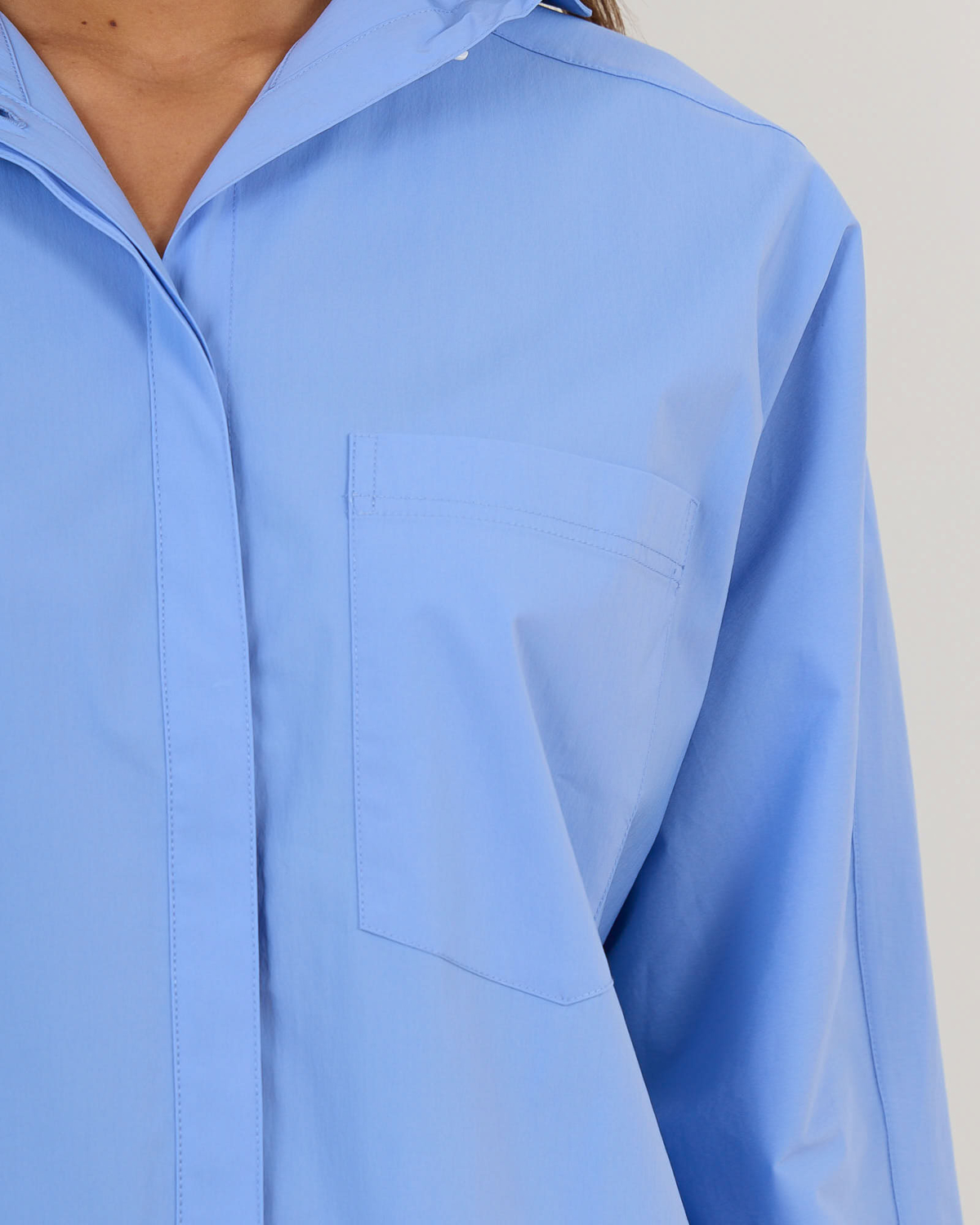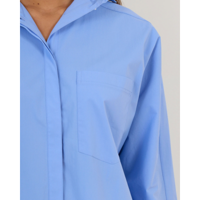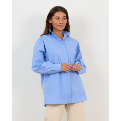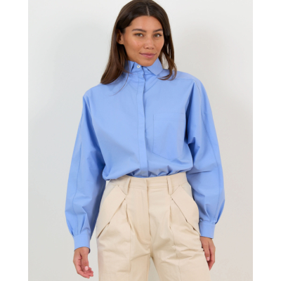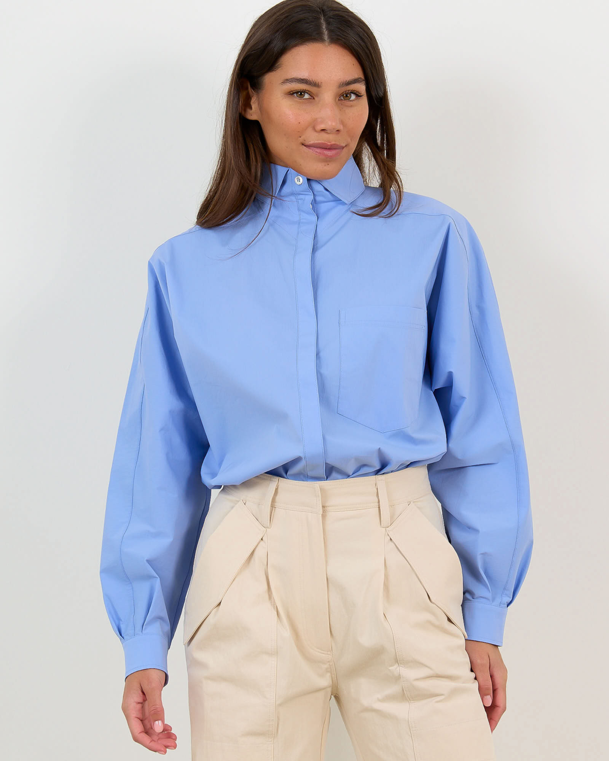 Deze elegante blouse in azuurblauw toont de verfijnde kwaliteit van katoen, polyester en elastaan (52/42/6%). De karakteristieke sailor collar en losvallende pasvorm creëren een moderne, ontspannen silhouet. Lange mouwen met knoopsluiting aan de pols en een klassieke borstzak completeren het tijdloze ontwerp. De rijke blauwtint straalt verfijning uit en de zachte stofmix zorgt voor bewegingsvrijheid en comfort.