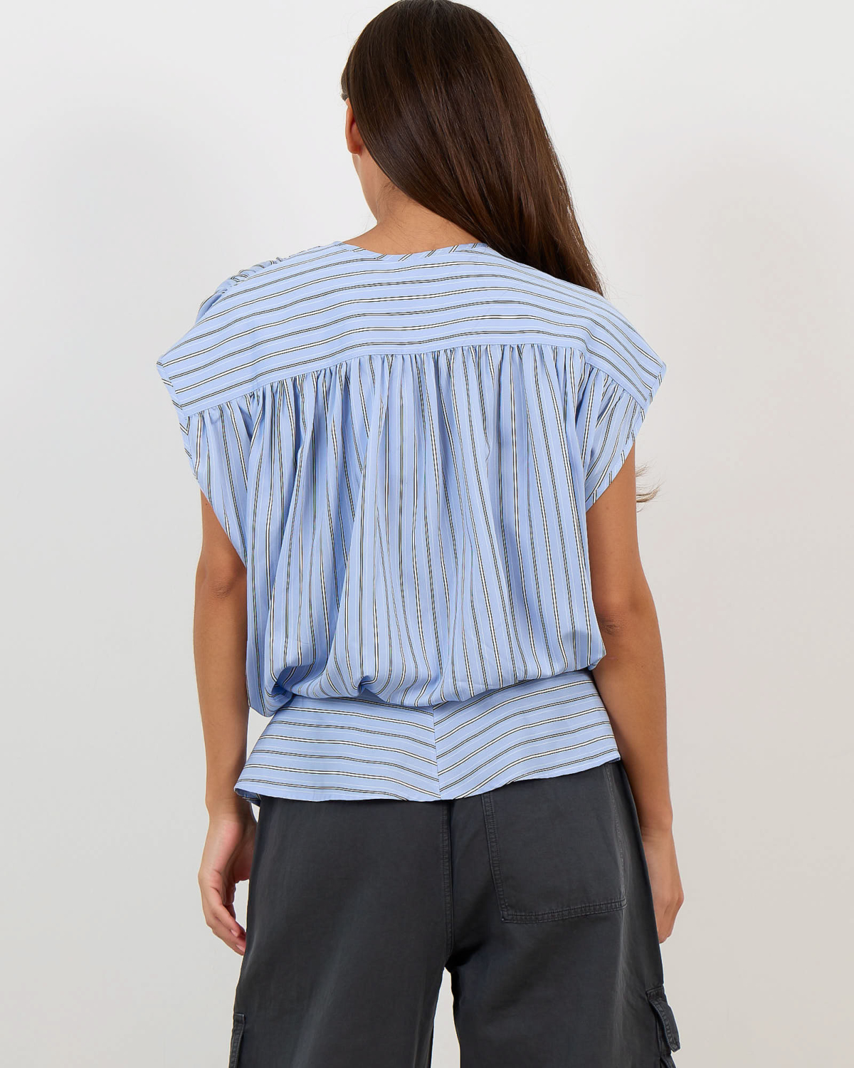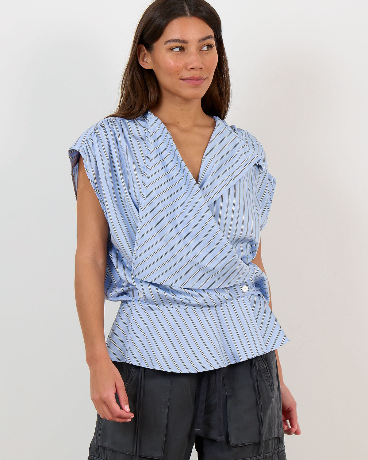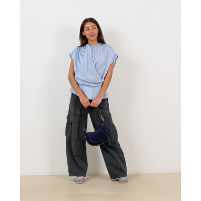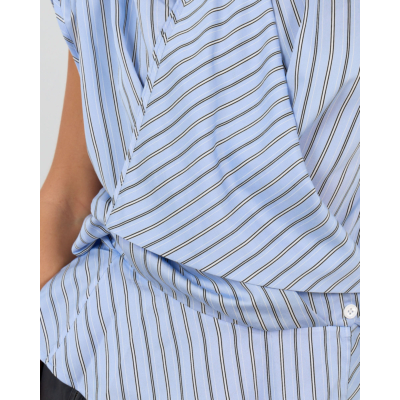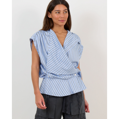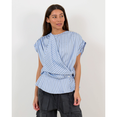 Deze opvallende blauwe top valt op door zijn asymmetrische wikkelstijl met verfijnde strepenprint in wit en donkerblauw. De korte mouwen en ronde halslijn zorgen voor een moderne uitstraling, terwijl het zijdelingse knoopdetail een speelse twist toevoegt. Vervaardigd uit een soepele viscose-nylon blend (88% viscose, 12% nylon) die comfortabel draagt en mooi valt. De regular fit flatteert verschillende figuren en de geraffineerde achterzijde met geplooide details maakt deze top extra bijzonder.