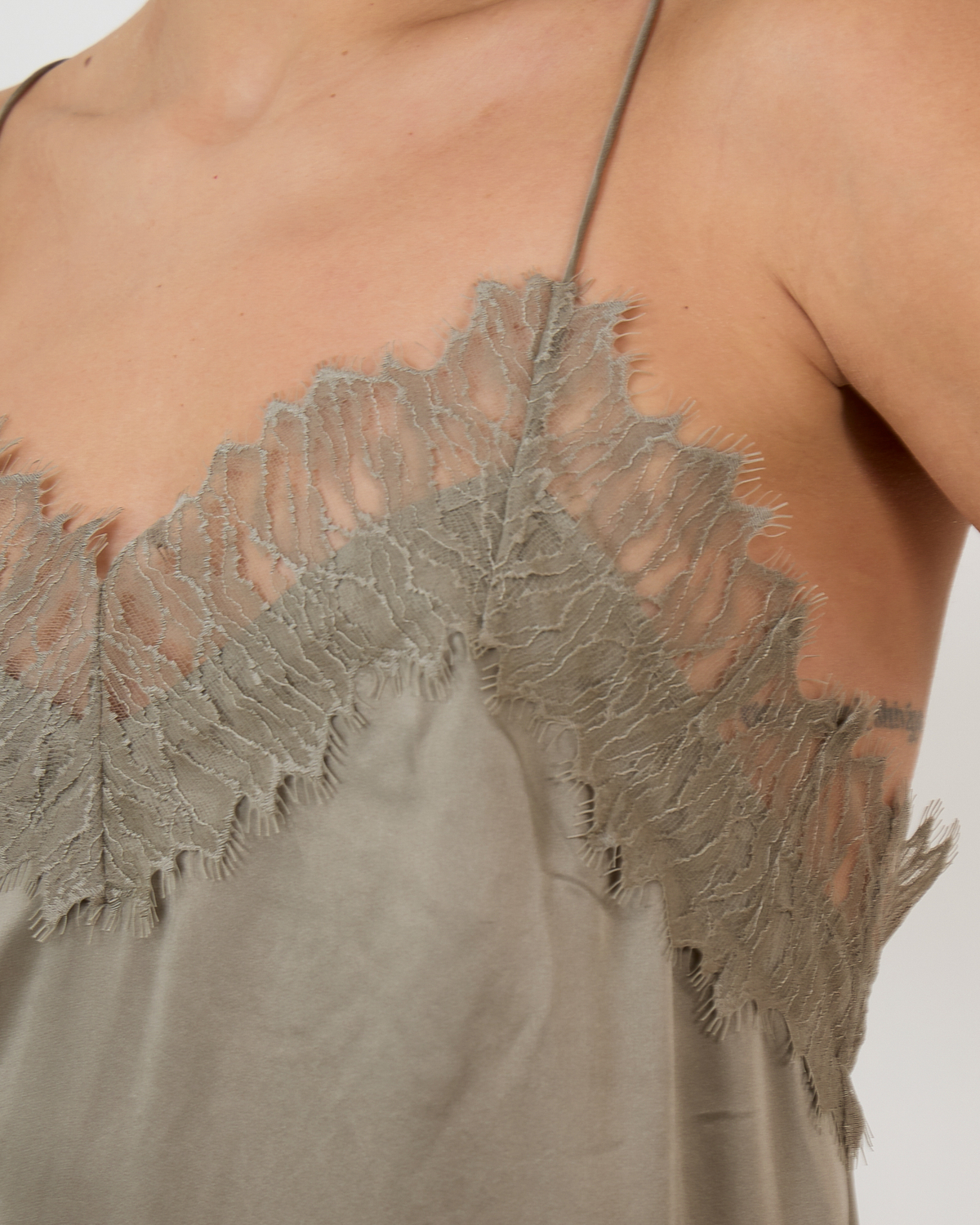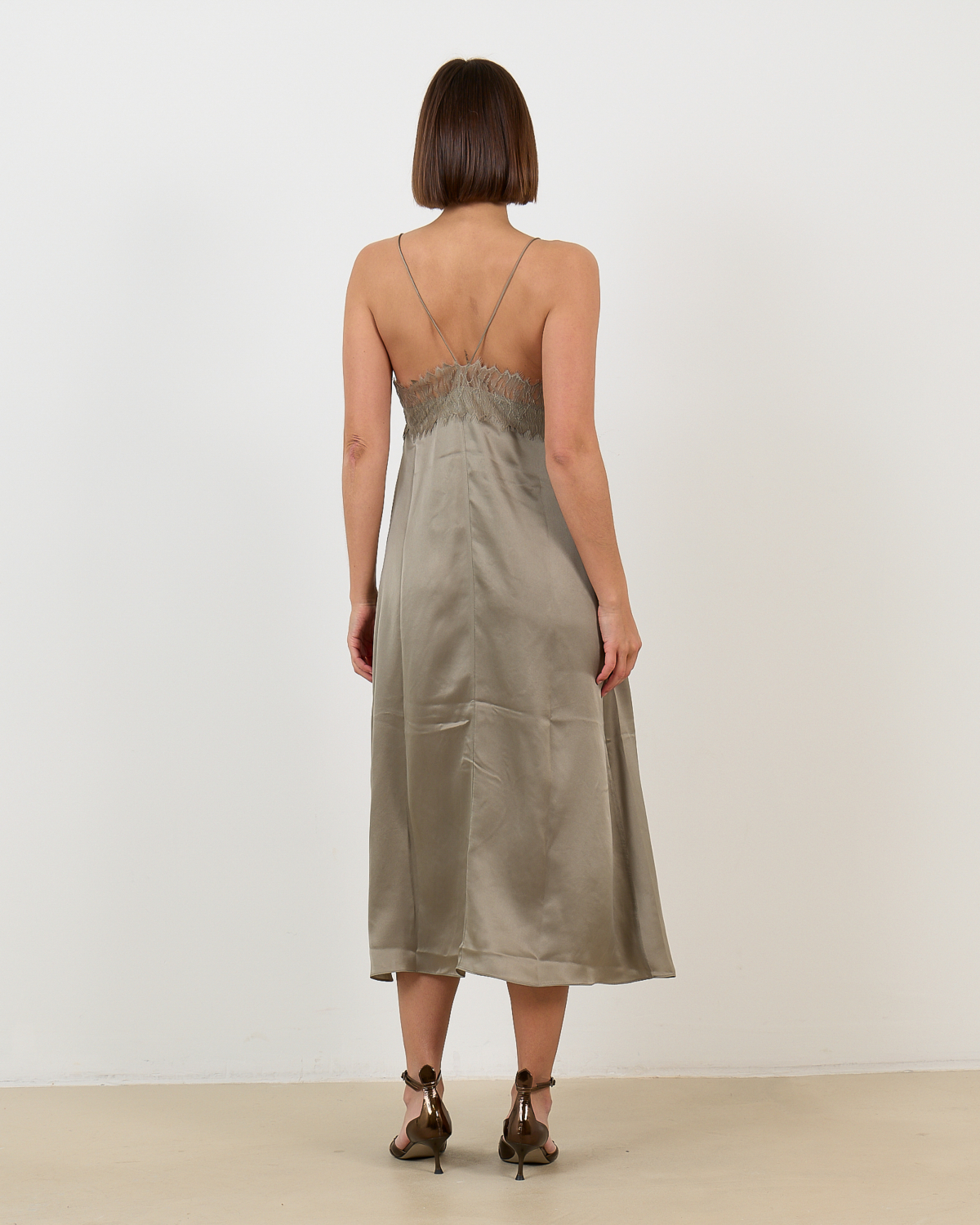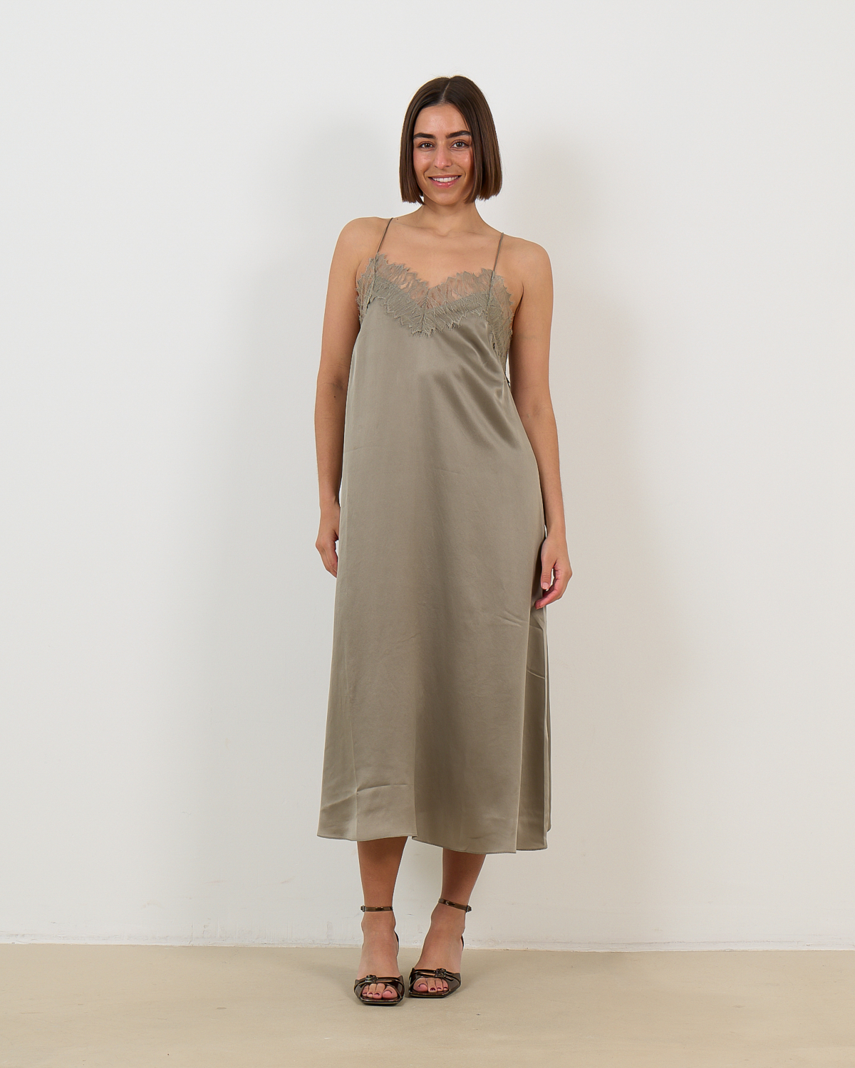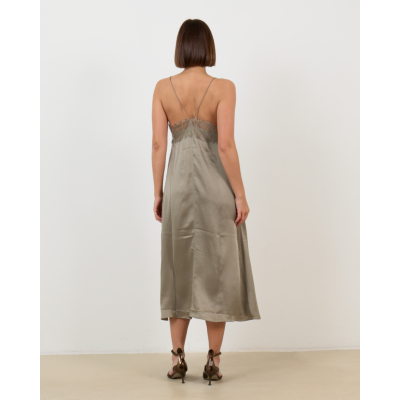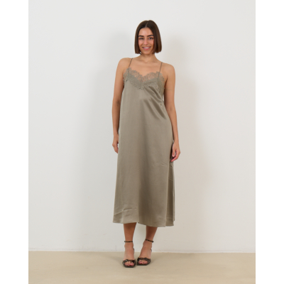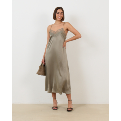 Deze elegante slip dress in olijfgroen straalt verfijnde luxe uit. Het 100% zijden materiaal zorgt voor een prachtige val en ultiem draagcomfort. De relaxed-fit pasvorm valt soepel langs je lichaam, terwijl de delicate kant aan de buste en rug een romantische touch toevoegt. De spaghettibandjes en midi-lengte geven de jurk een modern en vrouwelijk karakter.