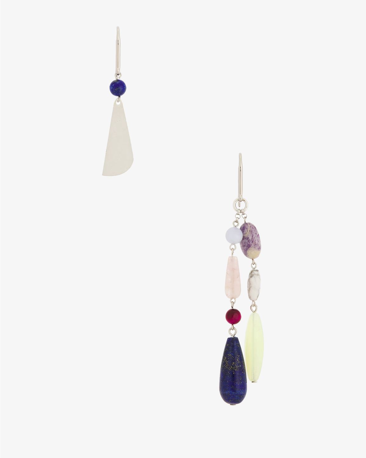 Deze prachtige asymmetrische oorbellen combineren speelse kleuren met elegante vormen. De linker oorhanger toont een strakke druppelvorm in zilverkleurig brass, geaccentueerd met een donkerblauwe steen. De rechter oorhanger vormt een kunstzinnige cascade van meerdere natuurstenen in verschillende tinten: van roze en paars tot donkerblauw en geel-groen. Het brass materiaal (70%) gecombineerd met natuursteen (30%) zorgt voor duurzame kwaliteit. De fijne haakjes sluiten comfortabel af.