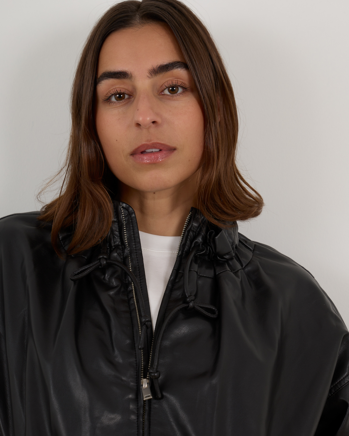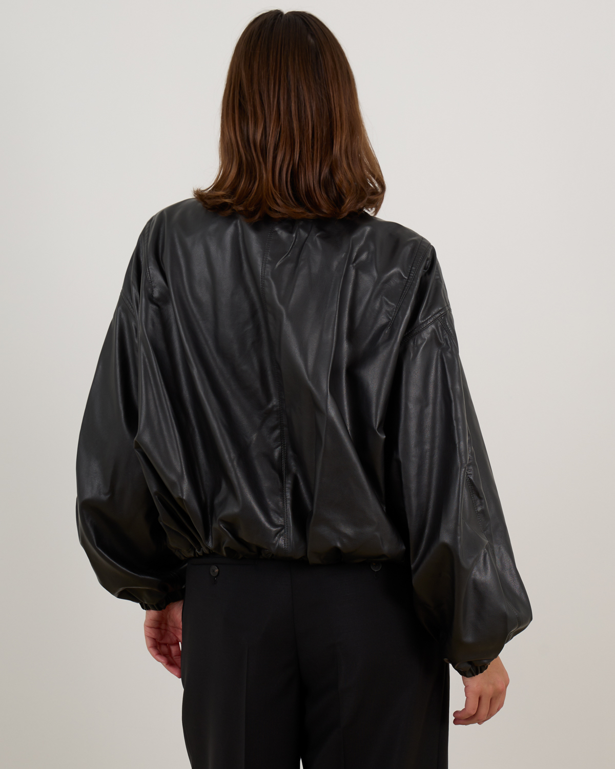 Deze zwarte faux leren jack in regular fit straalt stoere elegantie uit. Vervaardigd van 100% polyurethaan biedt het materiaal een luxueuze leren uitstraling. De opvallende trekkoord details langs de kraag en rits creëren een speelse twist op het klassieke bomberjack silhouet. De lange mouwen met elastische boordjes en de ritssluiting aan de voorkant maken deze jack functioneel en stijlvol tegelijk.