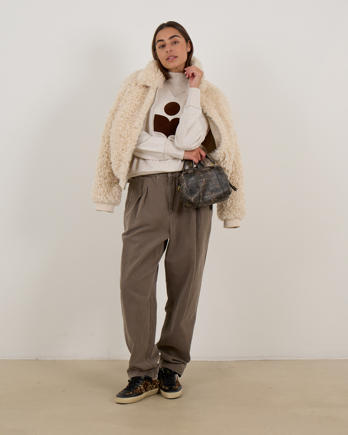 Deze Tayma teddy jas combineert prachtig met high-waisted jeans en leren laarzen voor een casual-chic look. Draag 'm over een strakke coltrui met een midi rok en sneakers voor een moderne streetwear stijl. De neutrale crèmekleur van dit Marant Étoile item past perfect bij aardse tinten zoals camel en khaki.