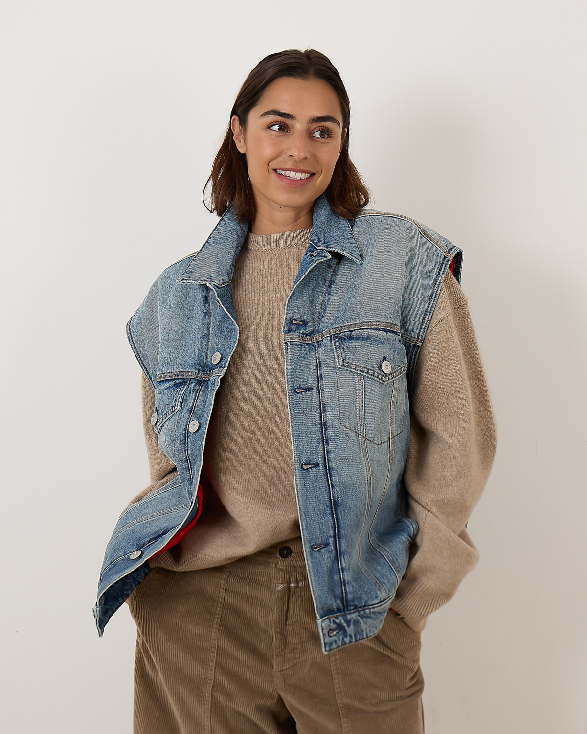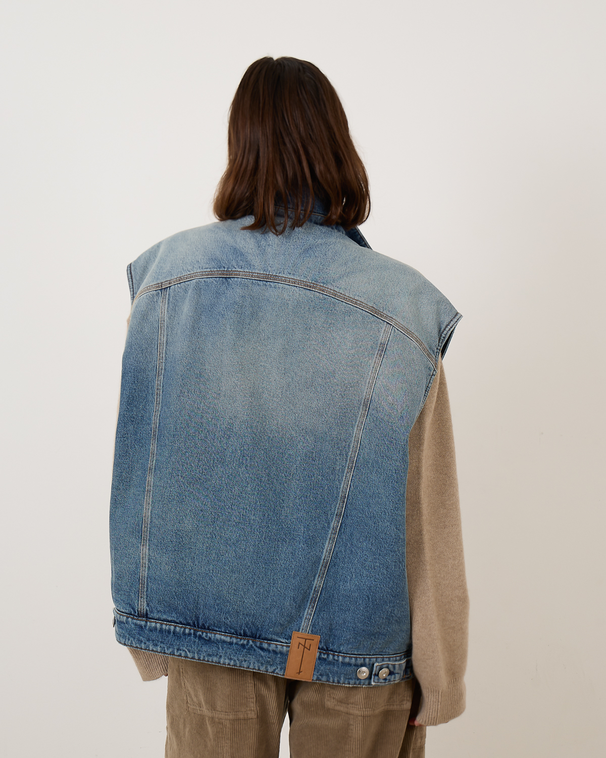 Deze opvallende spijkergilet in jeansblauw combineert klassieke denim details met een moderne, mouwloze uitvoering. Het 100% organisch katoen zorgt voor comfort en ademend draagplezier. De losvallende pasvorm geeft je bewegingsvrijheid en een relaxed silhouet. Voorzien van een klassieke kraag, drukknoopsluiting en contrasterende sierstiksels. Het leren merkplaatje aan de achterzijde voegt een verfijnd accent toe aan dit veelzijdige item.