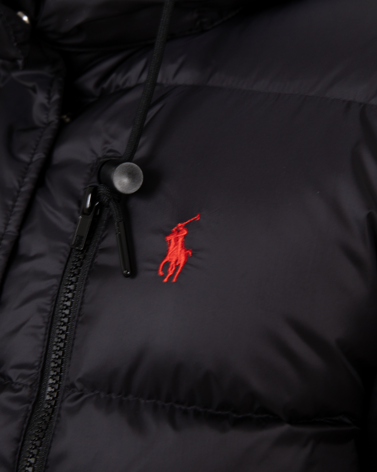 Dit zwarte gewatteerde winterjack van 100% nylon biedt je een trendy en functionele look. Het jack heeft een warme capuchon en een praktische ritssluiting met drukknopen. De losvallende pasvorm zorgt voor bewegingsvrijheid en comfort. Het iconische rode polo-logo maakt dit donsjack een tijdloos item waarin je opvalt.