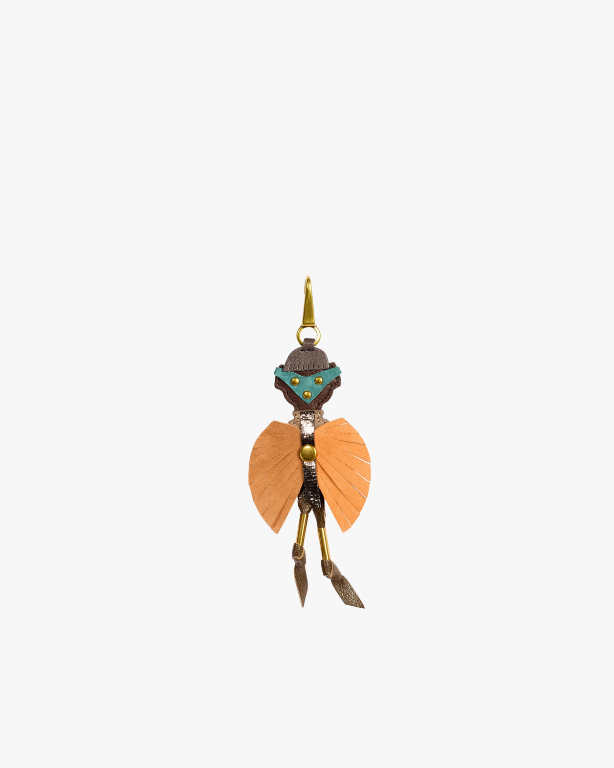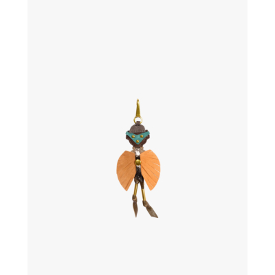Deze stijlvolle sleutelhanger combineert het vakmanschap van koe- en geitenleer in een speelse vormgeving. Het ontwerp toont een figuurlijke vorm met oranje leren vleugels en een turquoise bovenstuk, afgewerkt met goudkleurige hardware. De verschillende lederen elementen zijn vakkundig samengevoegd tot een opvallend accessoire dat persoonlijkheid uitstraalt. Het materiaal bestaat uit 50% koeienhuid en 50% geitenleer, wat zorgt voor duurzaamheid en een luxueuze uitstraling.