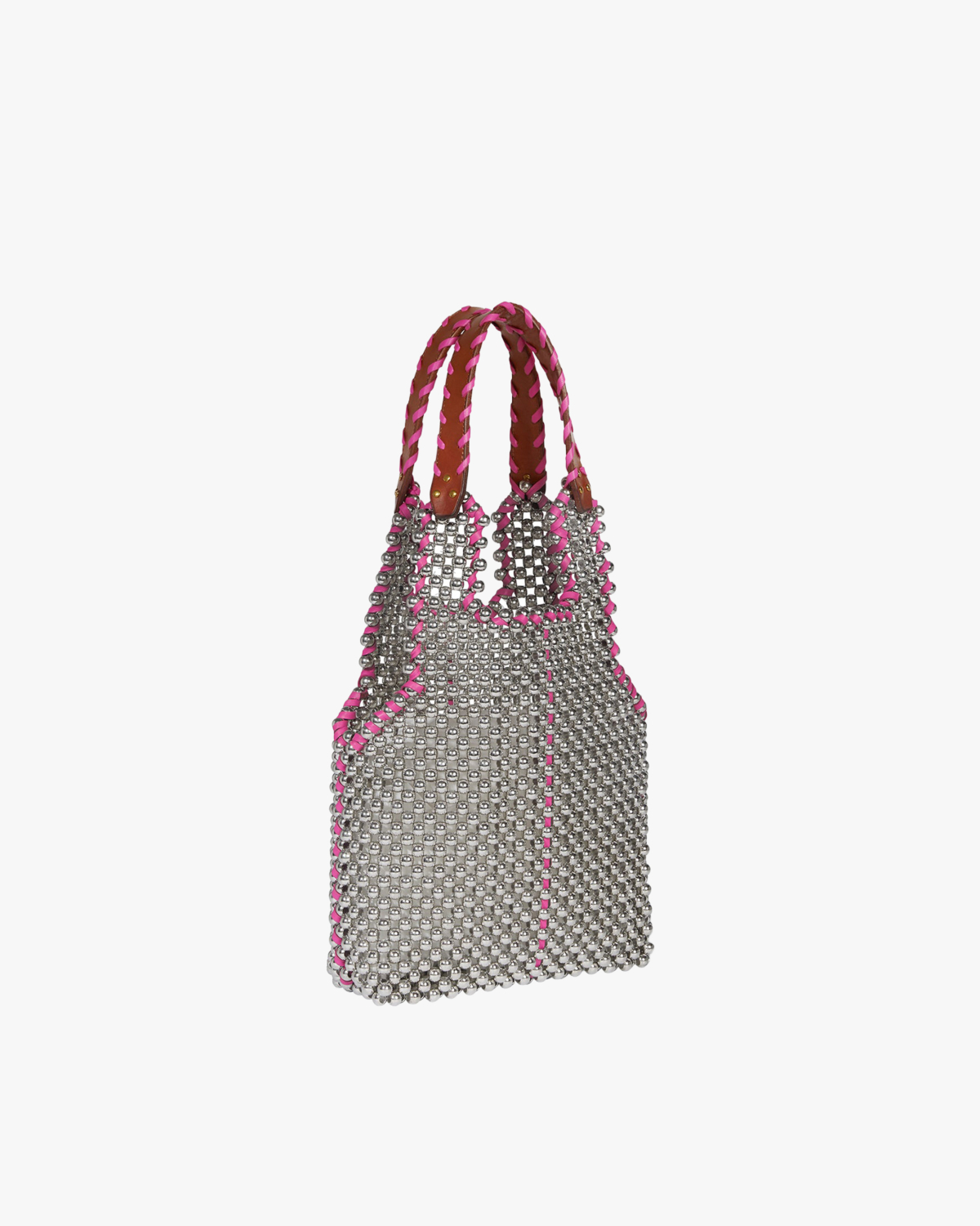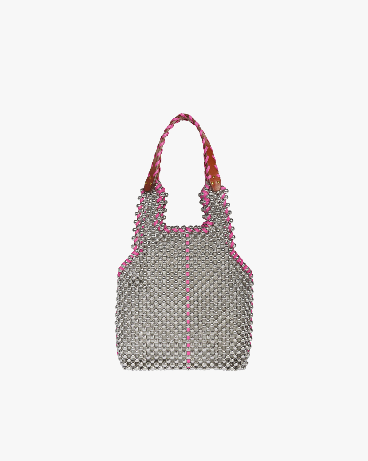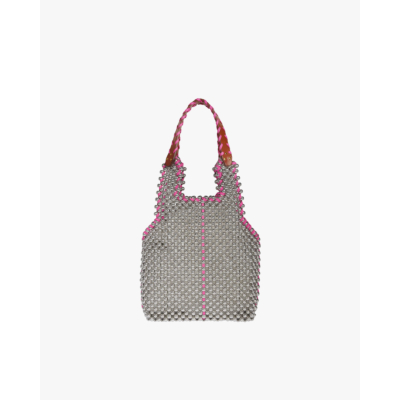 Deze opvallende handtas combineert verfijnd vakmanschap met een moderne twist. Het hele oppervlak is bedekt met zilveren kralen in een geometrisch patroon, afgewerkt met roze details langs de randen. De gevlochten hengsels tonen een speelse mix van roze en bruin leer. Vervaardigd uit 90% acryl kralen en 10% leer biedt deze tas een luxueuze uitstraling met een eigentijdse edge.