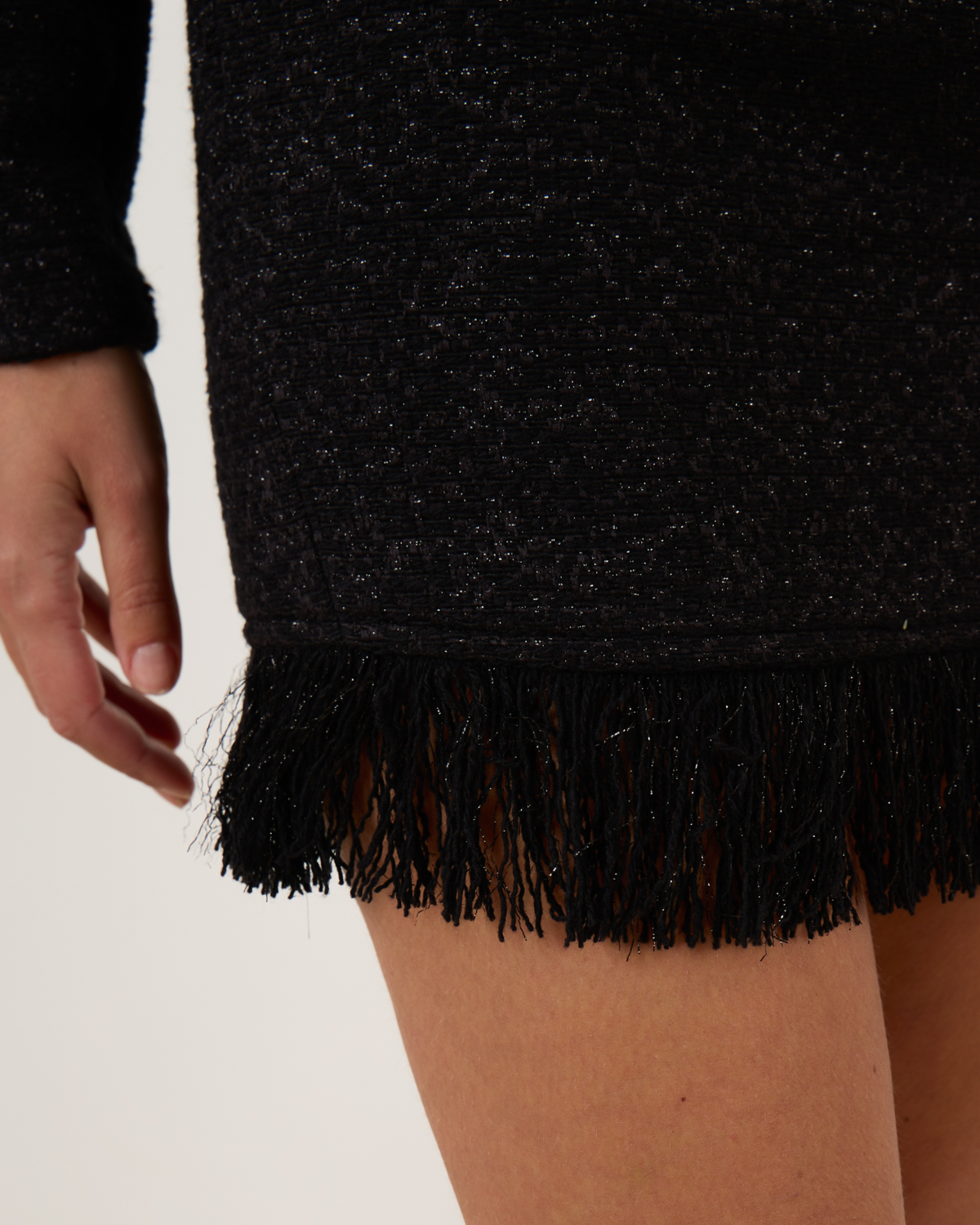 De Thina jurk van IRO is volledig versierd met subtiele shimmerdetails die het design extra diepte geven. Het model heeft een hoge halslijn, lange mouwen, een ritssluiting aan de achterkant en een elegante pasvorm die het lichaam mooi volgt. Verder is de jurk aan de onderkant voorzien van franjes.