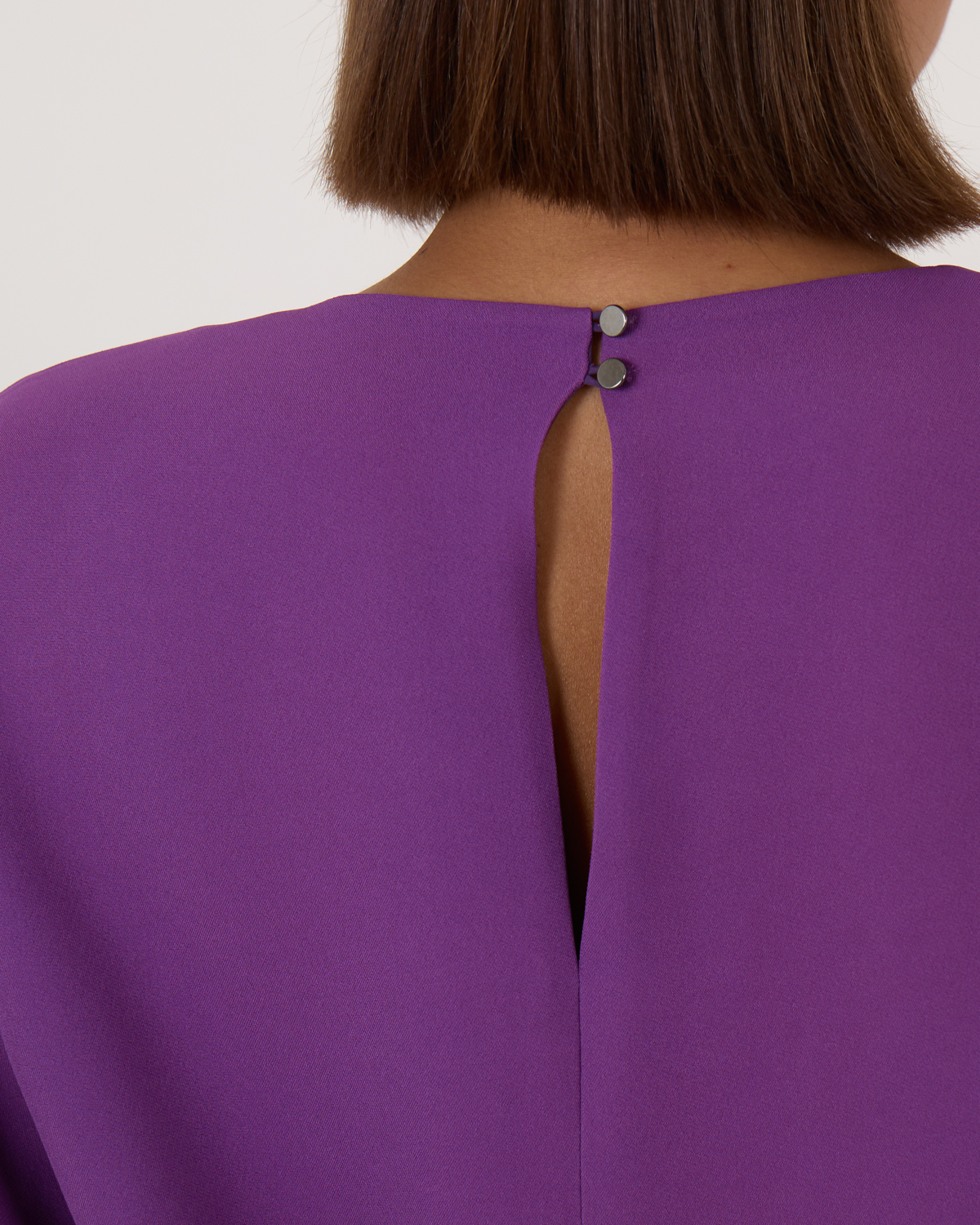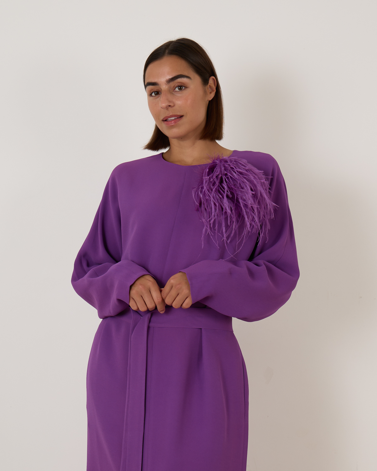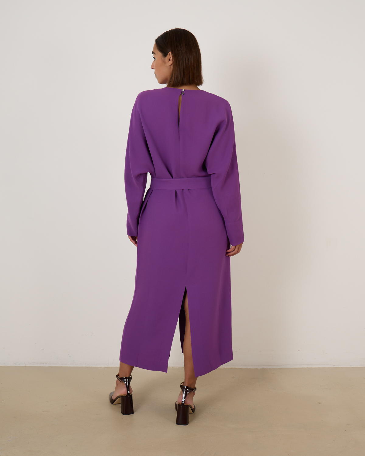 Deze strak gevoerde jurk van Indress is vervaardigd uit een uniek gedrapeerde viscose- en acetaatstof. De subtiele splitten aan de voor- en achterkant geven de jurk een moderne uitstraling en laten op elegante wijze een glimp van het been zien. Dankzij de volledige voering is de jurk comfortabel om te dragen, eenvoudig aan te trekken en sluit hij achter met een spiegelknoop en een band. Voor wie de taille extra wil benadrukken, wordt de jurk geleverd met een brede riem die het silhouet versterkt en de look compleet maakt.
