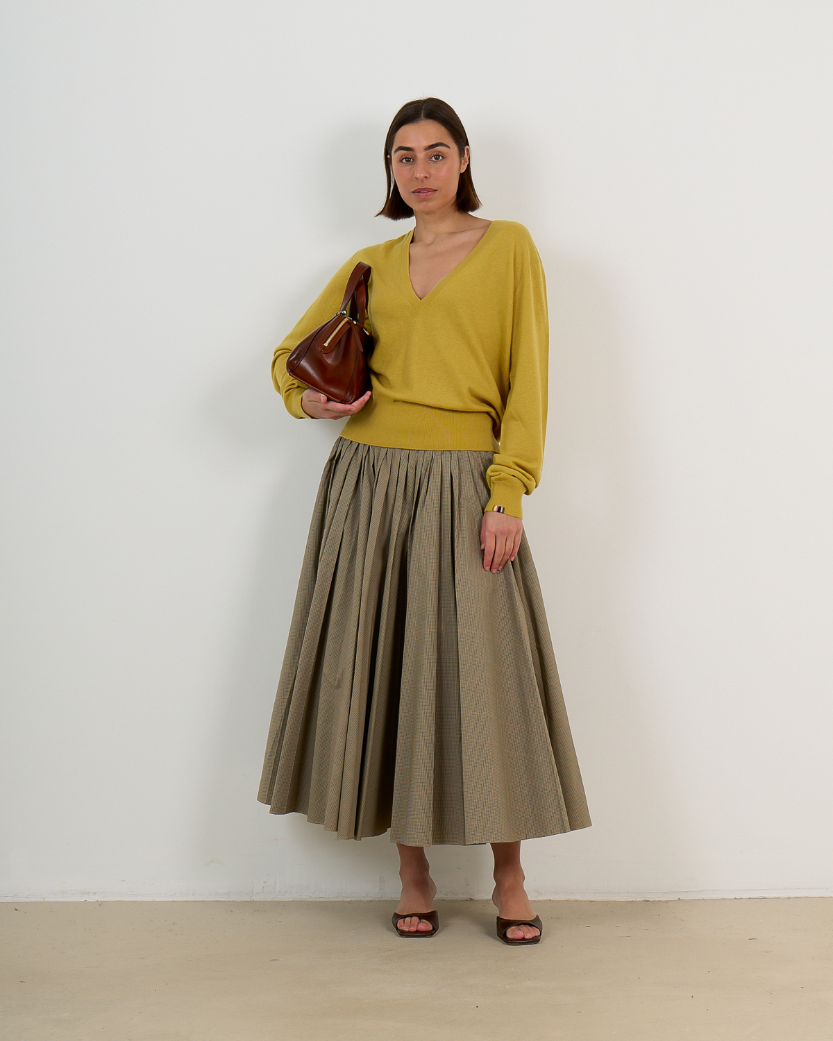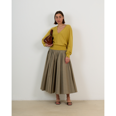 Deze gele cashmere trui straalt verfijnde elegance uit met zijn diep uitgesneden V-hals en relaxed pasvorm. De lange mouwen en ribgebreide zoom geven het design een modern karakter. Vervaardigd uit een luxueuze mix van 70% wol en 30% cashmere biedt de trui optimaal comfort en duurzame kwaliteit. De warme gele kleur voegt een opvallend accent toe aan je look.