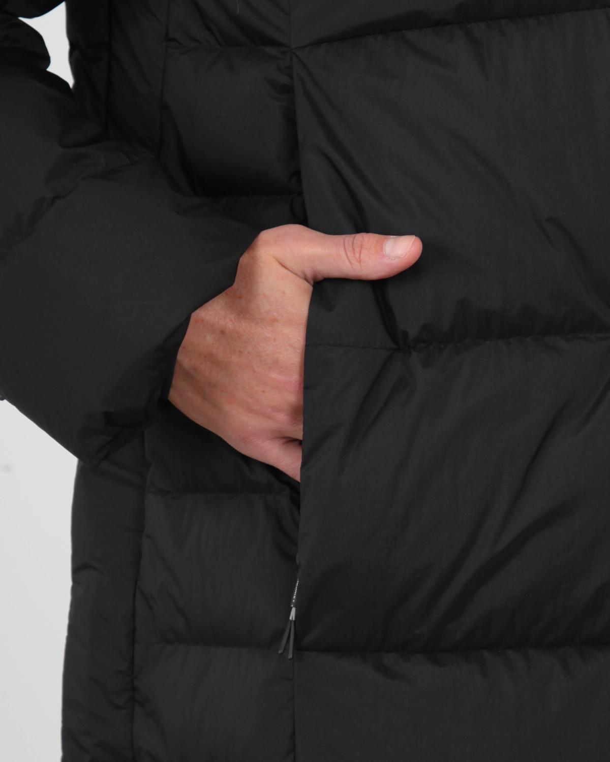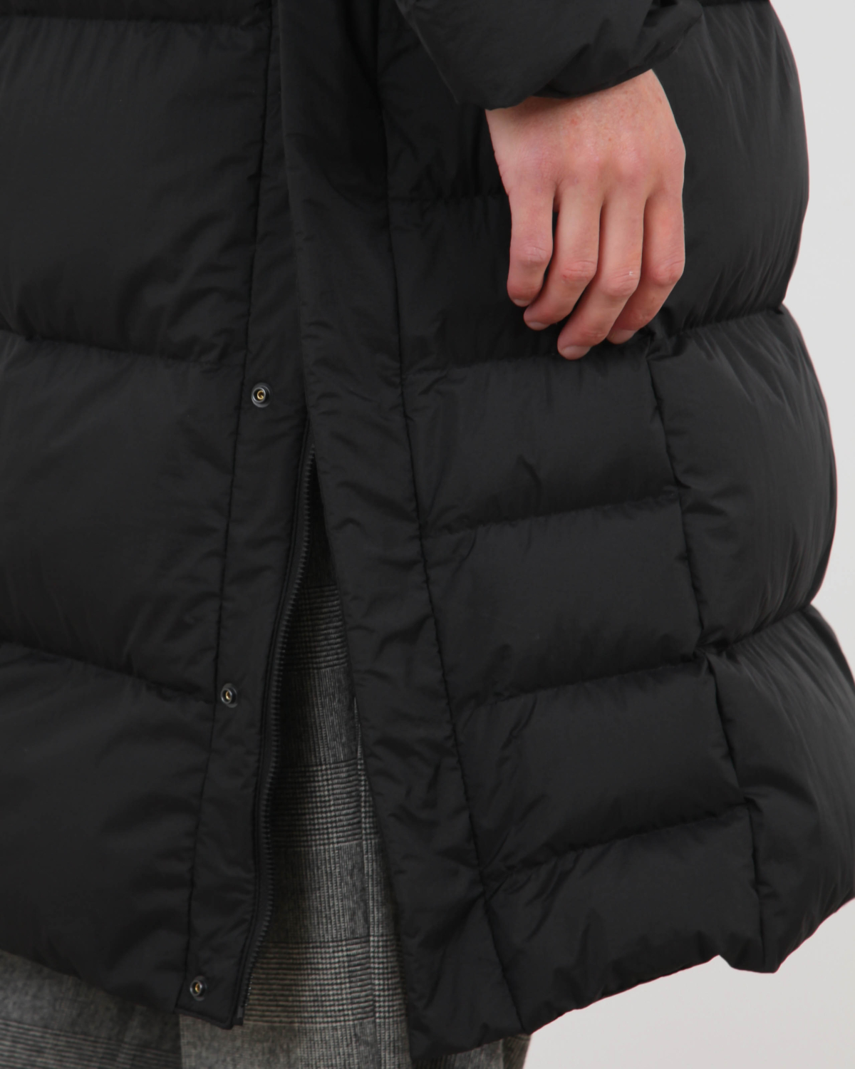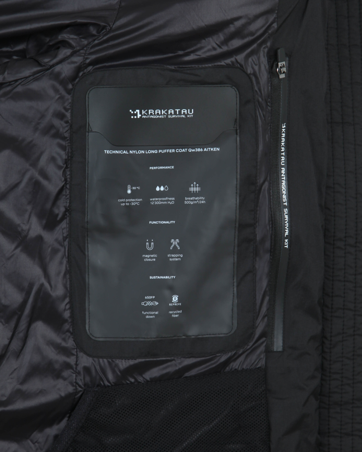 Maak je klaar voor de winter met deze gewatteerde jas van Krakatau. De lange jas komt in de kleur zwart en is gevoerd met dons. De warme jas heeft aan de voorkant een verborgen rits en is afgewerkt met een capuchon en steekzakken. Aan beide zijden heeft de jas zijsplitten met een rits en drukknopen. Verder heeft de jas aan de binnenkant 4 zakken en twee lange banden waarmee je de jas als rugzak kan dragen.