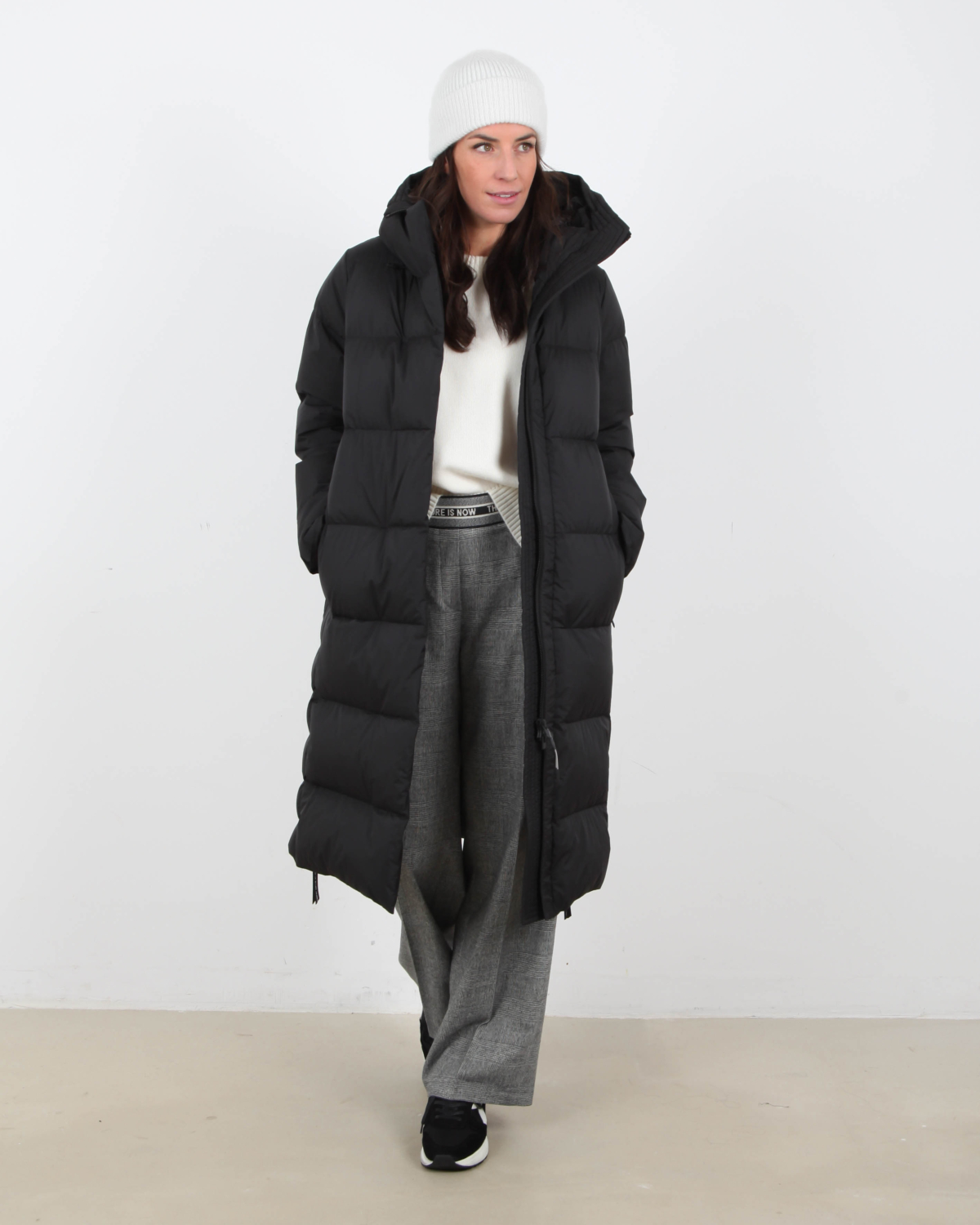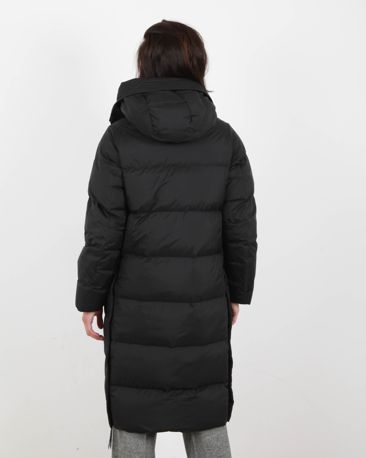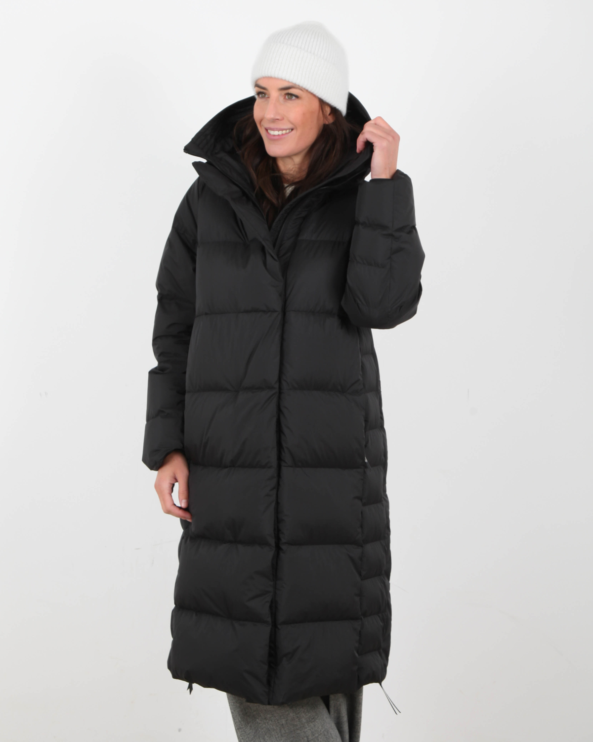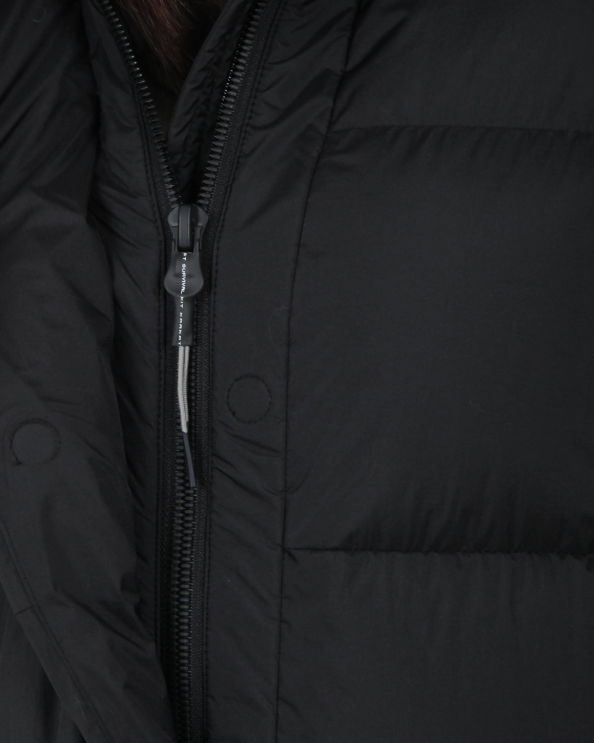 Maak je klaar voor de winter met deze gewatteerde jas van Krakatau. De lange jas komt in de kleur zwart en is gevoerd met dons. De warme jas heeft aan de voorkant een verborgen rits en is afgewerkt met een capuchon en steekzakken. Aan beide zijden heeft de jas zijsplitten met een rits en drukknopen. Verder heeft de jas aan de binnenkant 4 zakken en twee lange banden waarmee je de jas als rugzak kan dragen.