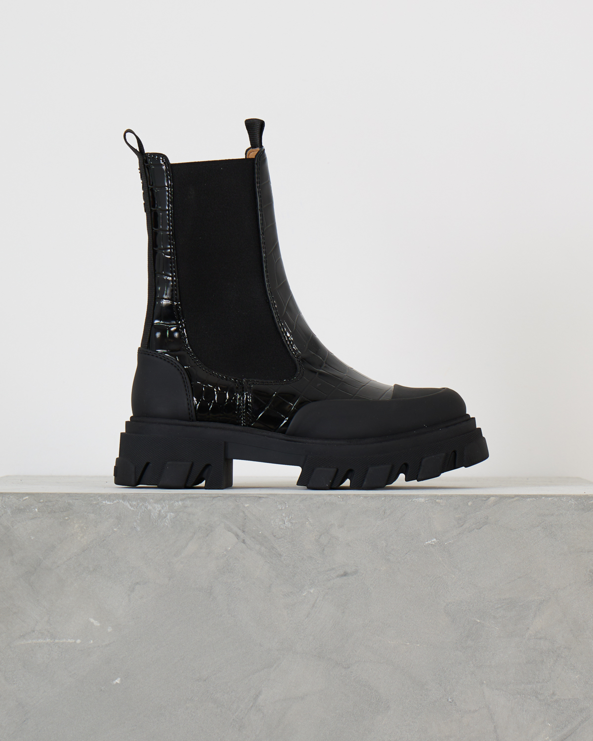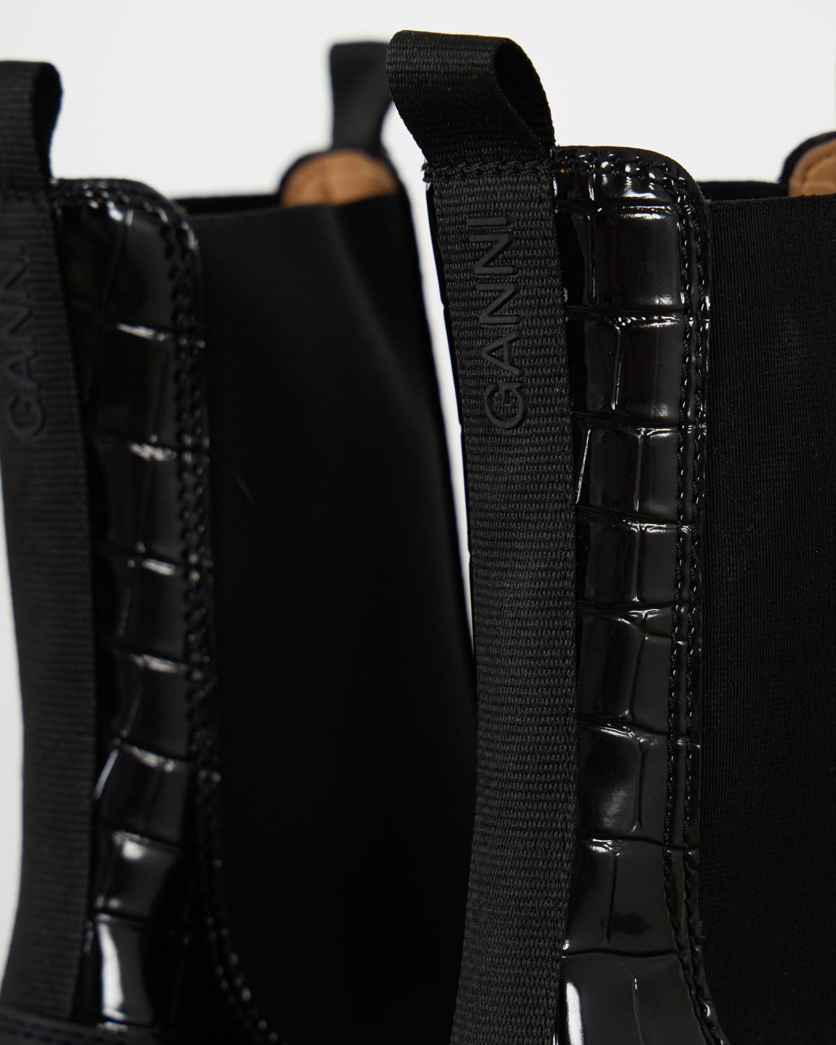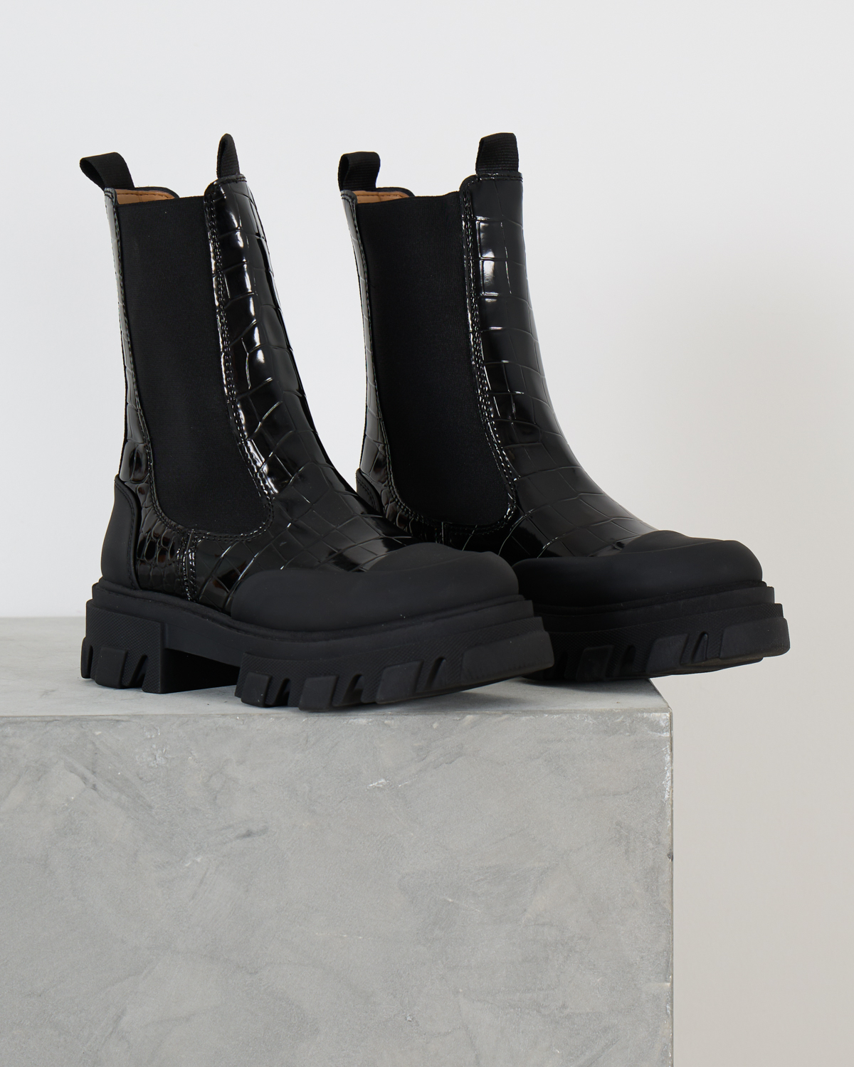 De Black Stitch Cleated Mid Chelsea Boots van GANNI zijn de perfecte combinatie van stijl en comfort. Deze zwarte Chelsea laarzen hebben een robuuste zool en glanzend leer met croco reliëf wat zorgt voor een eigentijdse uitstraling. Ze zijn gemaakt van hoogwaardige materialen en bieden zowel duurzaamheid als een trendy look. Perfect voor elke gelegenheid, voegen deze laarzen een stoere touch toe aan je outfit.