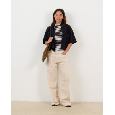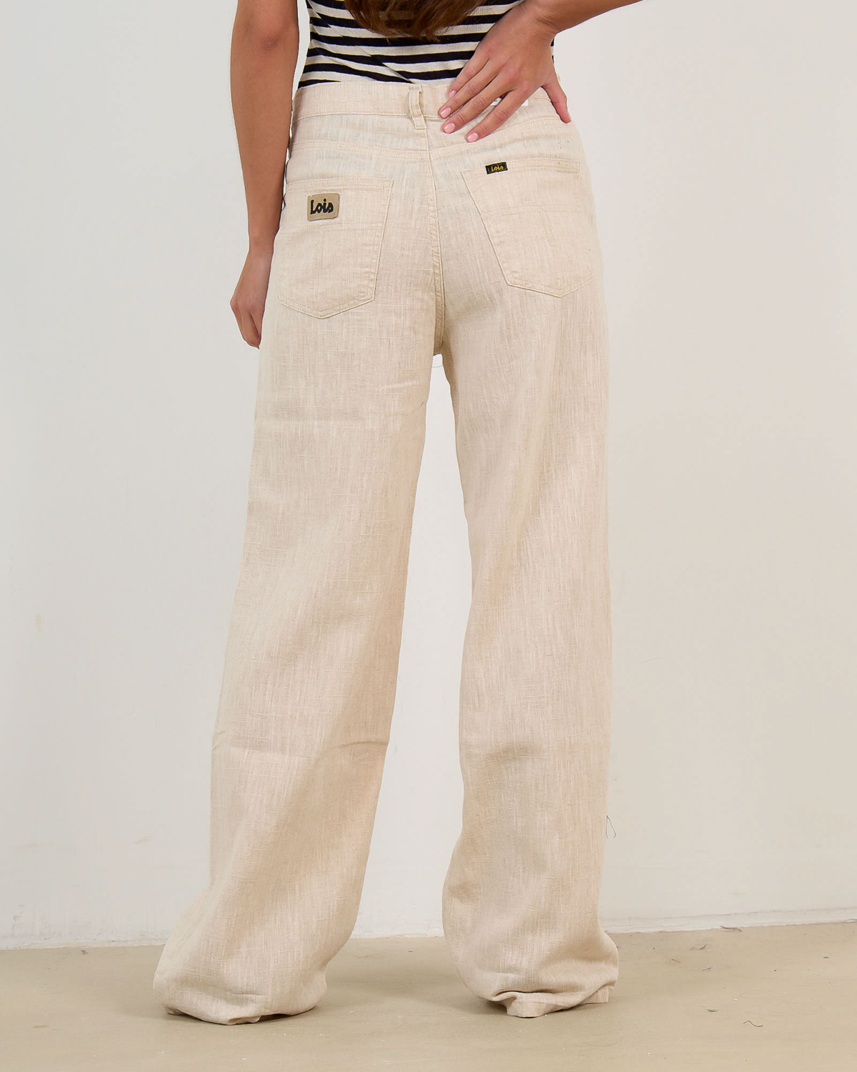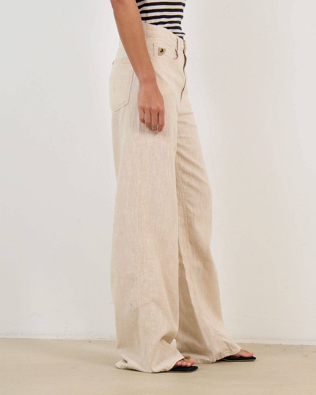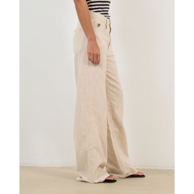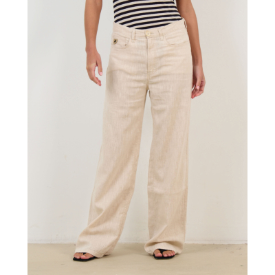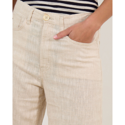Deze elegante beige pantalon van zachte linnenmix brengt tijdloze verfijning naar je garderobe. De relaxed fit en wijde pijpen zorgen voor ultiem draagcomfort en een moderne uitstraling. Gemaakt van een luxueuze blend van 60% linnen en 40% katoen valt de pantalon prachtig en straalt natuurlijke elegantie uit. De klassieke vijf-zakken indeling en knoop- en ritssluiting completeren het stijlvolle ontwerp.
