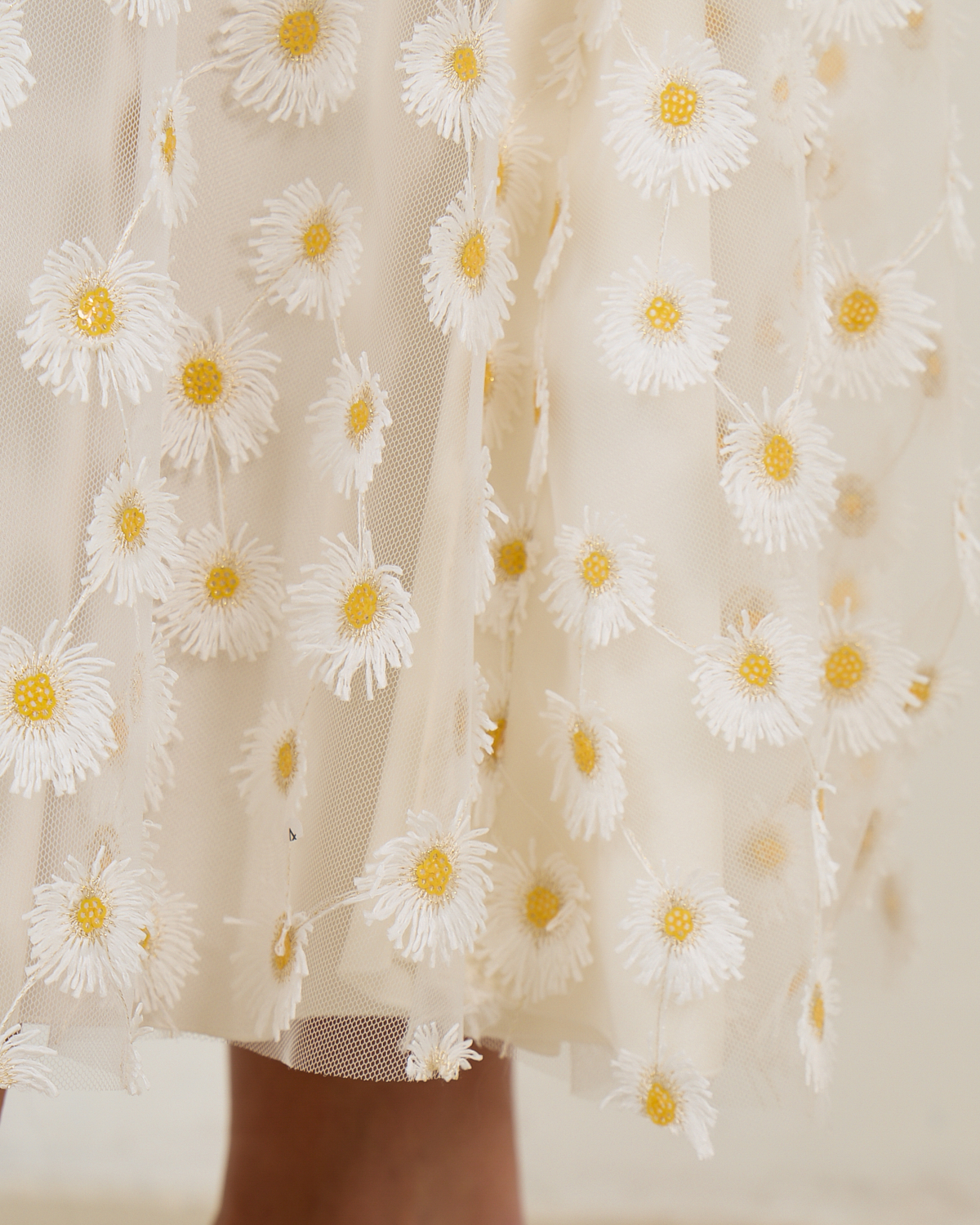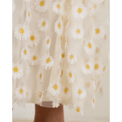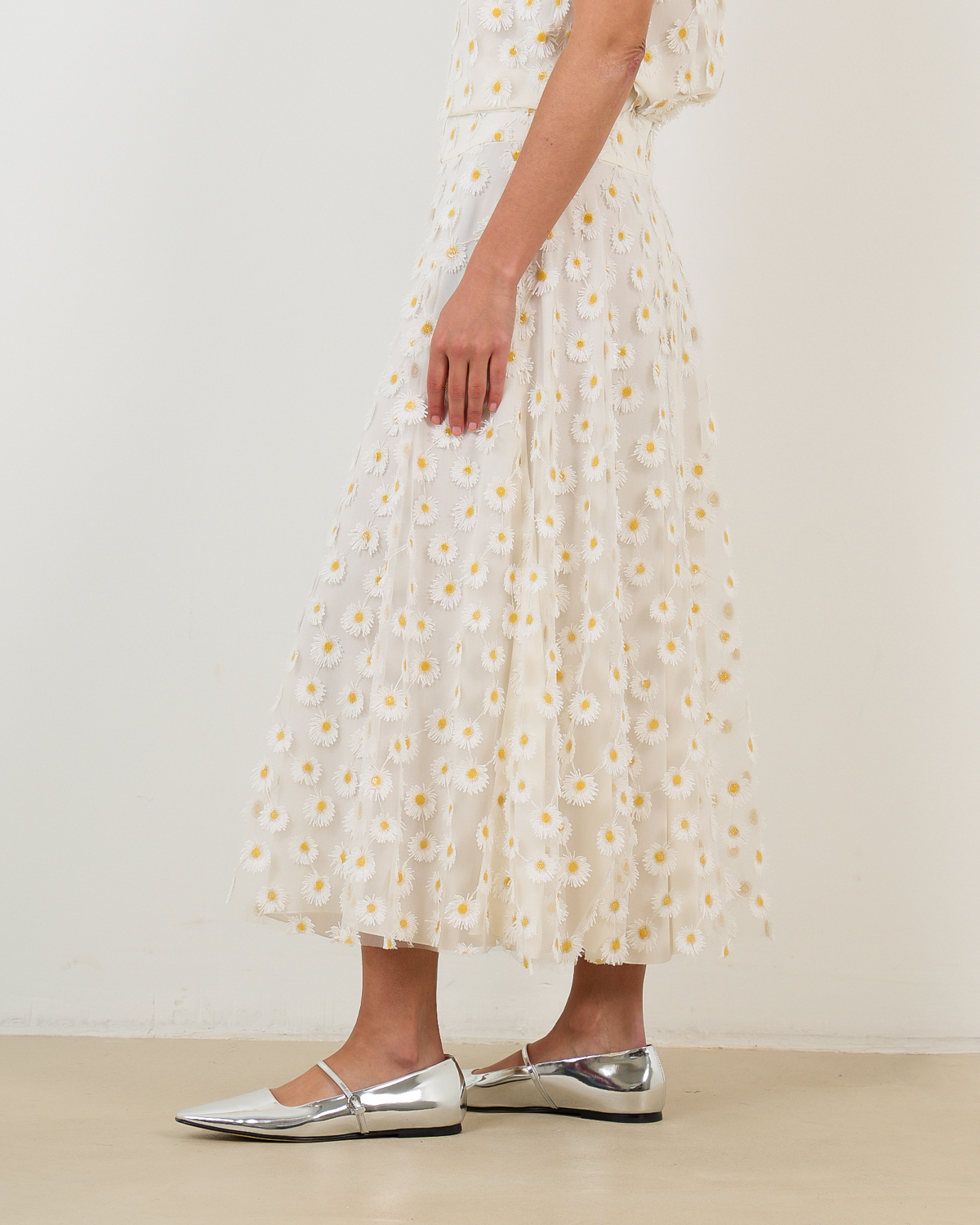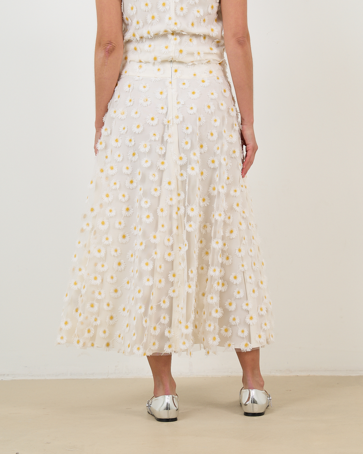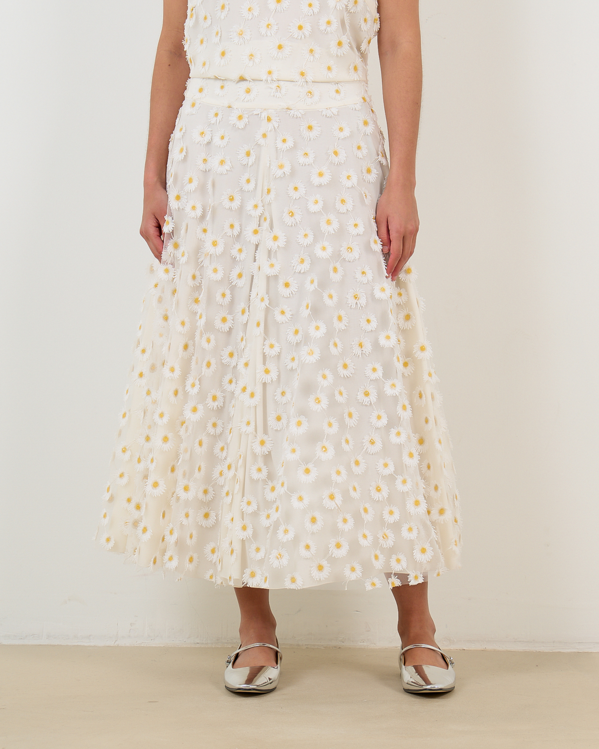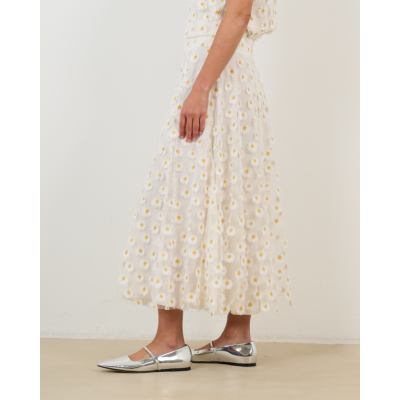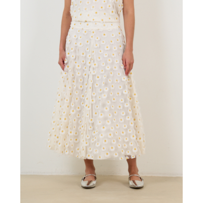 Deze verfijnde witte midi rok toont een speelse madeliefjesprint over het gehele oppervlak. De relaxed-fit pasvorm zorgt voor een comfortabele draagervaring, terwijl de midi lengte een elegante uitstraling creëert. Vervaardigd uit 100% polyester biedt dit stuk zowel bewegingsvrijheid als stijl. De hoge tailleband en de volumineuze rok geven een vrouwelijk silhouet dat perfect aansluit bij de moderne garderobe.