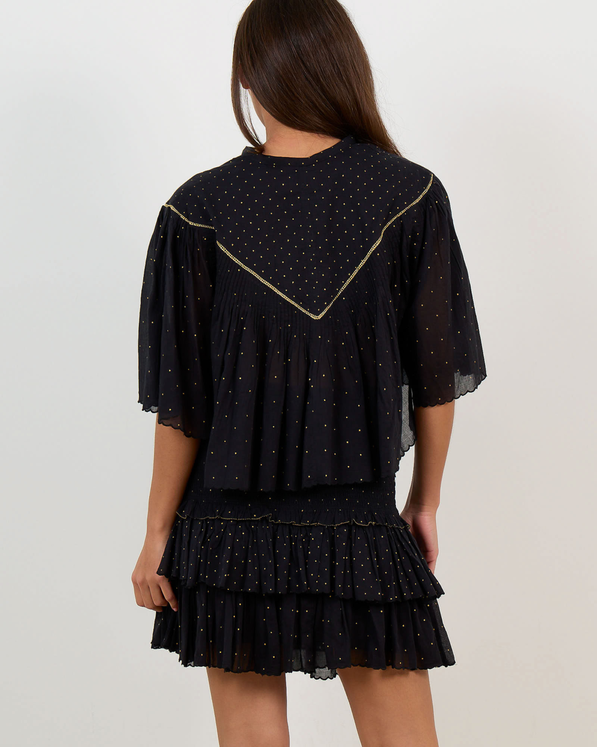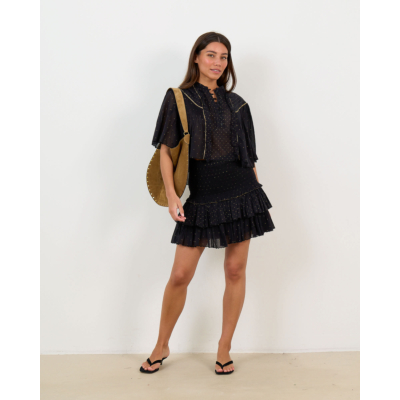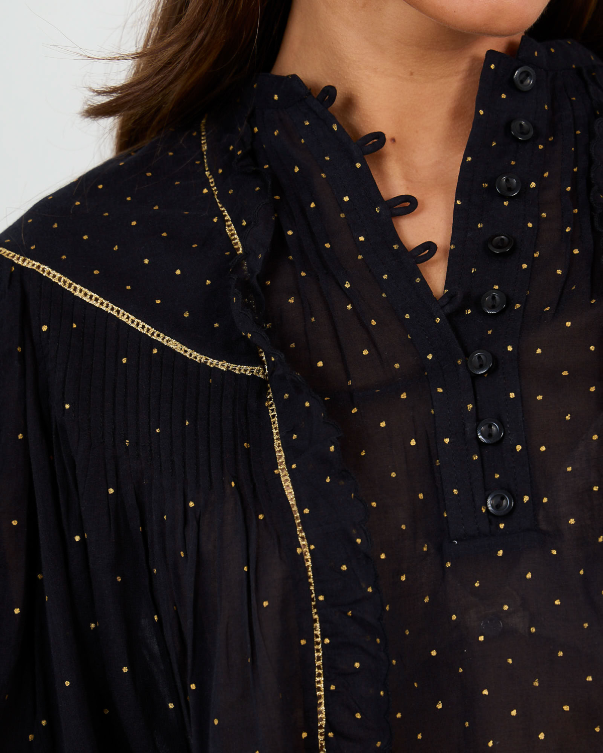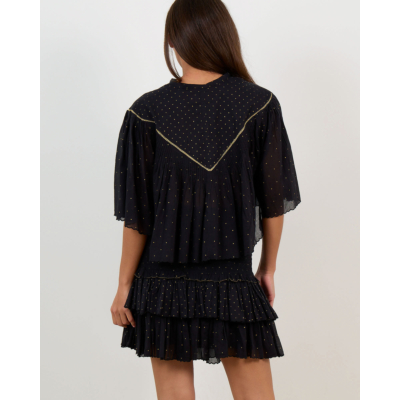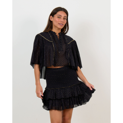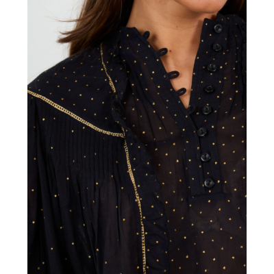 Deze zwarte blouse straalt Parijse elegantie uit met haar charmante goudkleurige stippenprint. De relaxed fit en korte mouwen zorgen voor ultiem draagcomfort, terwijl de katoenen kwaliteit ademend en zacht aanvoelt. De romantische ruffles kraag en knoopsluiting aan de voorzijde geven dit item een verfijnde vrouwelijke uitstraling. De goudkleurige details accentueren het sophisticates ontwerp perfect.