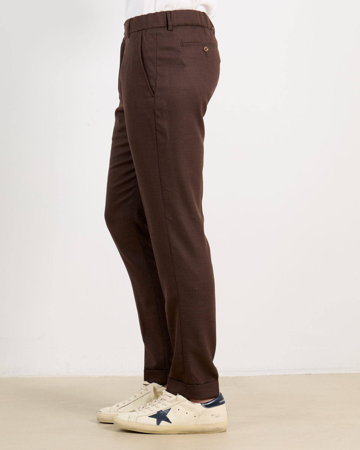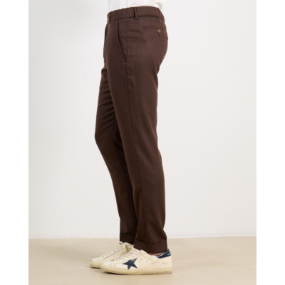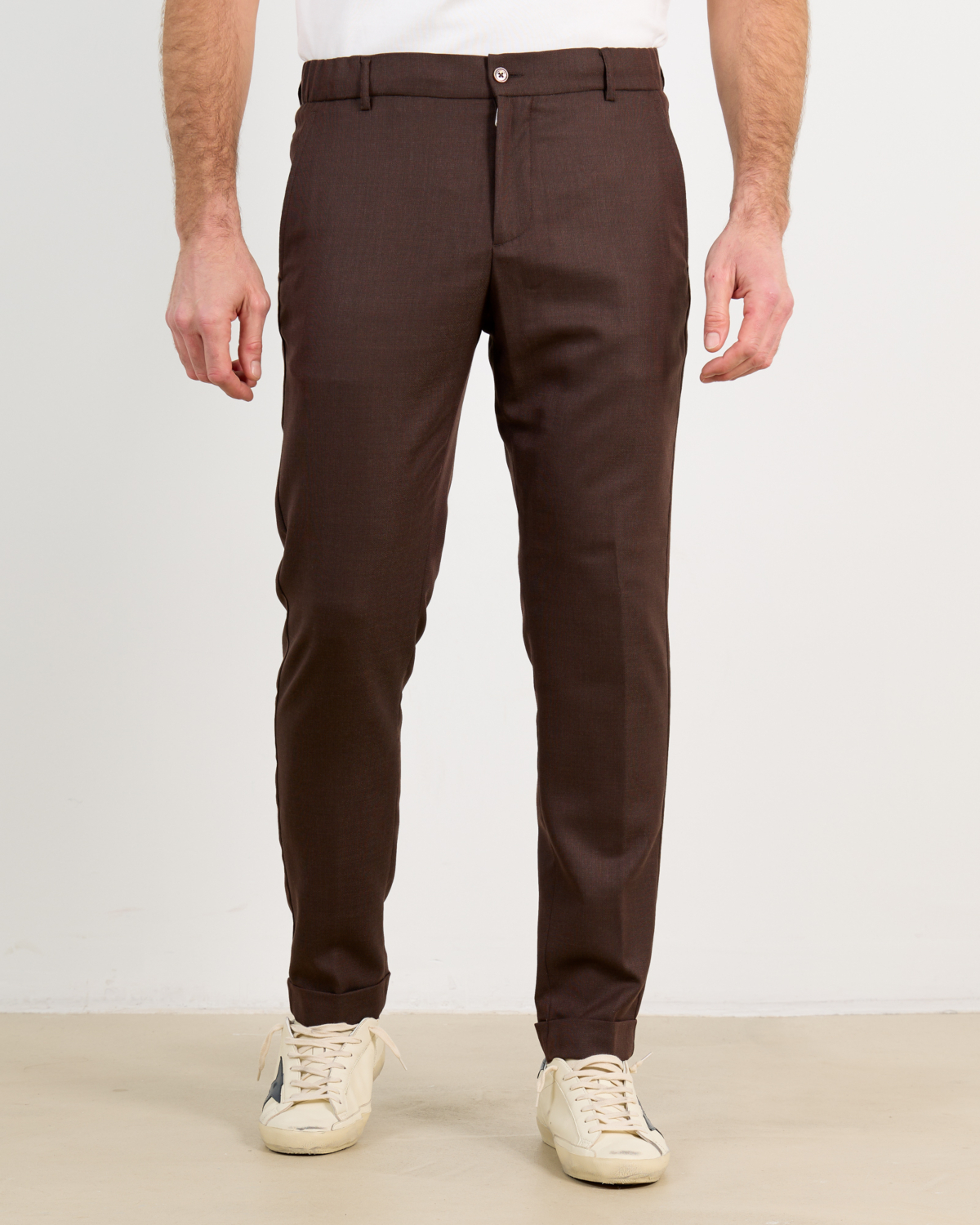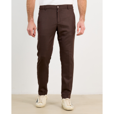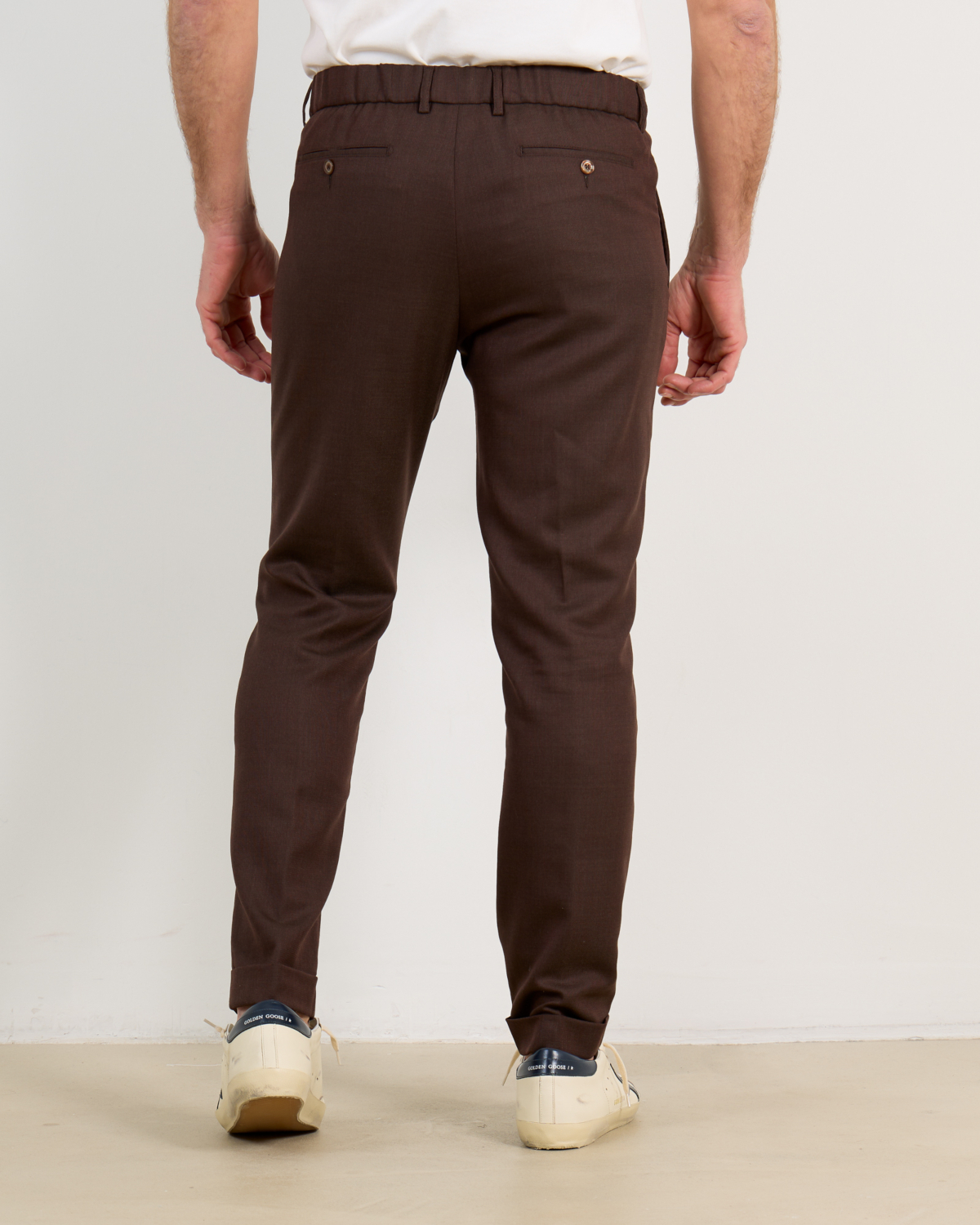 Deze bruine dress pantalon van Marco Pescarolo combineert elegantie met hedendaagse verfijning. De rijke bruine kleur straalt warmte en klasse uit, terwijl de slim fit snit zorgt voor een gestroomlijnd silhouet. De pantalon beschikt over steekzakken aan de voorzijde en paspelzakken aan de achterzijde, afgewerkt met goudkleurige knopen. Een riemlus en knoopsluiting completeren het klassieke ontwerp.