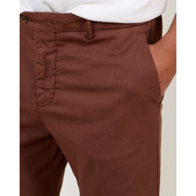 Deze verfijnde pantalon van Marco Pescarolo combineert eigentijdse stijl met klassieke elegantie. De Terra casual pantalon toont zich in een warme terracotta kleur en beschikt over een slim fit snit die zorgt voor een gestroomlijnde uitstraling. De materiaalsamenstelling van 65% lyocell, 32% katoen en 3% elastaan biedt een zachte textuur en comfortabele stretch. Details zoals steekzakken aan de voorzijde en paspelzakken met knoopsluiting aan de achterzijde completeren het ontwerp.