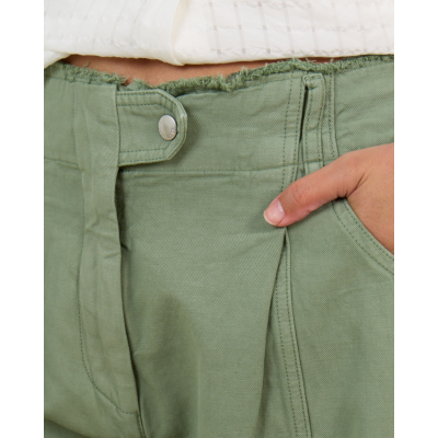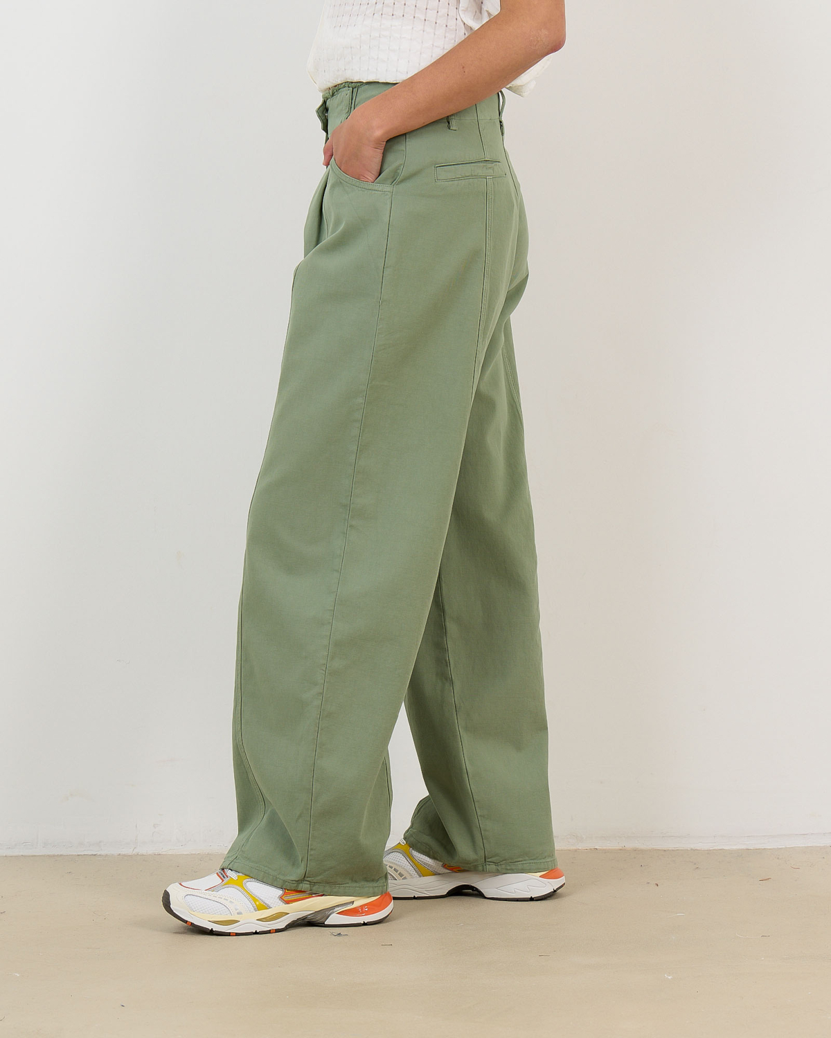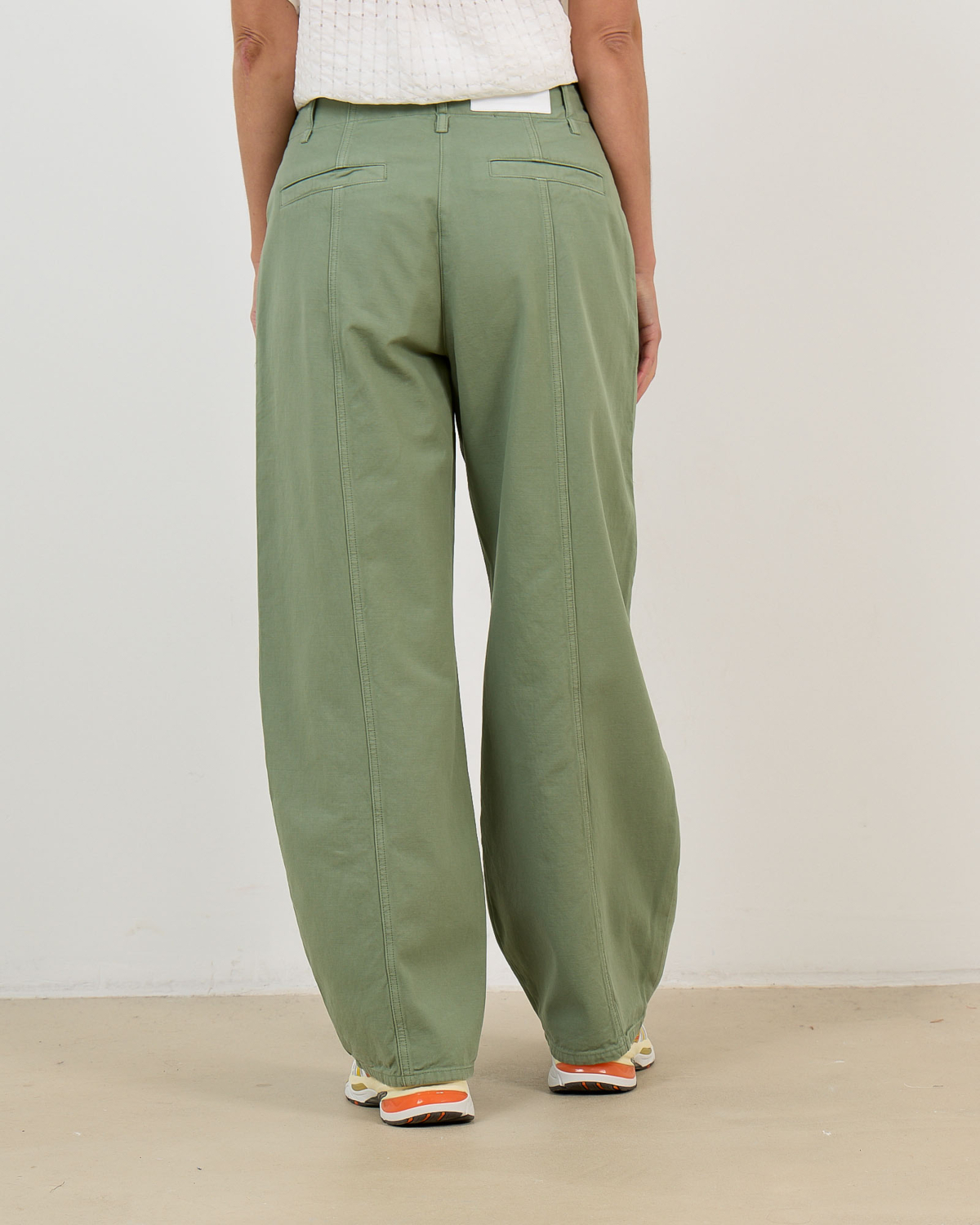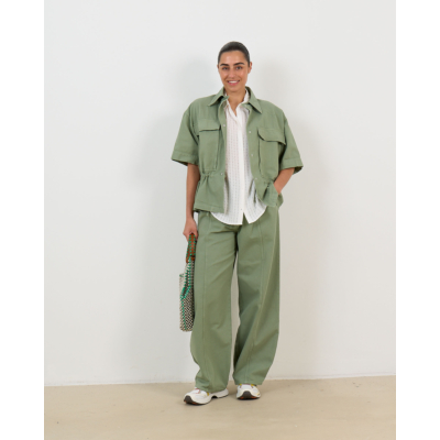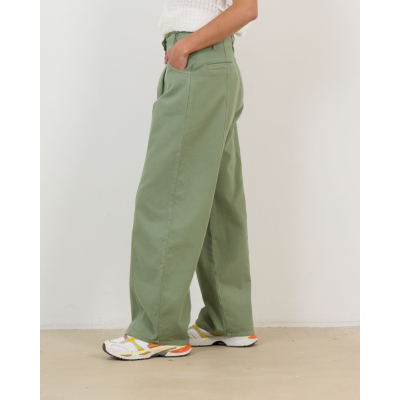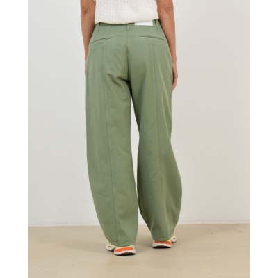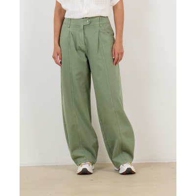 Deze opvallende groene flaired jeans van 100% katoen valt op door zijn wijde straight fit en elegante silhouet. De hoge taille met knoopsluiting en de subtiele plooien aan de voorzijde creëren een verfijnde uitstraling. Decoratieve stiknaden lopen verticaal langs de gehele lengte van de broek en geven een moderne twist aan dit klassieke design.