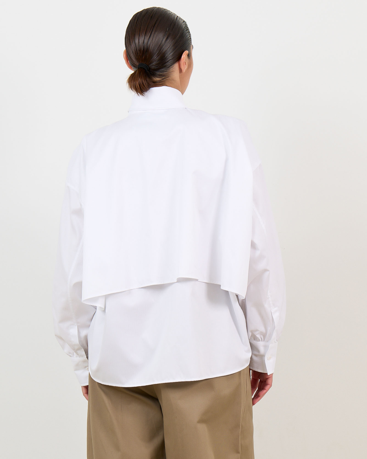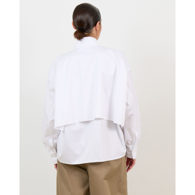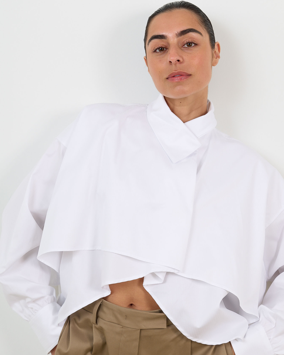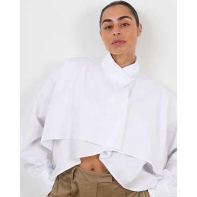 Deze opvallende witte overhemdblouse van 100% katoen combineert klassieke elegantie met een moderne twist. De karakteristieke gekruiste kraag en oversized fit zorgen voor een eigentijdse silhouet. De lange mouwen en doorknoopsluiting aan de voorzijde geven dit stuk een verfijnde uitstraling, terwijl het katoen comfortabel draagt.