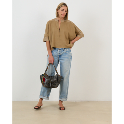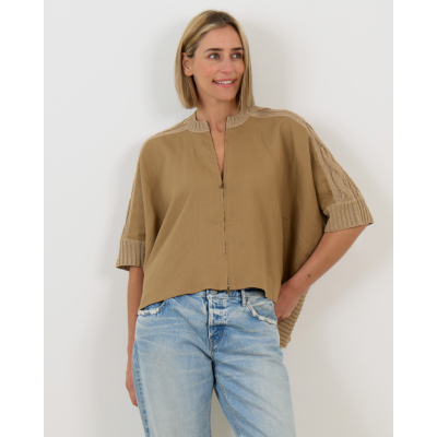 Deze luxe camelvest van Max Mara Main combineert verfijnde elegantie met moderne details. De korte mouwen zijn uitgevoerd met ribgebreide afwerkingen, evenals de ronde halslijn. Aan de achterzijde valt een opvallend gestructureerd breipatroon op met een speelse kabelstructuur die textuur en diepte toevoegt. De rechte pasvorm zorgt voor een comfortabele dracht, terwijl de camelkleur tijdloze chic uitstraalt.