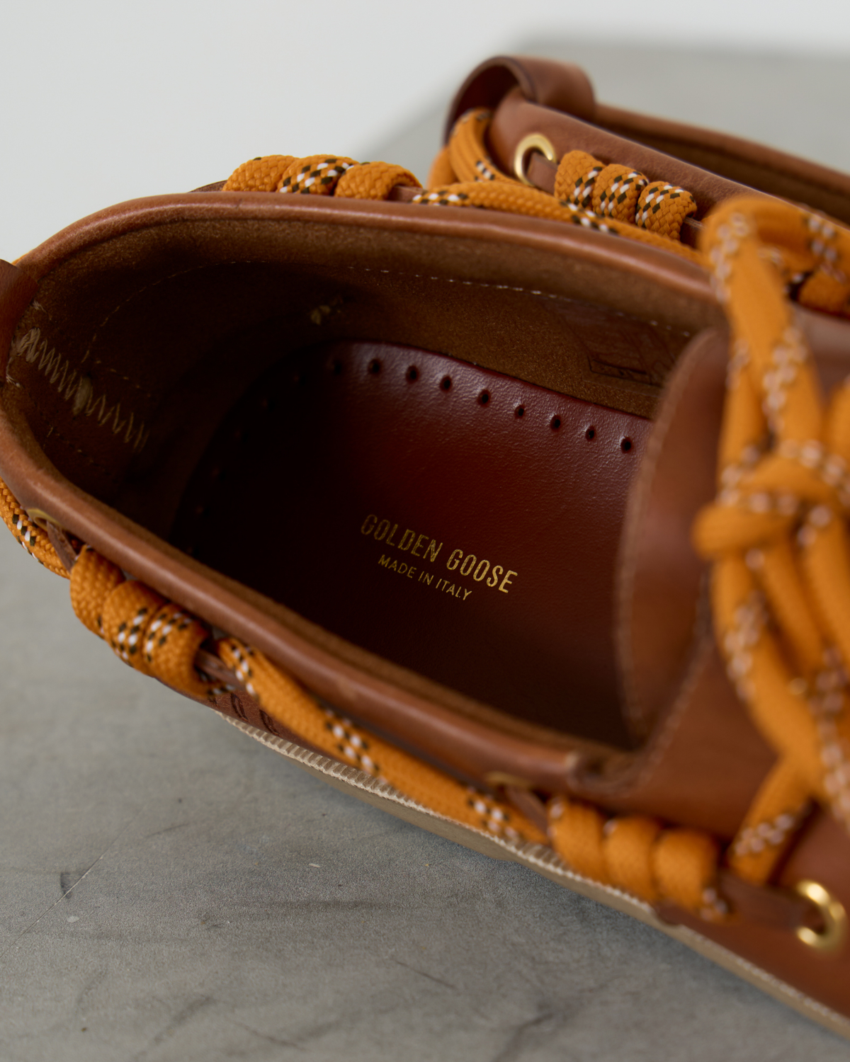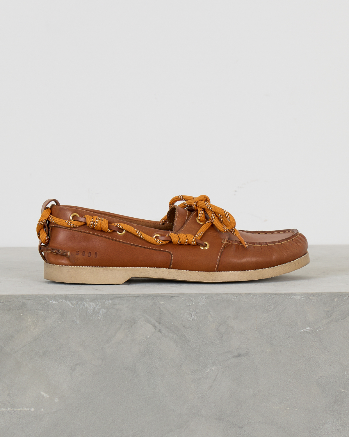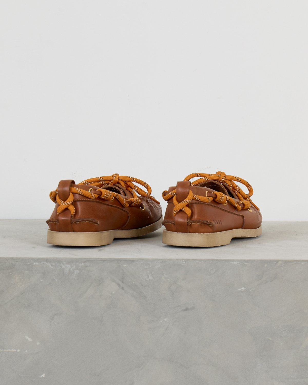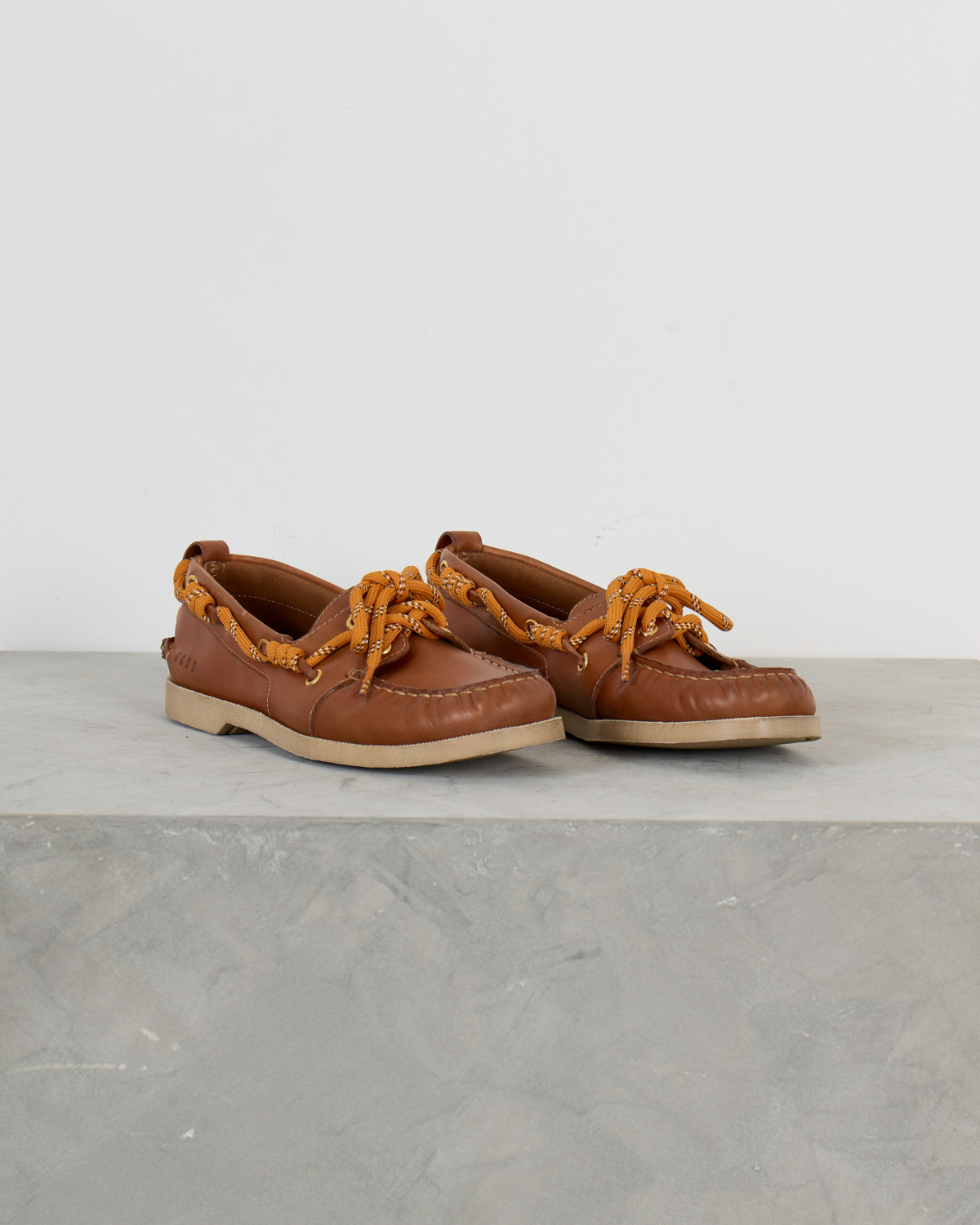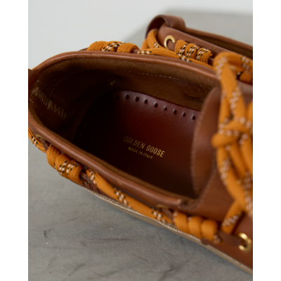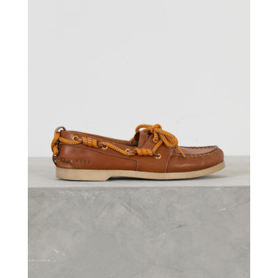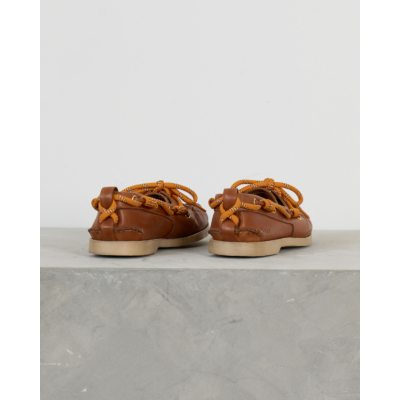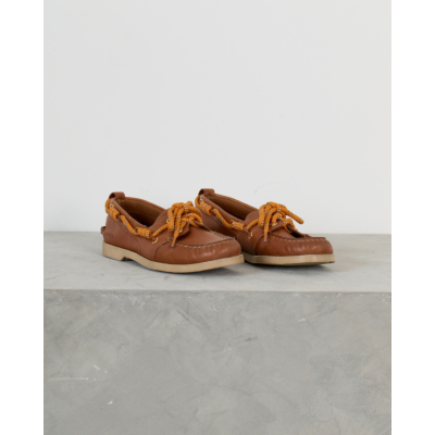 Deze elegante leren loafer in warme camelbruin straalt tijdloze elegantie uit. Het zachte leer en de klassieke bootschoen-stijl zorgen voor comfort en stijl tegelijk. De opvallende oranje veters met wit accent geven dit model een speelse twist, terwijl de gouden oogjes en handgestikte details de verfijnde afwerking benadrukken.