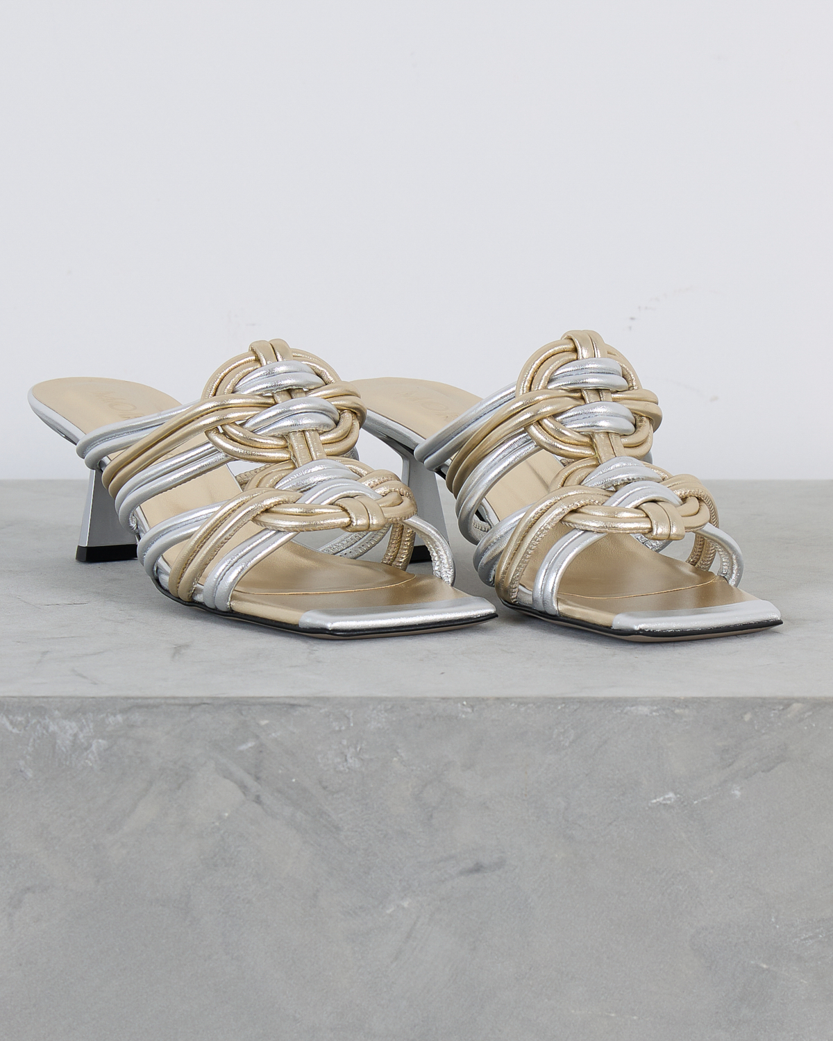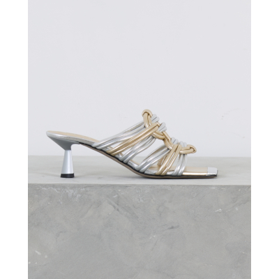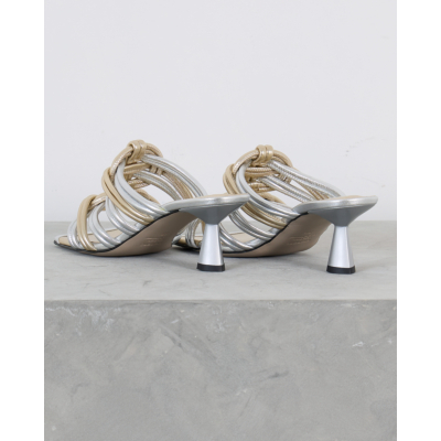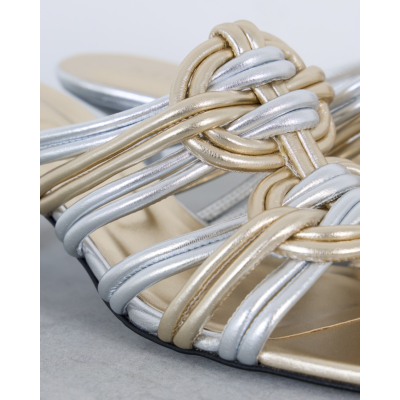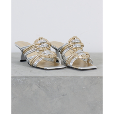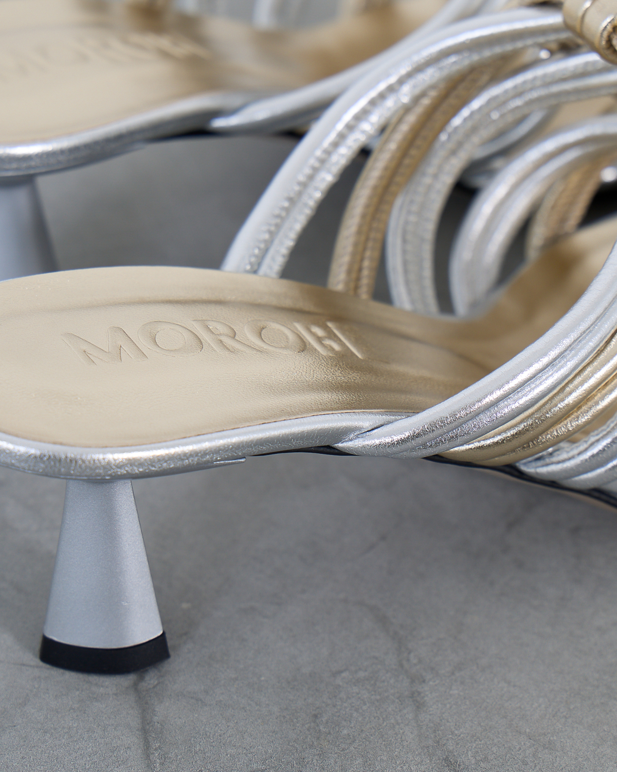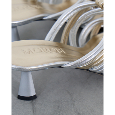 Deze elegante hakken van Morobé vallen op door de verfijnde combinatie van zilver en goud. De kunstig gevlochten bandjes vormen een opvallend contrast en creëren een luxueuze uitstraling. De slanke kitten heel zorgt voor een vrouwelijke silhouet, terwijl het open teensysteem comfort biedt. Het metallische leer straalt moderne glamour uit en de gevlochten details geven deze dames schoenen van Morobé een unieke textuur.