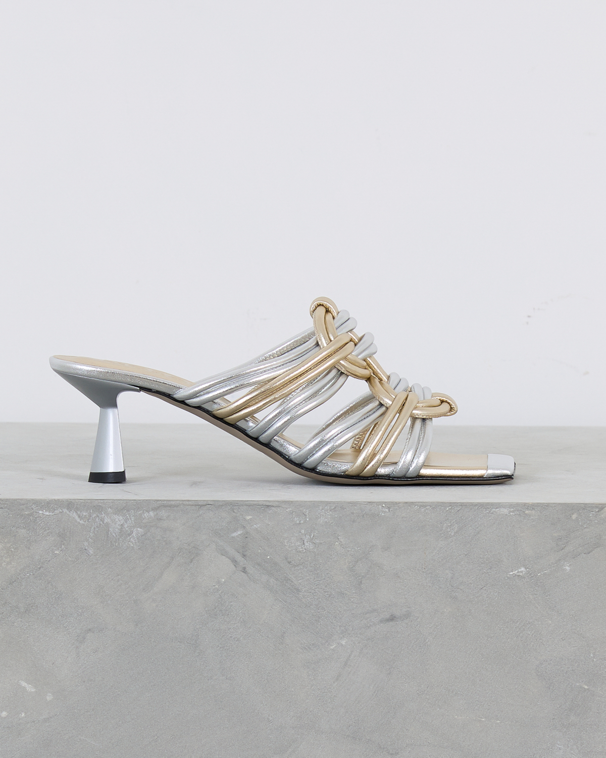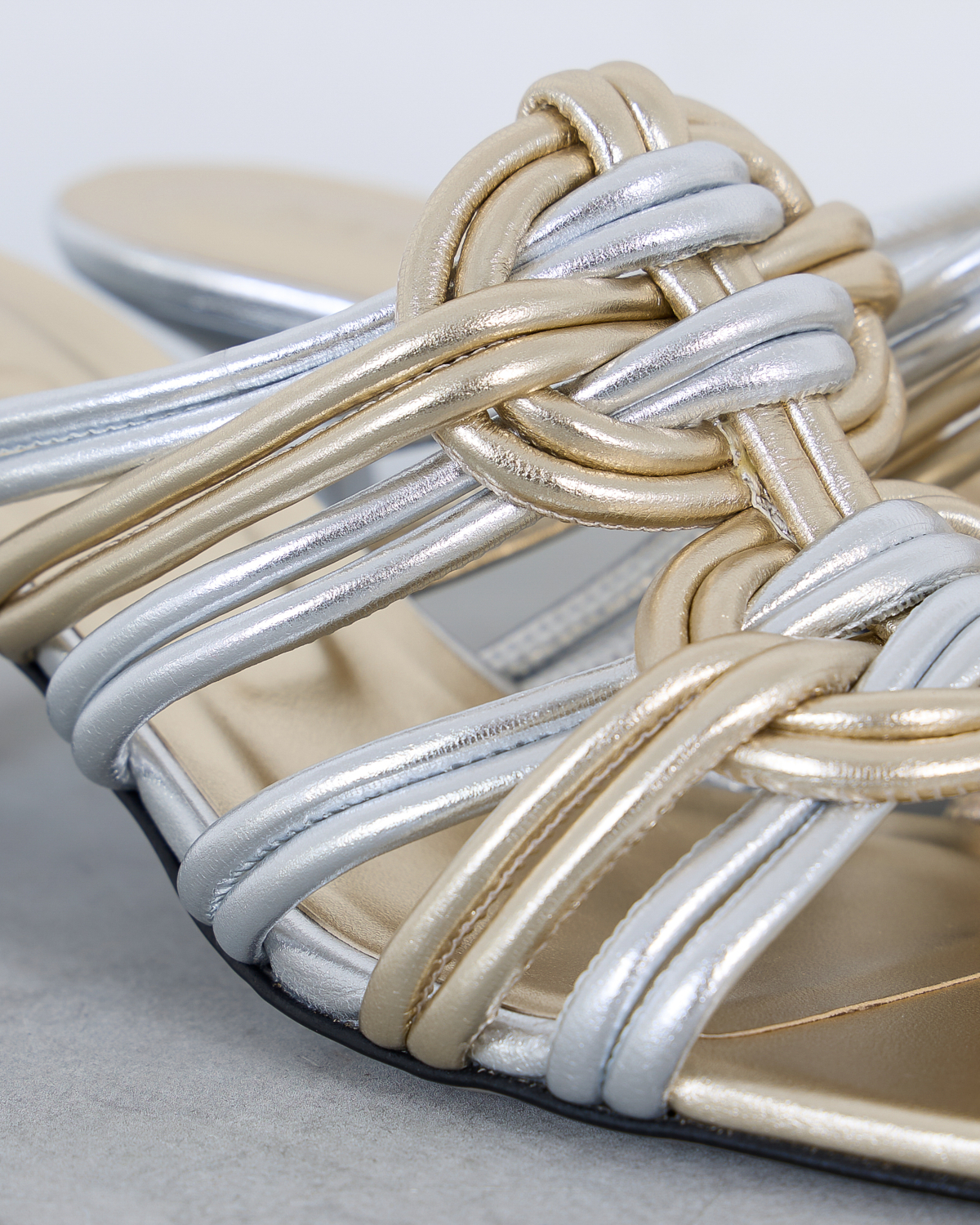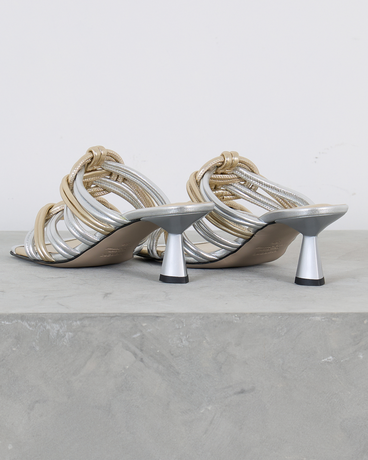Deze elegante hakken van Morobé vallen op door de verfijnde combinatie van zilver en goud. De kunstig gevlochten bandjes vormen een opvallend contrast en creëren een luxueuze uitstraling. De slanke kitten heel zorgt voor een vrouwelijke silhouet, terwijl het open teensysteem comfort biedt. Het metallische leer straalt moderne glamour uit en de gevlochten details geven deze dames schoenen van Morobé een unieke textuur.