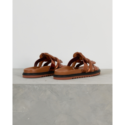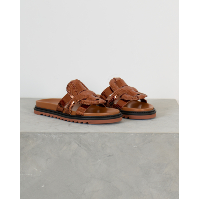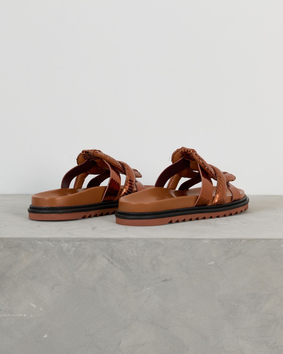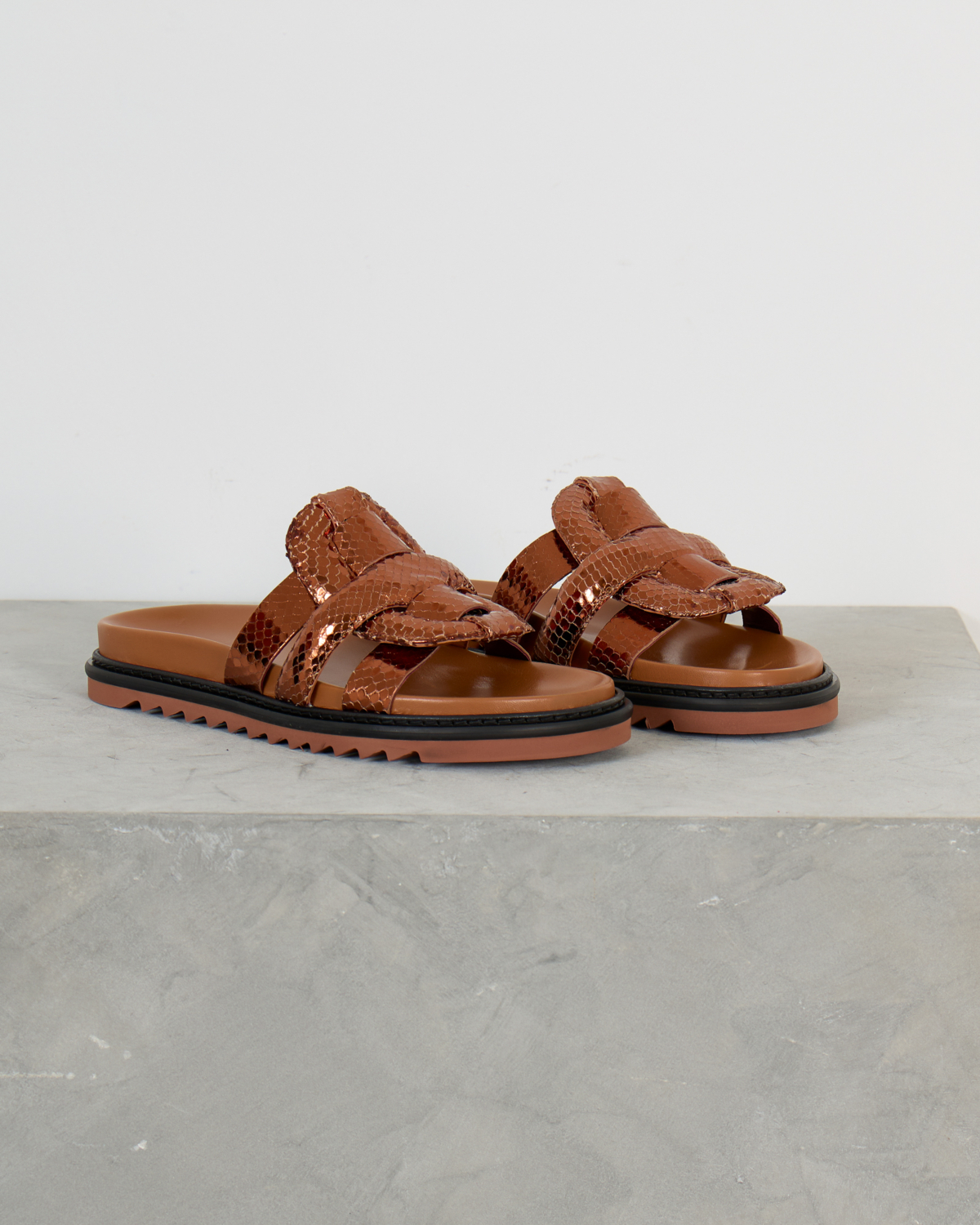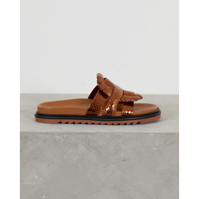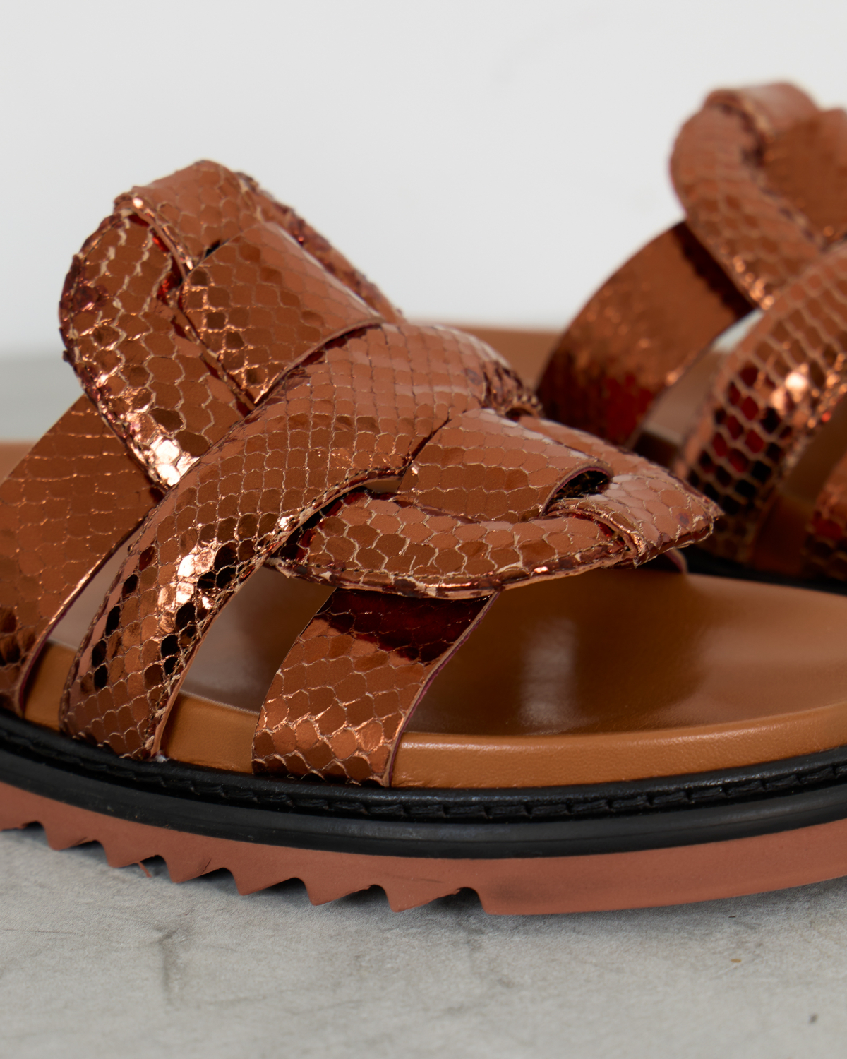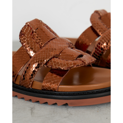Deze opvallende sandalen van leer combineren eigentijdse elegance met een trendy python print in warme bronstinten. Het gestructureerde leer toont een verfijnde schubbenprint die luxe uitstraalt. De kruisende bandjes creëren een moderne twist, terwijl de rubberen profielzool voor extra comfort en grip zorgt. Het gecontrasteerde zwarte randje aan de zool accentueert het eigentijdse design.