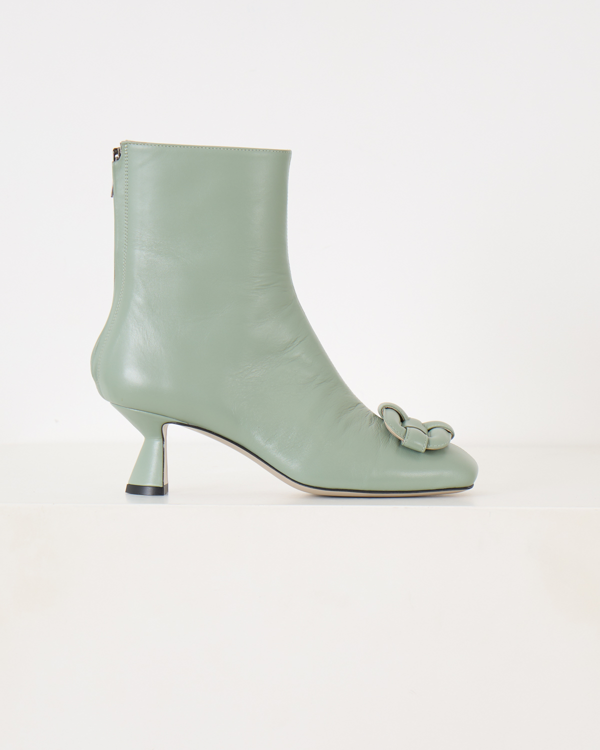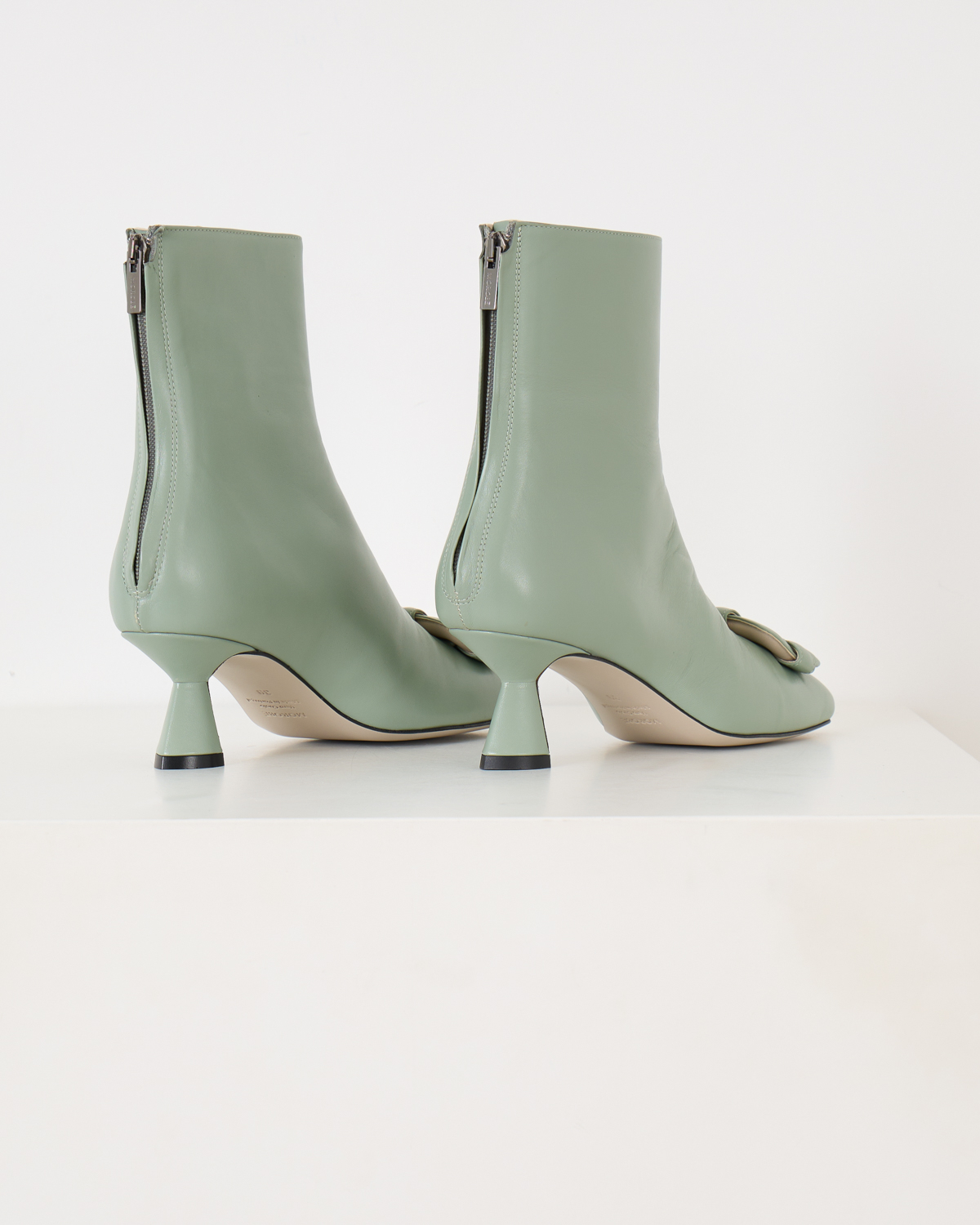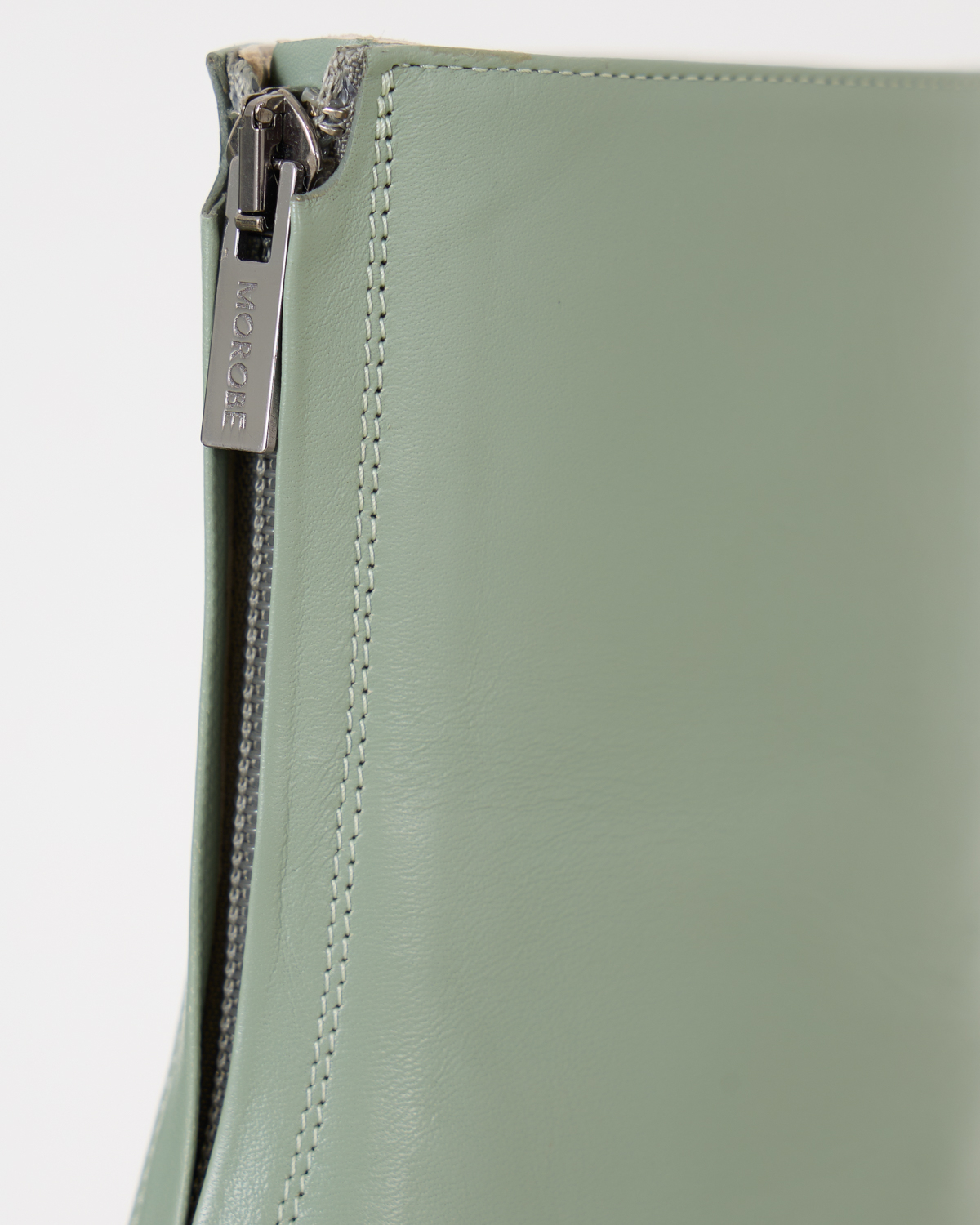 De Liv Boots van merk Morobé is gemaakt van ostrich embossed leather in de kleur salvia voor een spectaculaire look. De schoen is voorzien van een minibroche op de neus en een speciale 55 mm blokhak. Aan de achterkant hebben de enkellaarsjes een rits als extra touch.