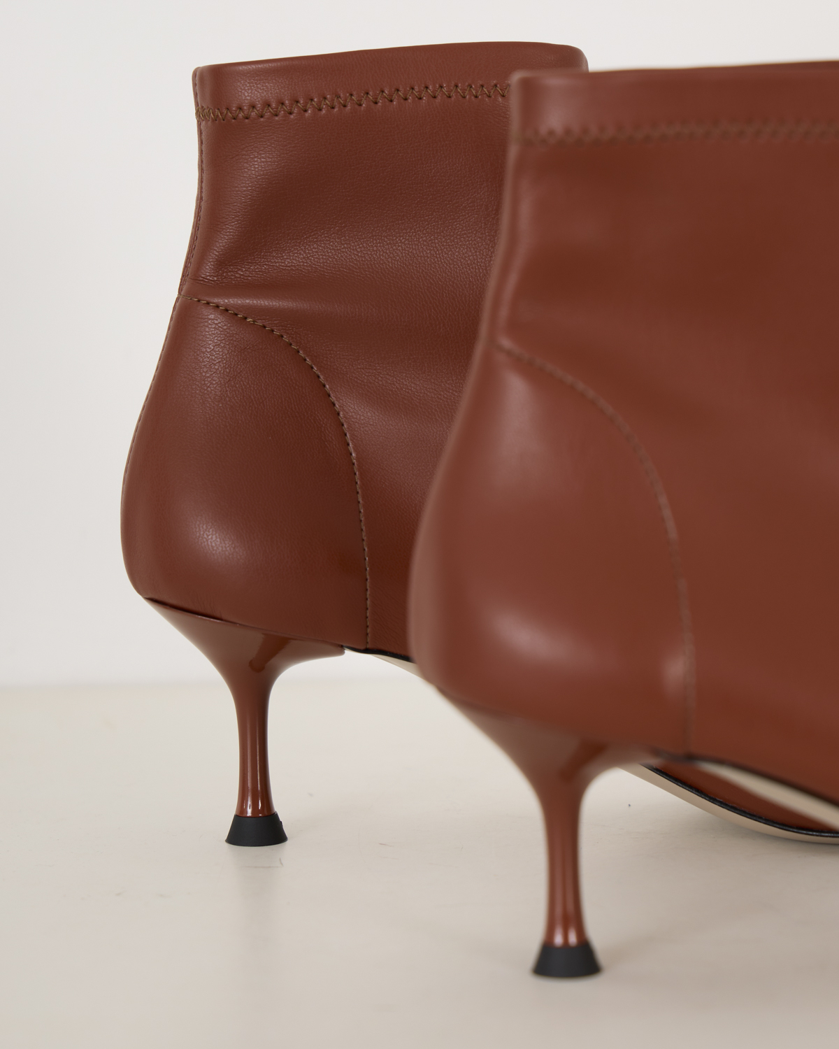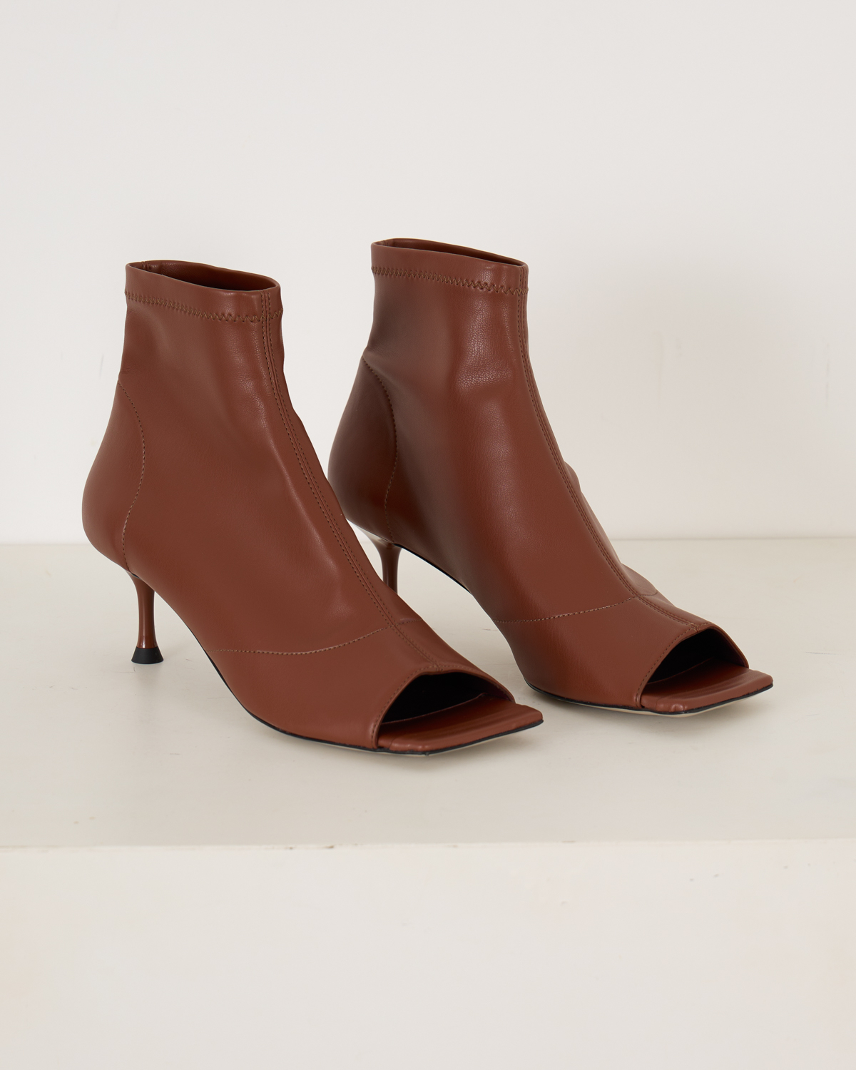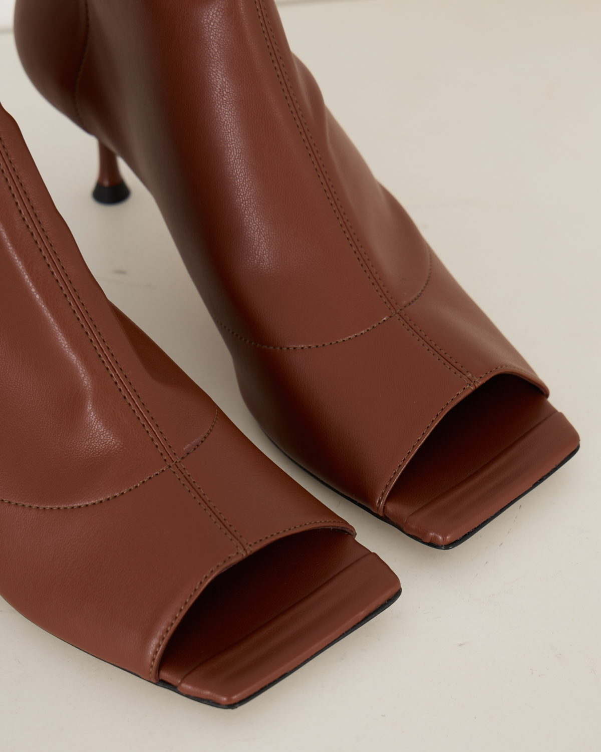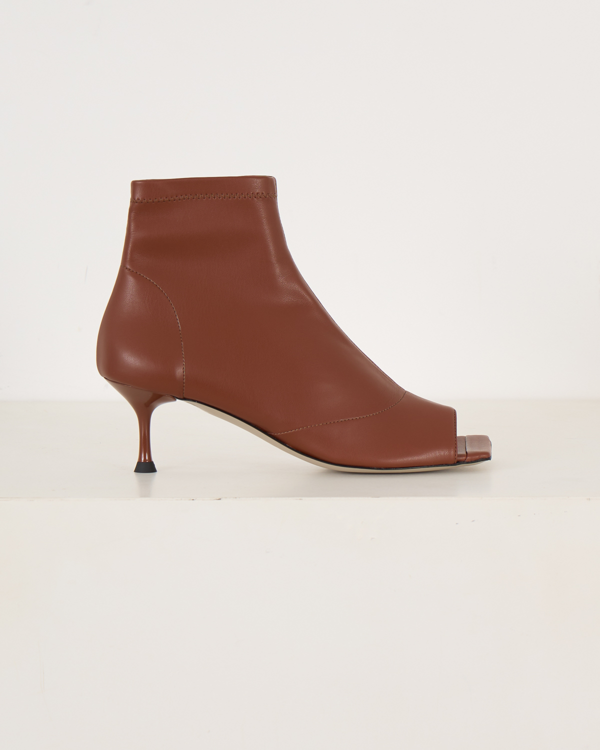 Sock Sandal van het merk Morobé. Het LUZ enkellaarsje is gemaakt van zacht ECO leer en uitgevoerd in het cognac. De schoen is afgewerkt met een vierkante neus en open teen. De hakhoogte is ca. 6 cm