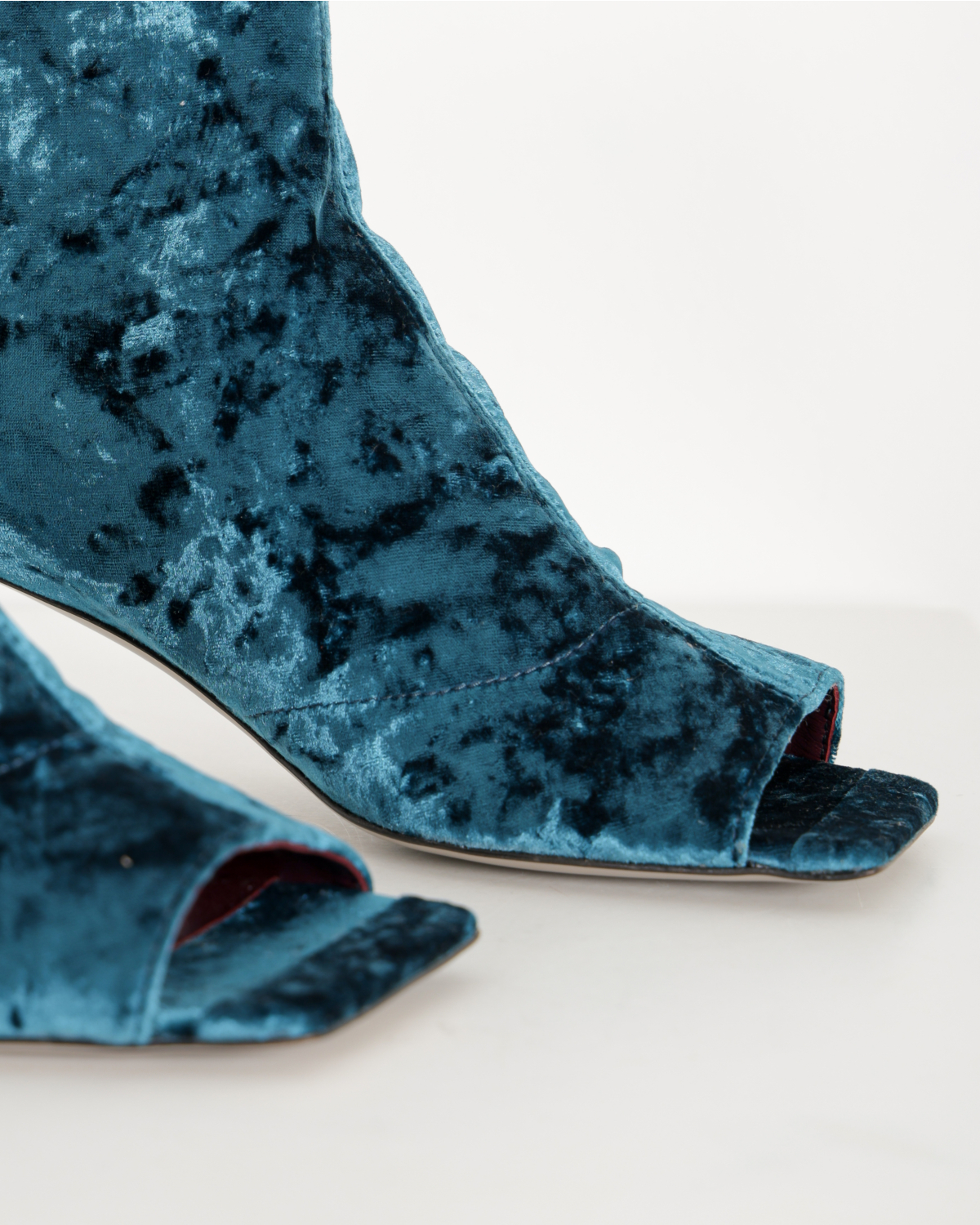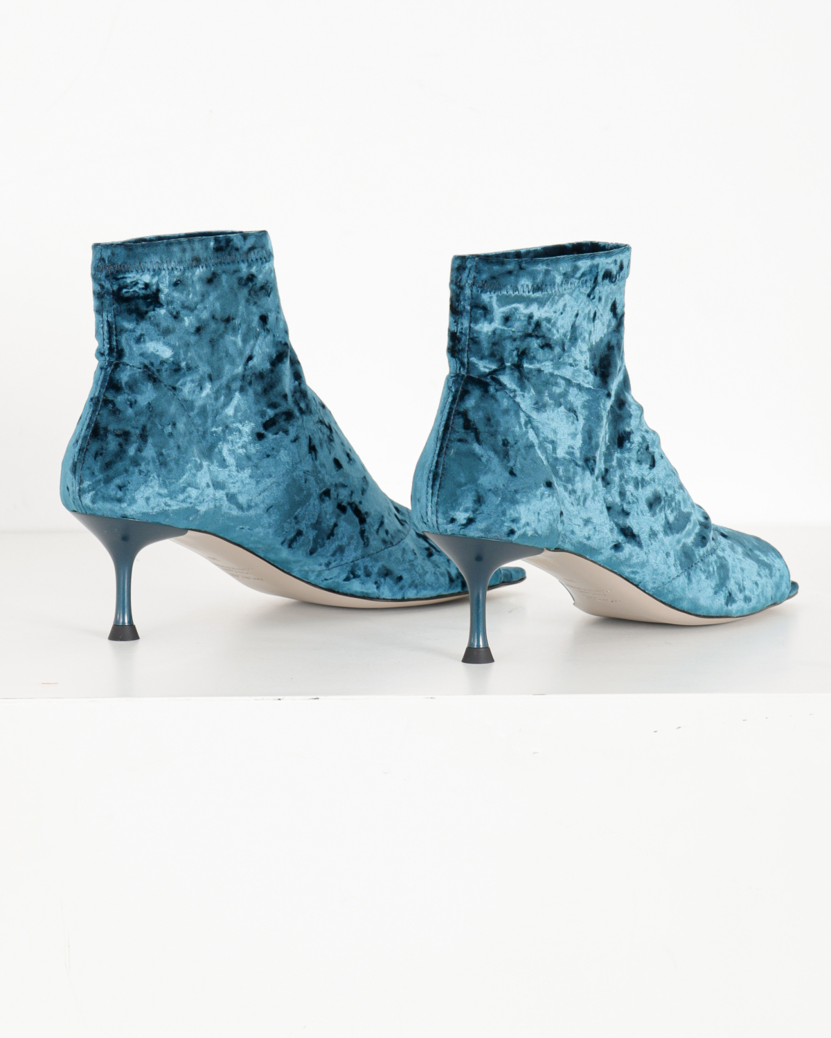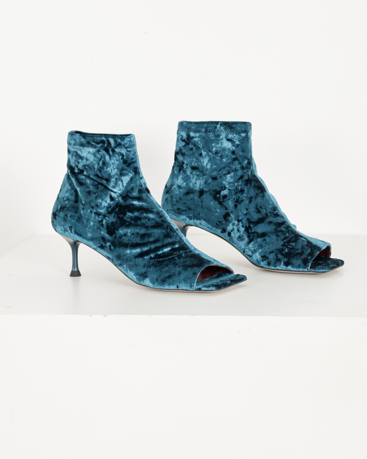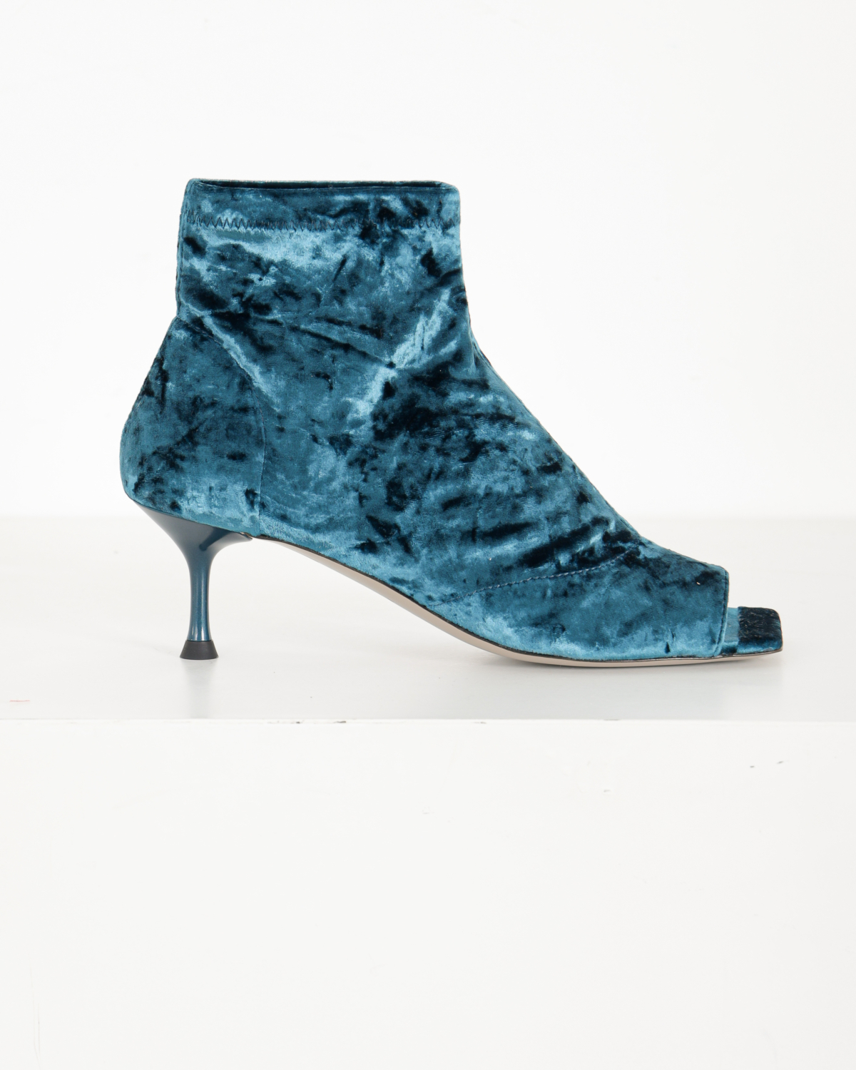 Sock Sandal van het merk Morobé. Het LUZ enkellaarsje is uitgevoerd in de kleur petrol en heeft een velours afwerking. De schoen is afgewerkt met een vierkante neus en open teen. De hakhoogte is ca. 6 cm