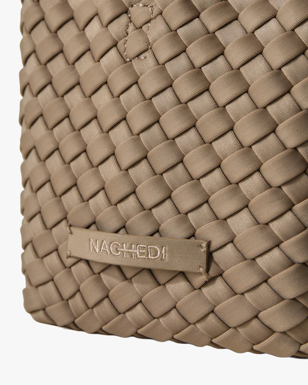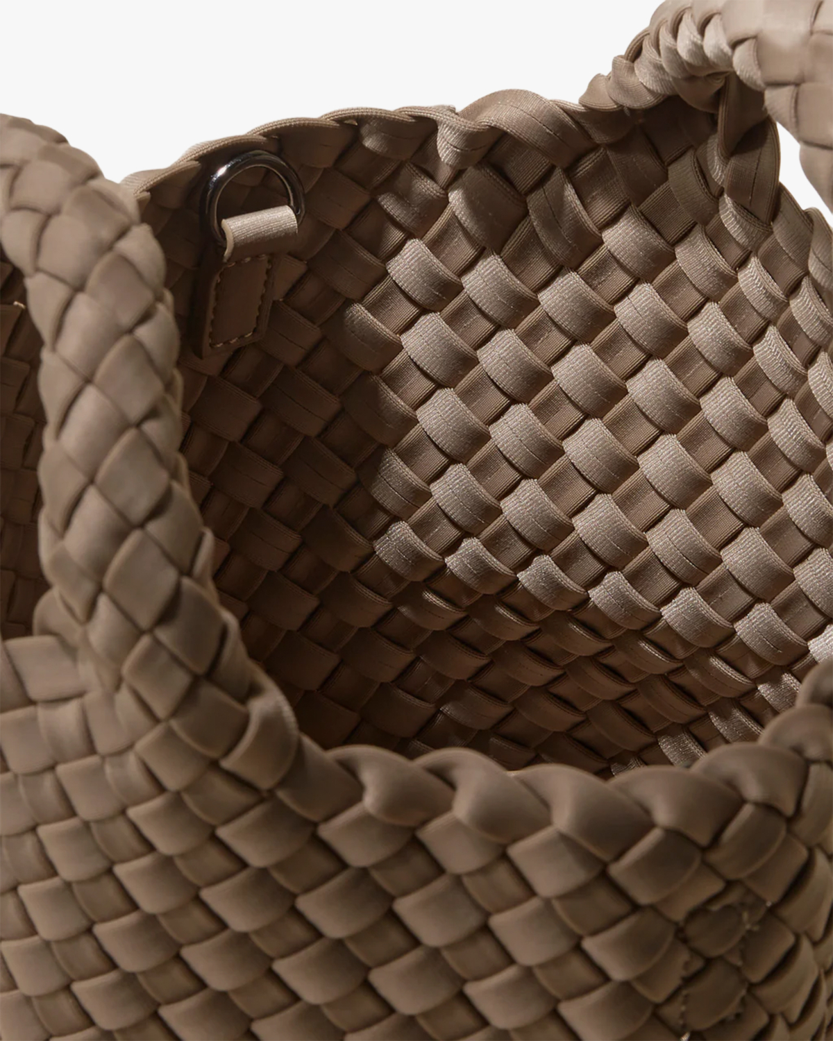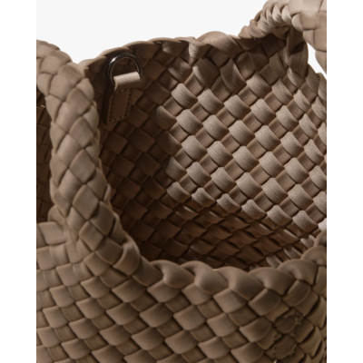 Deze beige cashmere tas combineert elegantie met een opvallend gevlochten design. Het neopreen materiaal zorgt voor een moderne twist, terwijl de handgevlochten hengsel en het geraffineerde weefpatroon kwaliteit uitstralen. De tas beschikt over een ritssluiting en een afneembare schouderband voor veelzijdig draagcomfort. Het Naghedi label benadrukt de verfijnde afwerking van dit St.Barth Petit Tas Cashmere model. Perfect voor dames kleding combinaties waarbij je opvalt met subtiele luxe. Combineer deze accessoire met een neutrale blazer en tailored pantalon voor een professionele uitstraling, of draag hem bij een casual ensemble van jeans en een kasjmier trui.