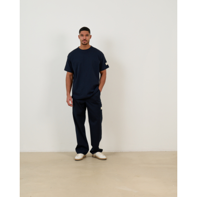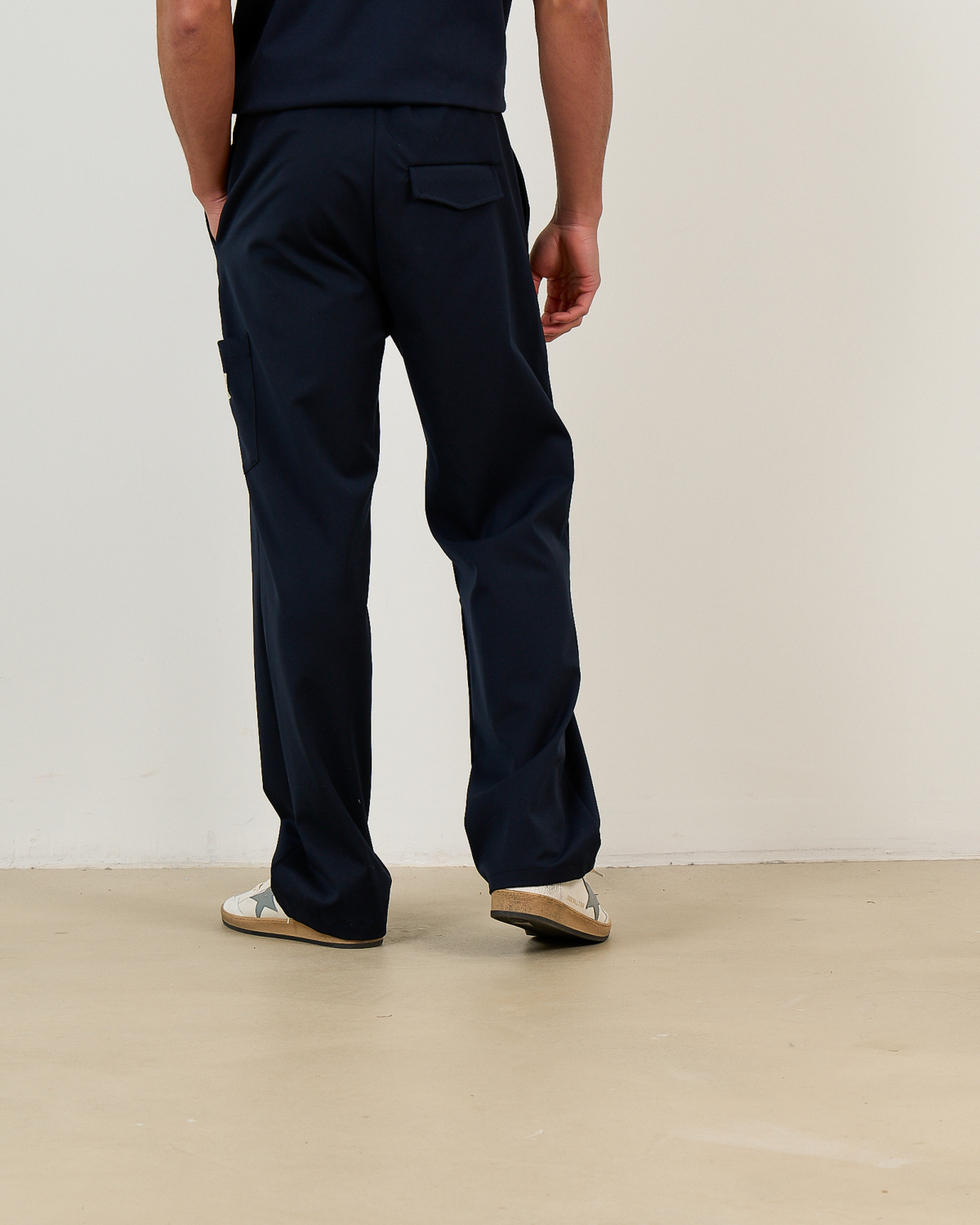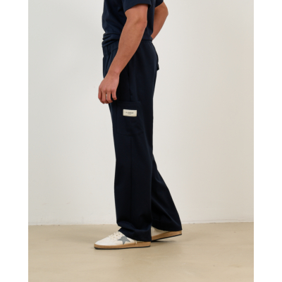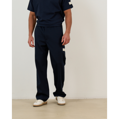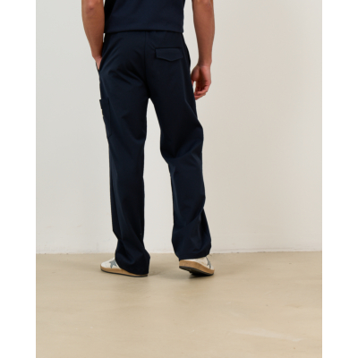 Deze marineblauwe tailored pantalon brengt verfijnde casual stijl met moderne details. De regular fit zorgt voor een relaxte pasvorm die comfortabel draagt. De mix van 64% polyester, 32% viscose en 6% lycra geeft de stof flexibiliteit en vormvastheid. De elastische tailleband en praktische zakken maken dit een veelzijdig kledingstuk. De eigentijdse straight-leg snit met iets wijdere pijpen creëert een moderne silhouet.