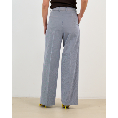 Deze gestreepte pantalon in wit en marine combineert een tijdloos dessin met een moderne wijde pasvorm. Het 100% katoenen materiaal zorgt voor optimaal draagcomfort, terwijl de regular fit een elegante silhouet creëert. De high waist en wijde pijpen geven dit Indress ontwerp een verfijnde uitstraling. De pantalon heeft praktische zakken en een knoopsluiting voor een klassieke afwerking.