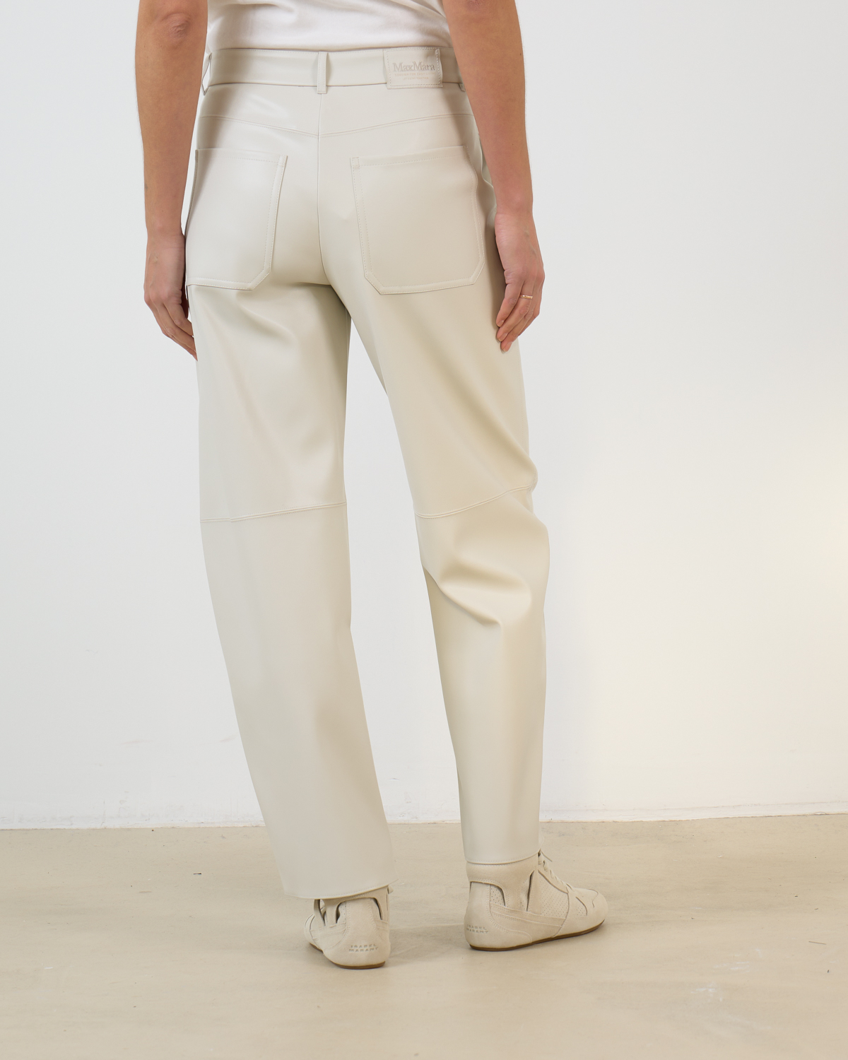 Deze gebroken witte barrel broek heeft een gecoate lederlook finish die zorgt voor een moderne uitstraling. De relaxed fit biedt veel draagcomfort en de rechte pijpen vallen elegant. Het item heeft een klassieke sluiting met ritsvoorsluiting en knoop aan de tailleband. De broek is vervaardigd uit 100% polyester met een polyurethaan coating die de karakteristieke leer-look creëert. Zakken aan voor- en achterzijde maken dit ontwerp compleet.