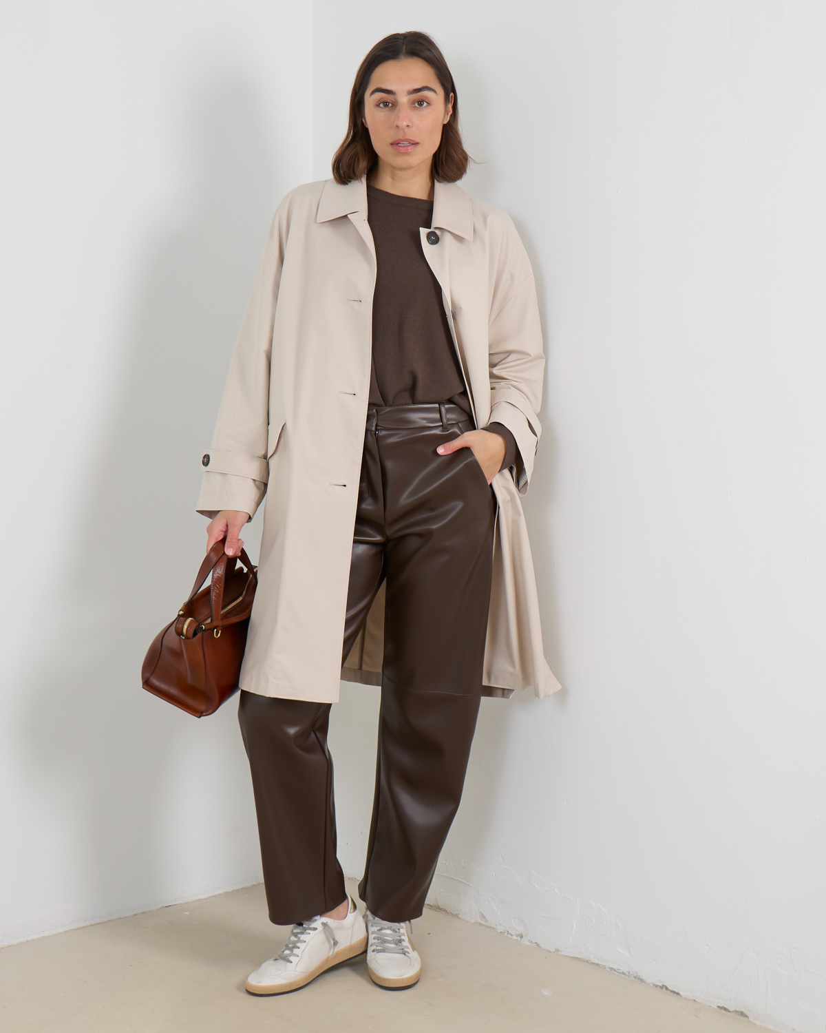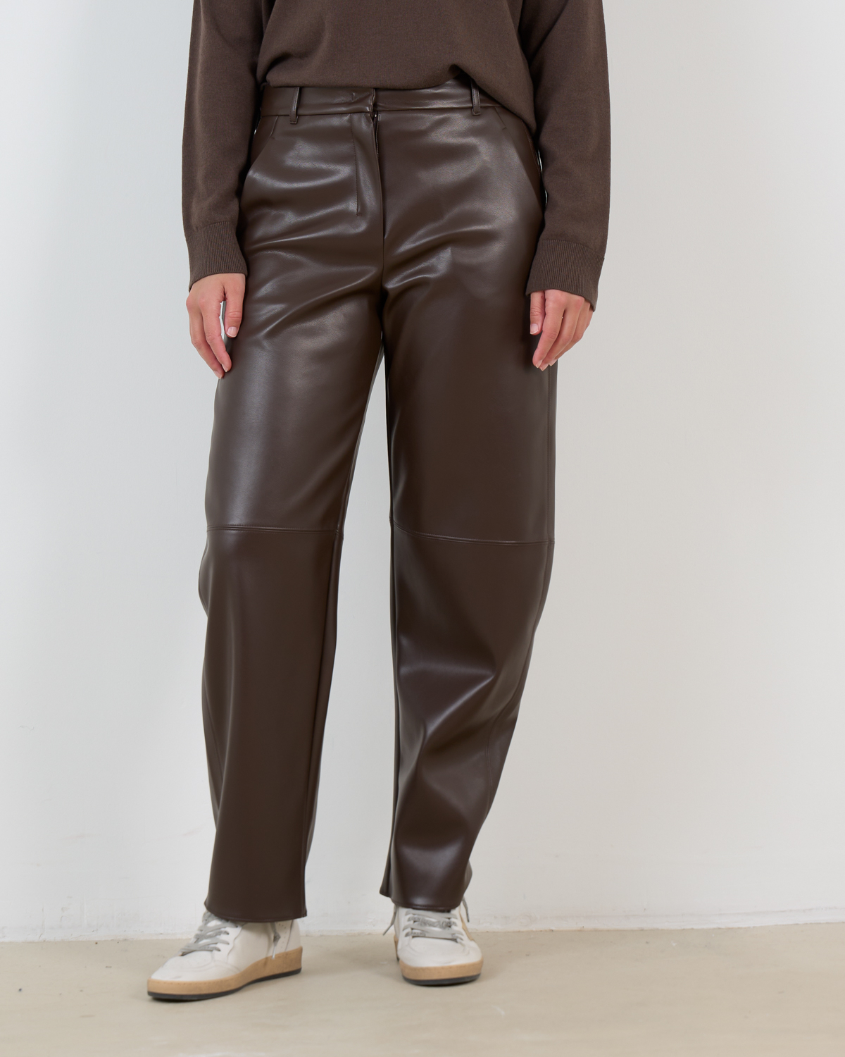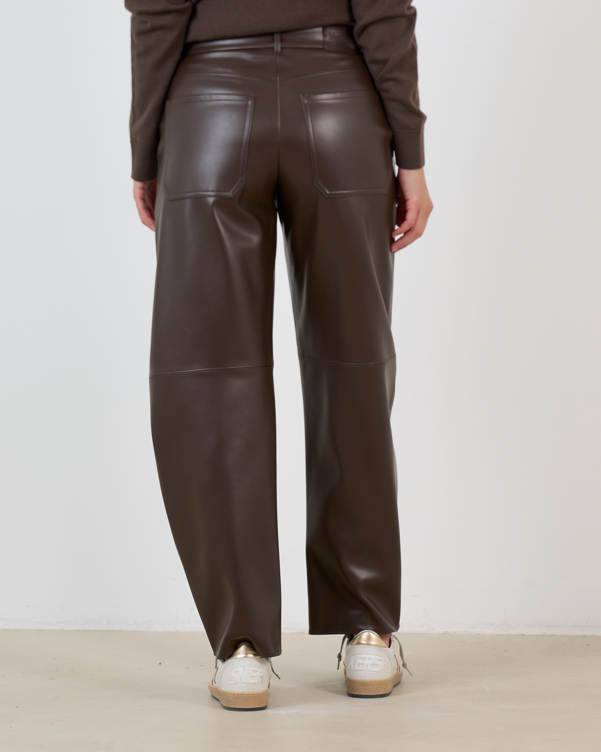 Deze donkerbruine broek van gecoat polyester combineert een trendy barrel-leg silhouet met moderne elegantie. Het gecoate materiaal zorgt voor een luxueuze leerachtige uitstraling, terwijl de wijde pasvorm comfort en stijl verenigt. De broek heeft een klassieke tailleband met riemlussen, steekzakken aan de voorzijde en opgestikte zakken aan de achterzijde. Het 100% polyester materiaal van 'S Max Mara biedt duurzame kwaliteit.