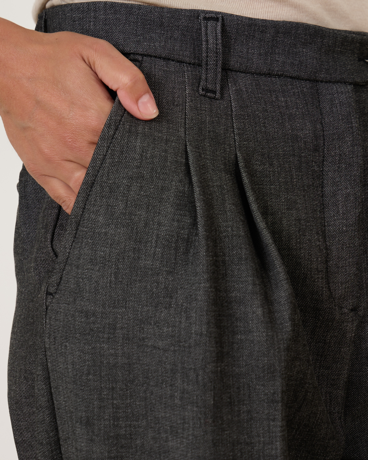 De Wanda Suit is een rechte broek met een hoge taille, verfijnde plooien en een aangesloten tailleband die zorgt voor een elegante pasvorm. Het ontwerp heeft een wijde pijp die het silhouet luchtig en modern maakt, terwijl de paspelzakken een klassieke, verzorgde afwerking bieden. Dankzij de lichte stretch in de stof combineert deze broek moeiteloos comfort met een perfect getailleerde look, ideaal voor zowel zakelijke als meer casual gelegenheden.