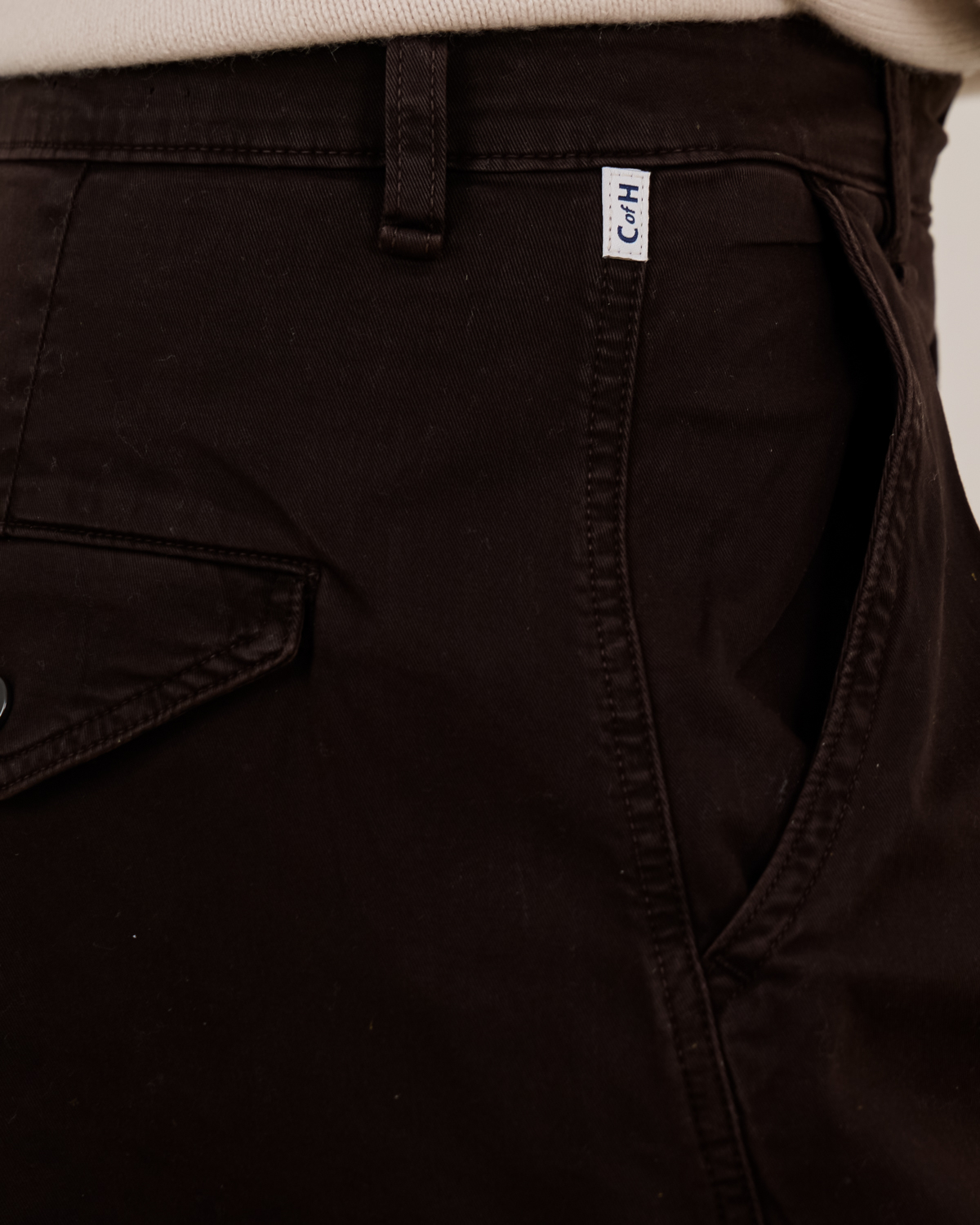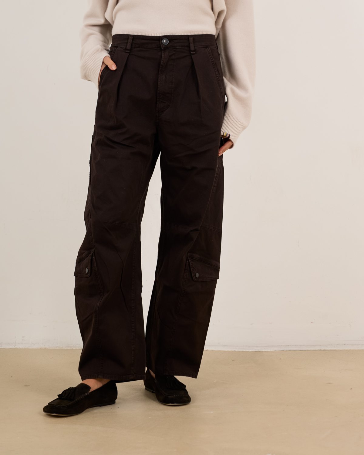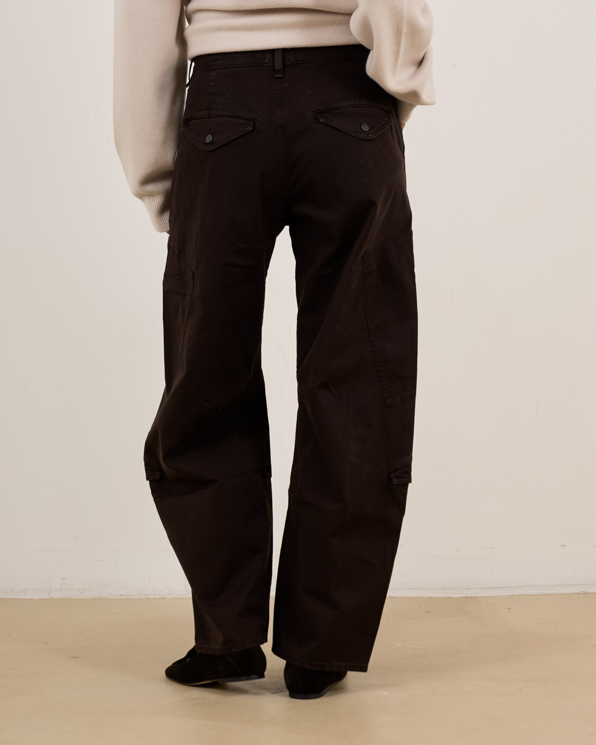 Deze donkerbruine cargobroek straalt stoere elegantie uit. De zachte katoenmix met 3% elastane zorgt voor optimaal bewegingscomfort en een perfecte pasvorm. De losvallende snit creëert een moderne, relaxte uitstraling, terwijl de knoopsluiting en karakteristieke cargozakken aan de zijkanten functionele details toevoegen. De rijke bruine kleurstelling maakt dit Citizens of Humanity ontwerp tot een veelzijdig basisstuk.