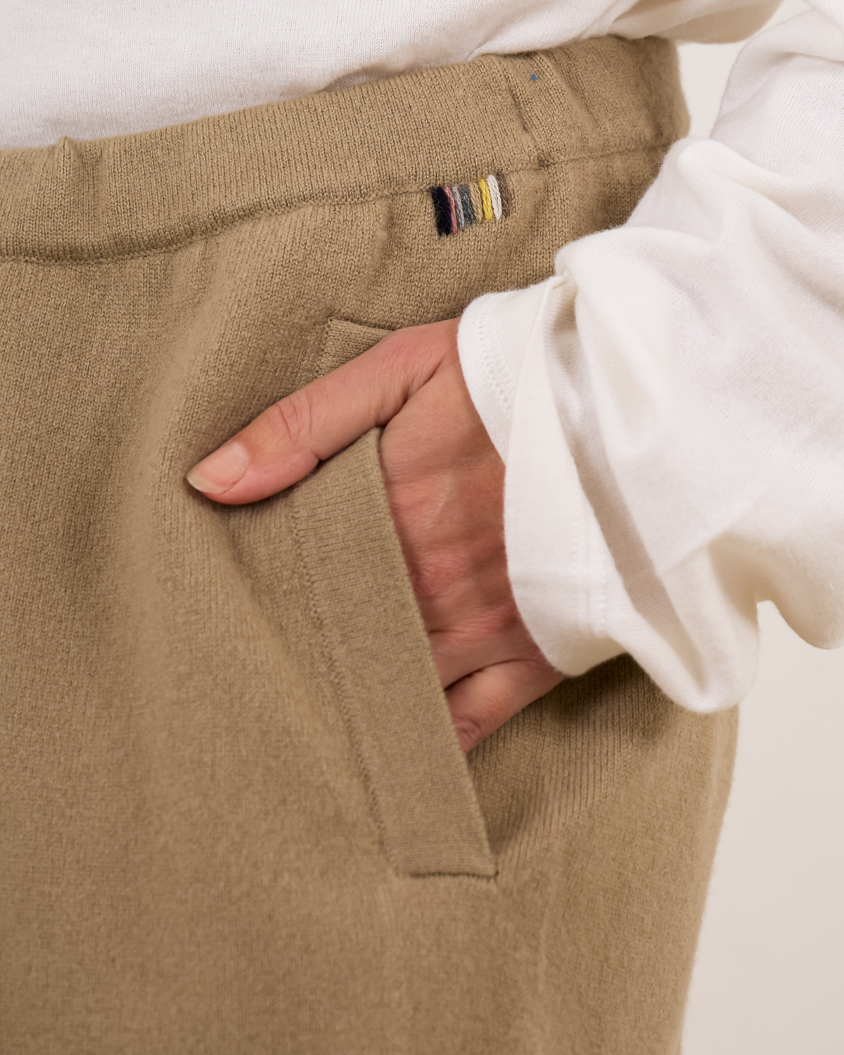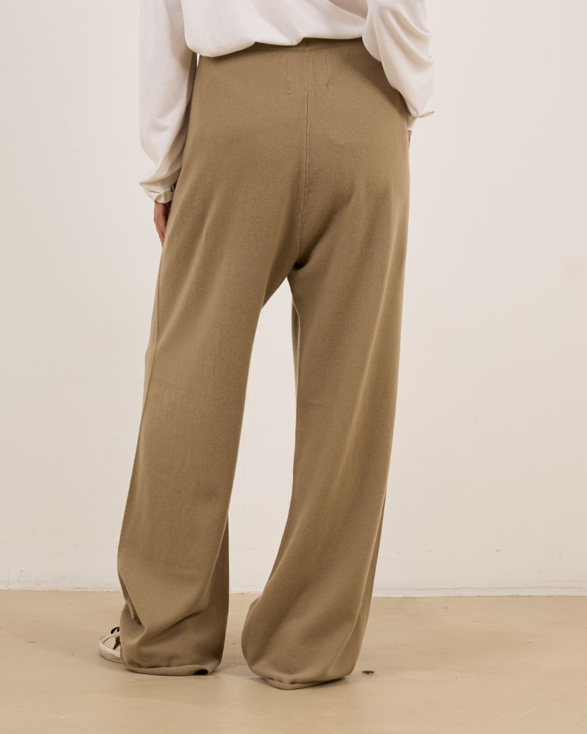 Deze slouch pantalon in taupe straalt pure luxe uit. De zachte cashmere mix van 88% cashmere, 10% nylon en 2% elastane biedt ongeëvenaard draagcomfort en elegantie. De losvallende pasvorm met trekkoord zorgt voor een moderne, relaxte uitstraling. Steekzakken bieden praktische functionaliteit, terwijl de wijde pijpen zorgen voor een verfijnde silhouet dat comfort en stijl perfect combineert.