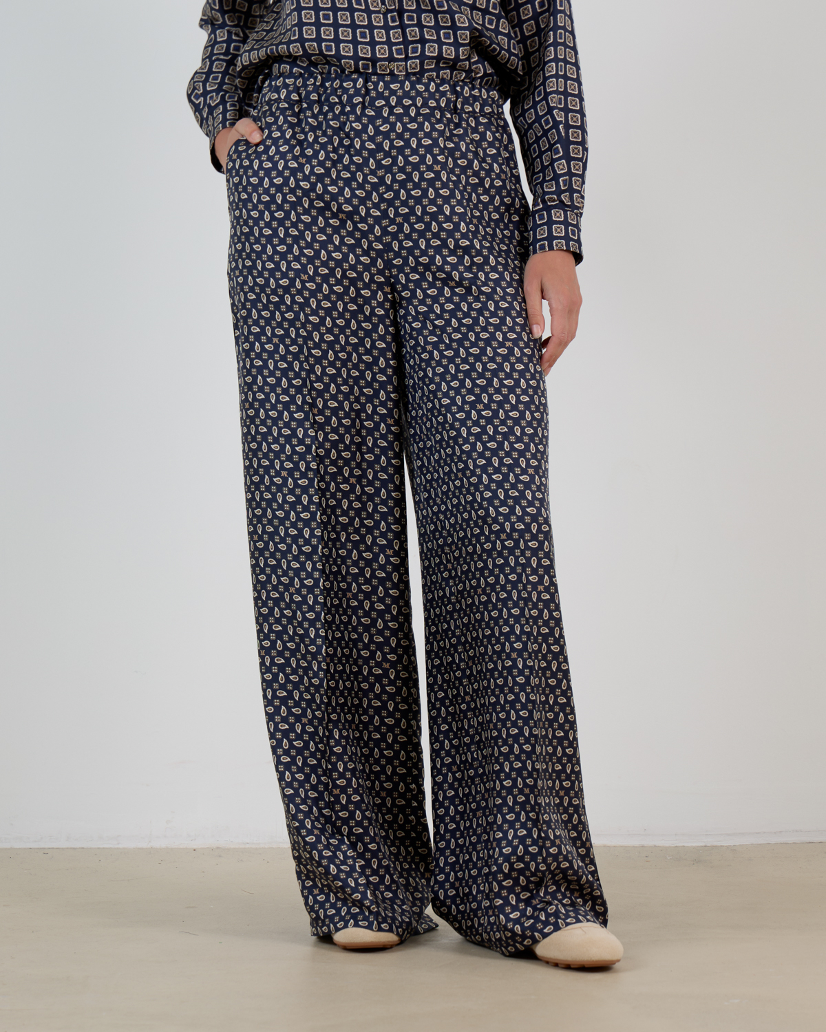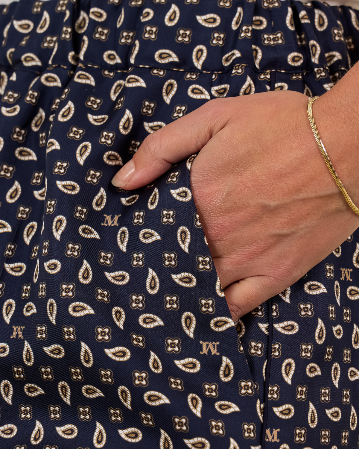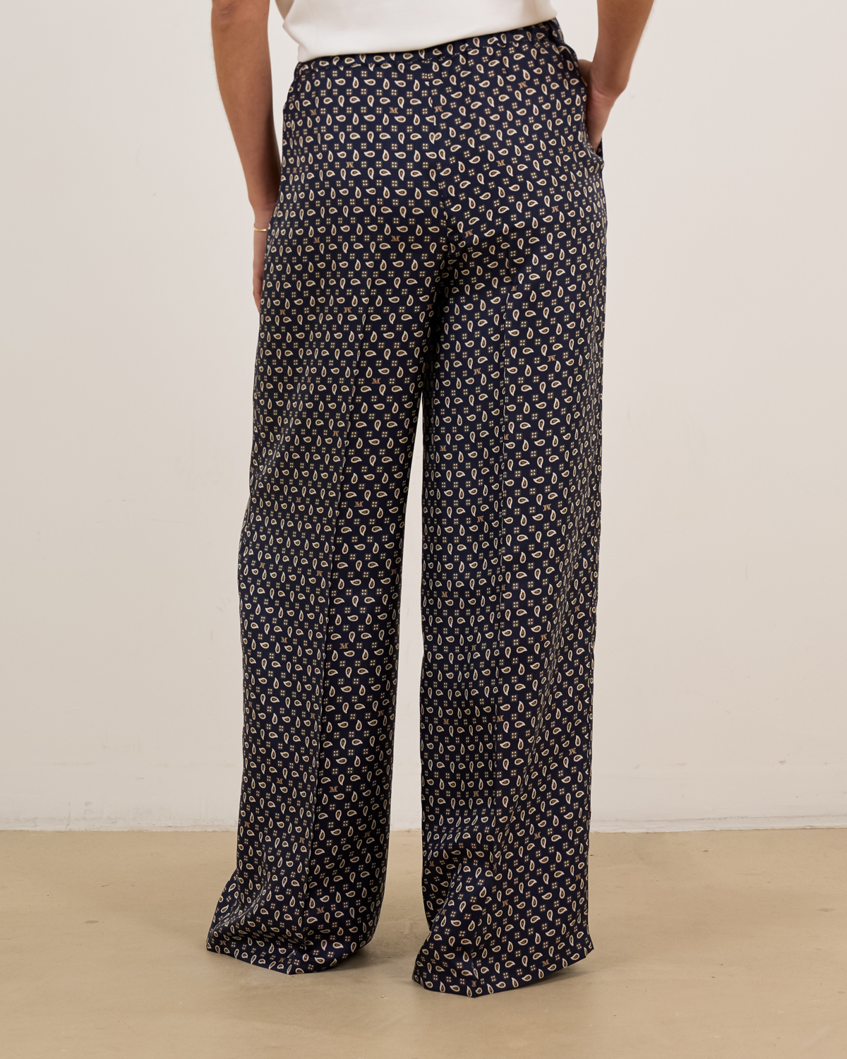 Deze ultramarijn zijden broek toont een verfijnd paisley patroon in crème en beige tinten. De luxe 100% zijden kwaliteit valt soepel en luchtig om je lichaam. De losvallende pasvorm met wijde pijpen creëert een elegante silhouet, terwijl de hoge taille zorgt voor een flatterende lijn. Praktische steekzakken aan de zijkant maken deze broek even functioneel als stijlvol.