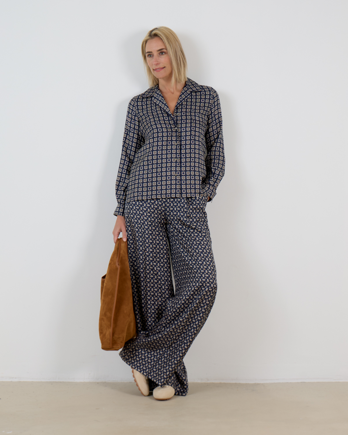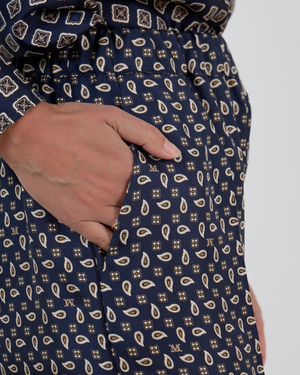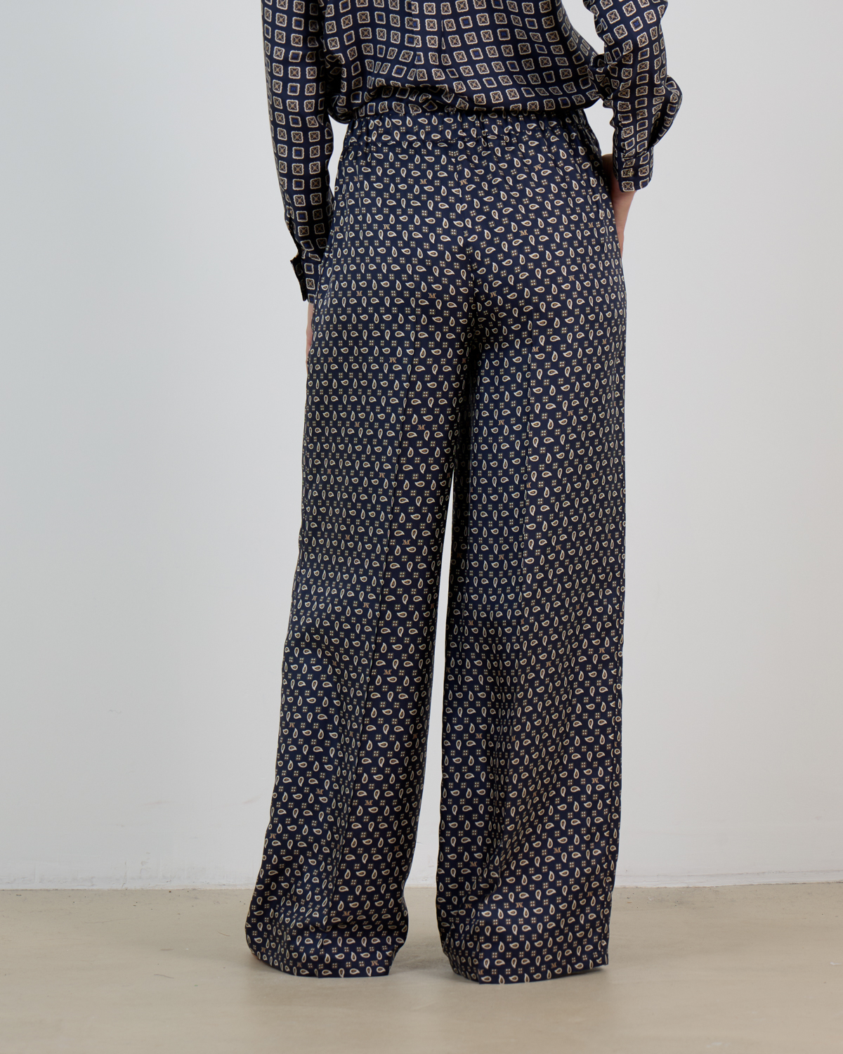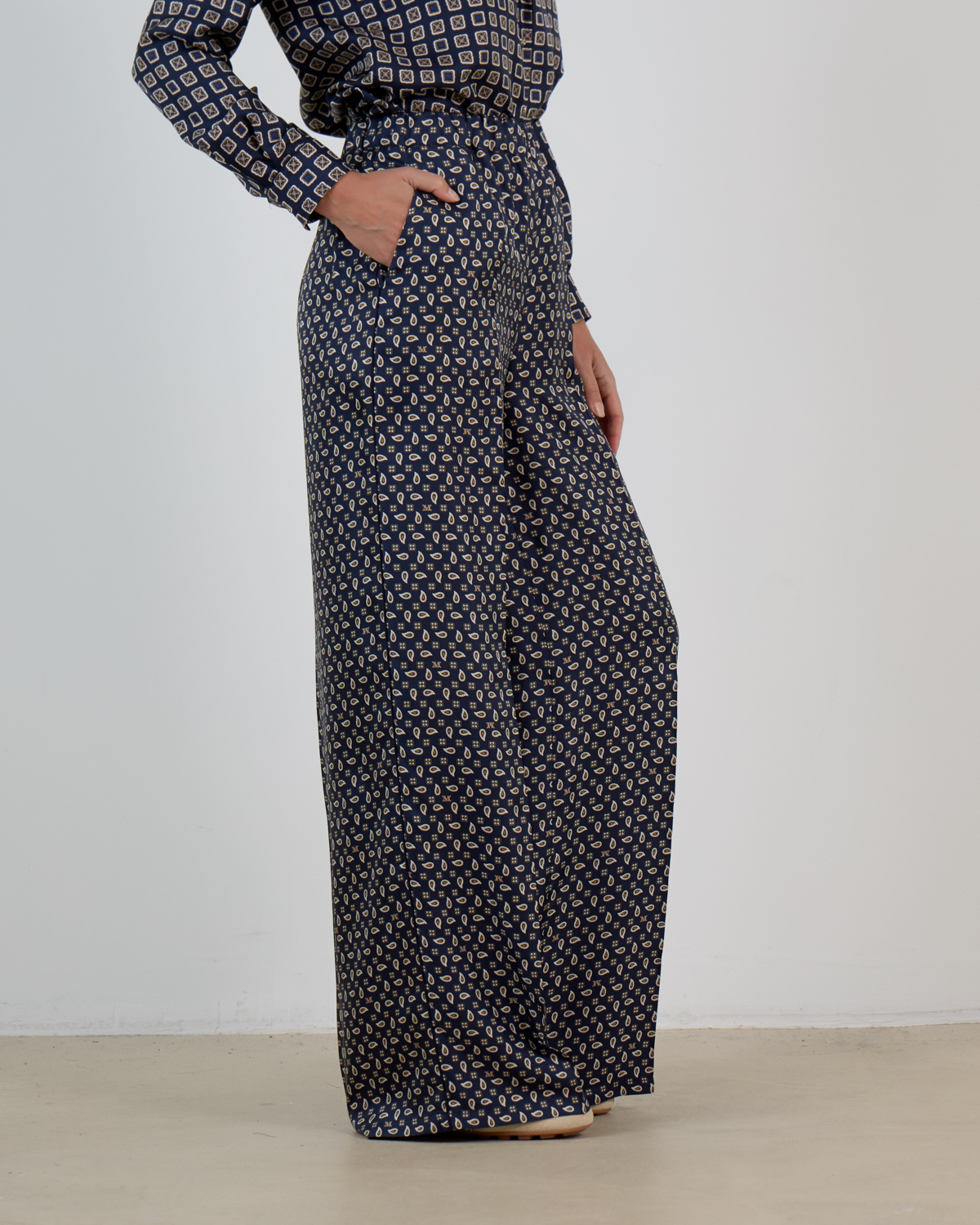 Deze ultramarijn zijden broek toont een verfijnd paisley patroon in crème en beige tinten. De luxe 100% zijden kwaliteit valt soepel en luchtig om je lichaam. De losvallende pasvorm met wijde pijpen creëert een elegante silhouet, terwijl de hoge taille zorgt voor een flatterende lijn. Praktische steekzakken aan de zijkant maken deze broek even functioneel als stijlvol.