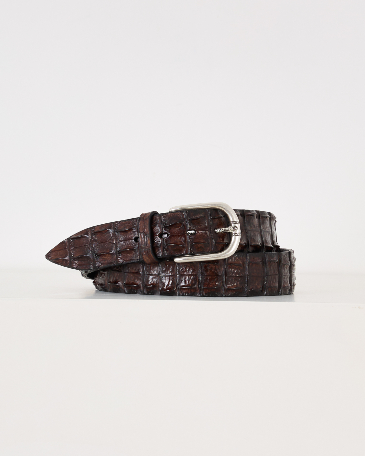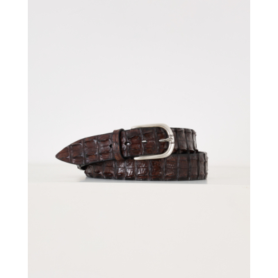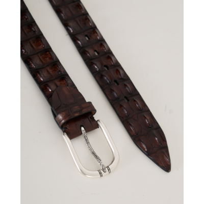 Deze verfijnde bruine riem toont een opvallende crocodilenprint die klassieke stijl met moderne uitstraling combineert. Het leer voelt stevig aan en behoudt zijn vorm door de hoogwaardige verwerking. De zilveren gesp met subtiele textuurdetails vormt een elegante afwerking die past bij verschillende outfits. Van Paolo Vitale krijg je een accessoire dat zowel bij zakelijke kostuums als bij casual chino's en overhemden perfect combineert. De rijke bruintinten maken hem veelzijdig genoeg voor verschillende kledingstijlen.