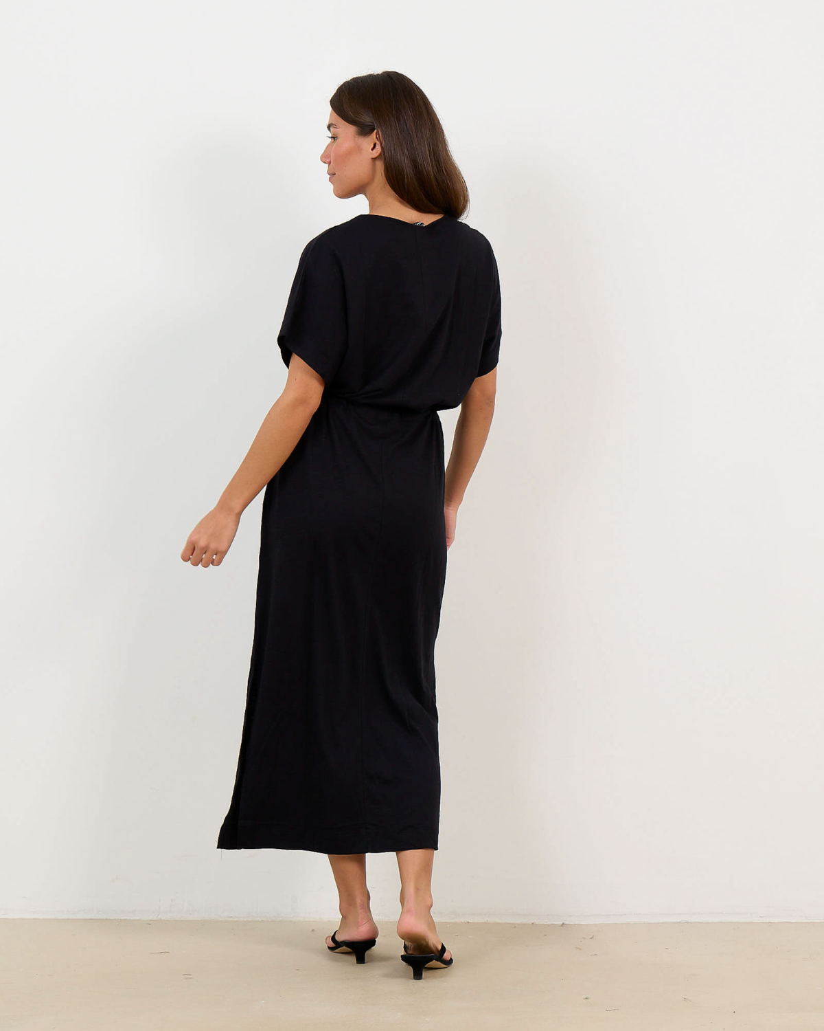 Combineer deze zwarte midi jurk van Penn&Ink met witte sneakers voor een relaxte dagoutfit. Voor een elegantere look draag je de jurk met hakken en statement sieraden. Een denim jasje of leren jas voltooit je styling perfect.