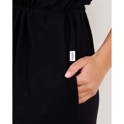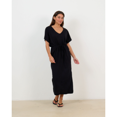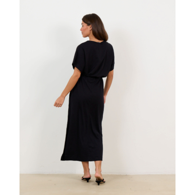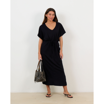 Deze zwarte midi jurk in relaxed fit biedt je een moderne en elegante uitstraling. De jurk is vervaardigd uit 100% katoen en heeft een flatterende V-hals met korte mouwen. Het verstelbare trekkoord in de taille zorgt voor een perfecte pasvorm. Het subtiele gemêleerde dessin geeft deze zwarte jurk extra texture en diepte. De midi lengte maakt dit een veelzijdige keuze voor verschillende gelegenheden.