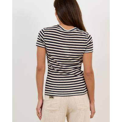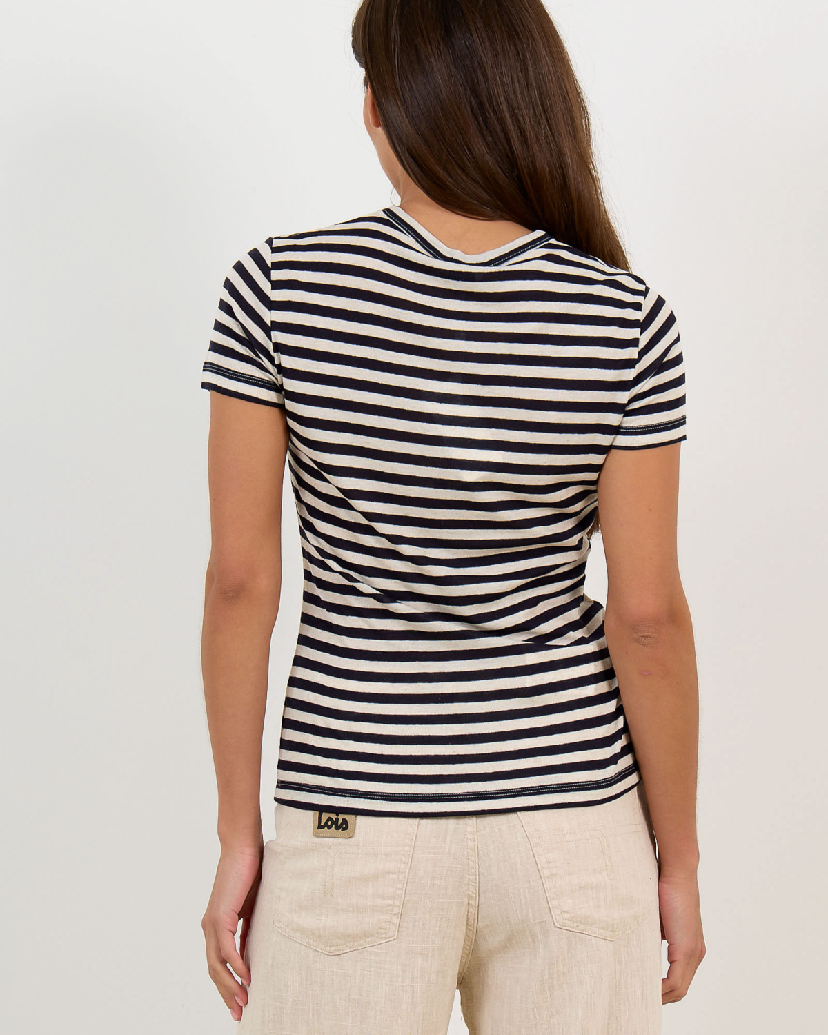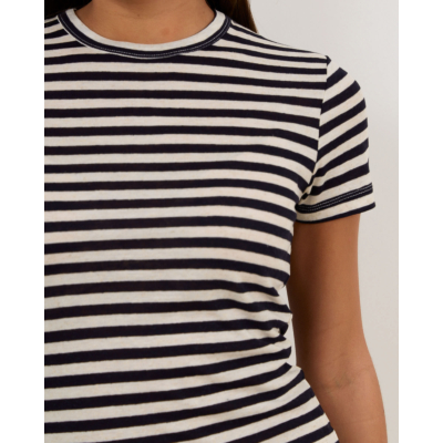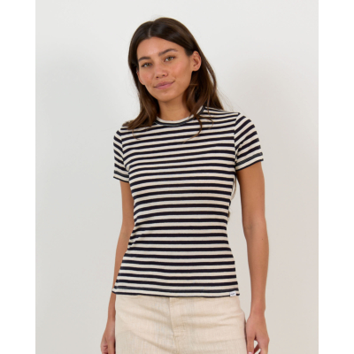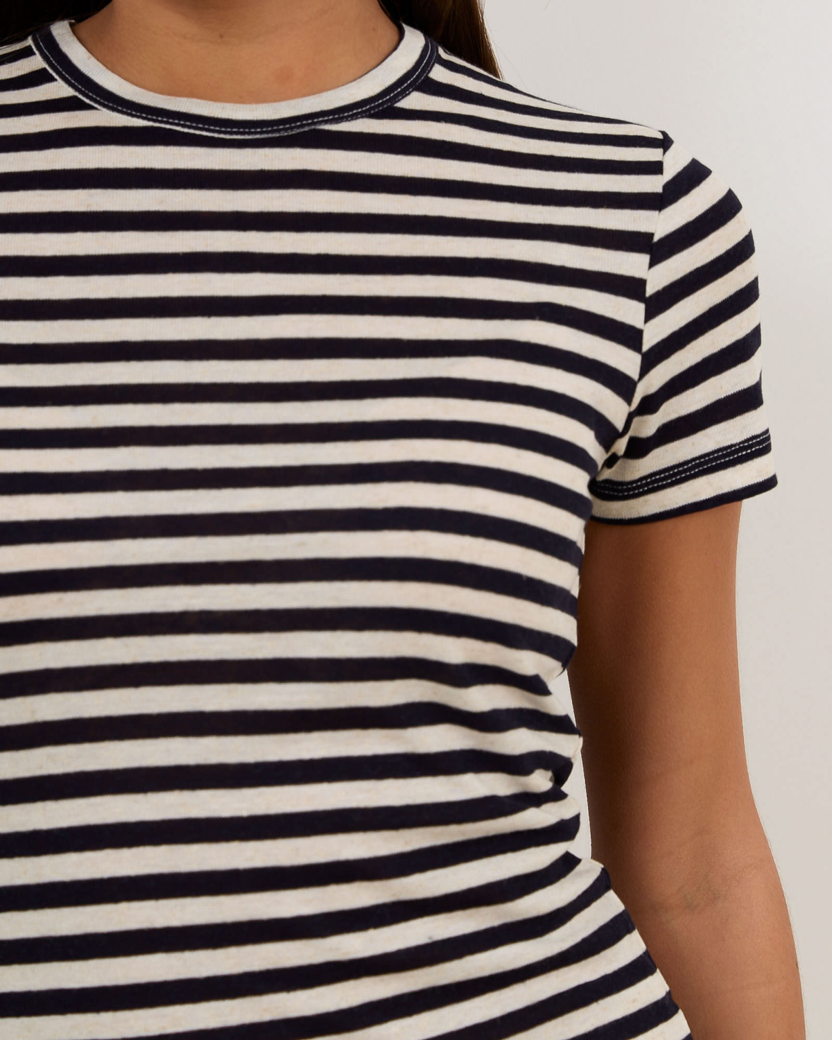 Dit gestreepte t-shirt in navy en ecru kleuren brengt tijdloze elegantie naar je garderobe. De kwaliteitsvolle mix van 70% katoen en 30% linnen zorgt voor optimaal draagcomfort en een natuurlijke, ademende pasvorm. Met korte mouwen, ronde hals en regular fit snit valt dit shirt perfect. Het klassieke streepdessin geeft karakter, terwijl de zichtbare contrastnaden een modern accent toevoegen.