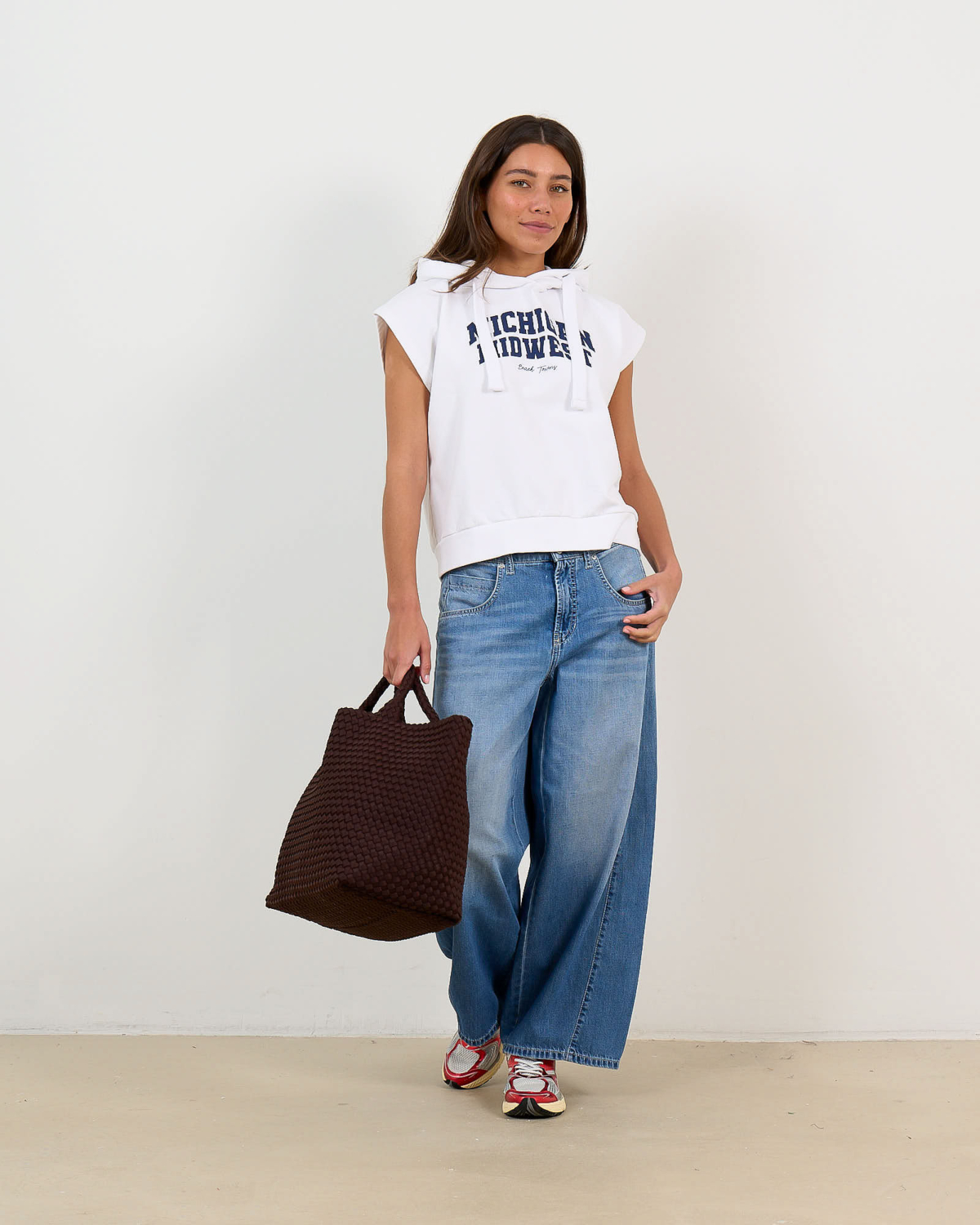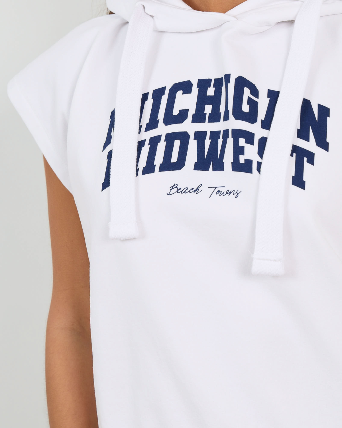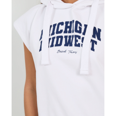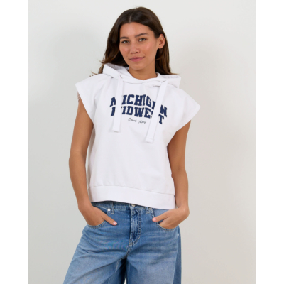Deze witte mouwloze hoody sweater straalt casual elegantie uit met een moderne twist. De capuchon met trekkoorden en de opvallende navy tekst "Michigan Midwest Beach Towns" geven het item een sportief karakter. Het zachte katoenmix materiaal (95% katoen, 5% elastaan) zorgt voor optimaal draagcomfort en bewegingsvrijheid. De relaxed fit pasvorm biedt een comfortabele, ontspannen uitstraling die perfect past bij de eigentijdse casual trend.