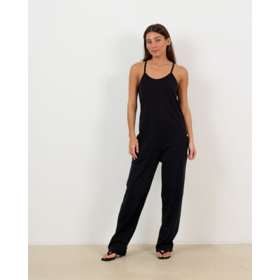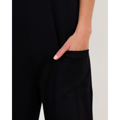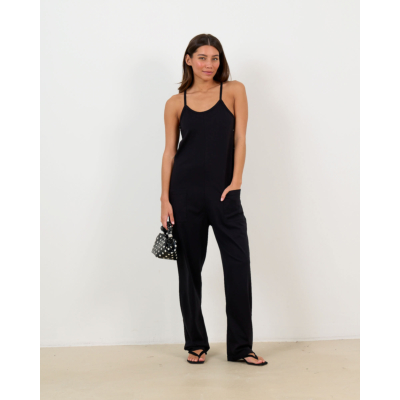 Deze elegante zwarte jumpsuit straalt tijdloze verfijning uit. De dunne spaghettibandje en ronde halslijn zorgen voor een vrouwelijke uitstraling. De relaxed fit van 100% katoen biedt optimaal draagcomfort en beweegsvrijheid. De wijde pijpen geven het silhouet een moderne twist, terwijl de praktische steekzakken functionaliteit toevoegen. Het zachte katoenen materiaal maakt deze jumpsuit geschikt voor lange dagen.